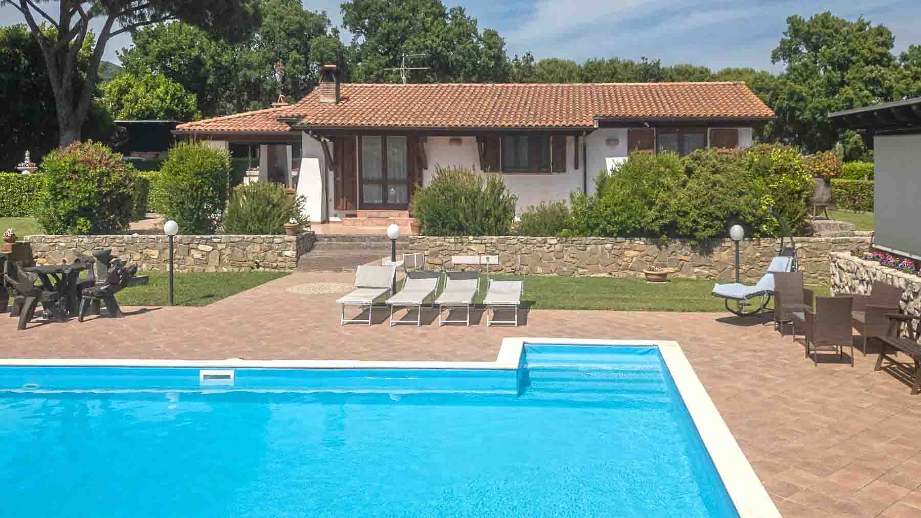 Tucked away amidst the serene greenery of Castiglione della Pescaia, this exquisite property is a sanctuary of elegance and tranquility. As you approach, the gentle rustle of leaves and the soft chirping of birds create a symphony that invites you into a world of peace. The scent of blooming flowers mingles with the crisp, fresh air, painting a picturesque setting. Spanning an impressive 280 square meters, this luxurious residence offers six beautifully appointed rooms and four opulent bathrooms. The light-colored exterior and gabled roof exude charm, while the covered porch provides a welcoming entrance. The property is a haven for nature lovers, featuring a private garden where meticulously maintained hedges and lush grass create an oasis of calm. The centerpiece is a stunning private pool, perfect for refreshing swims on warm days. Additional features include a garage or carport and a charming stone barbecue area, ideal for entertaining. Located in the idyllic countryside of Grosseto, this home embodies the essence of relaxed, luxurious living. Imagine waking up to the gentle warmth of the sun streaming through your windows, and stepping outside to sip your morning coffee amid the tranquil surroundings. Afternoons can be spent lounging by the pool, with the scent of the garden enveloping you. As evening falls, the porch becomes a perfect spot to unwind, as the sky transforms into a canvas of colors, offering a spectacle that captivates the senses. This residence is a true jewel in the luxury real estate market, offering a harmonious blend of classic charm and modern amenities. It stands as a testament to refined living, promising an unmatched lifestyle experience.