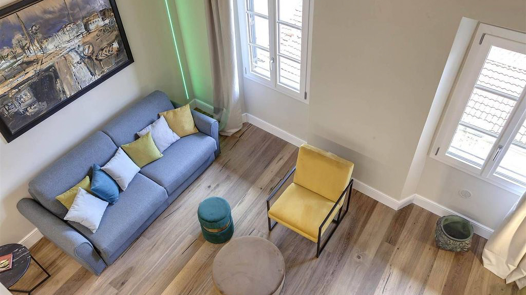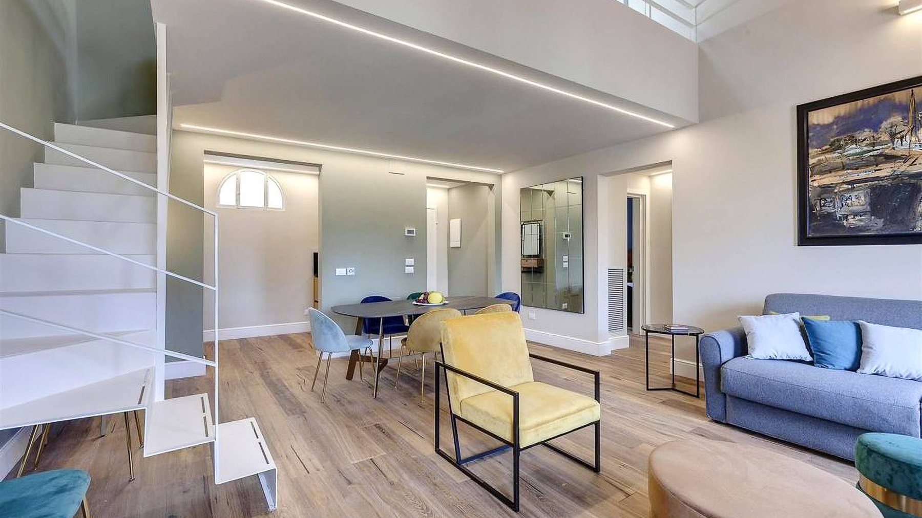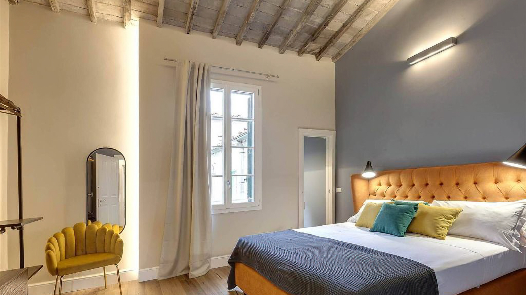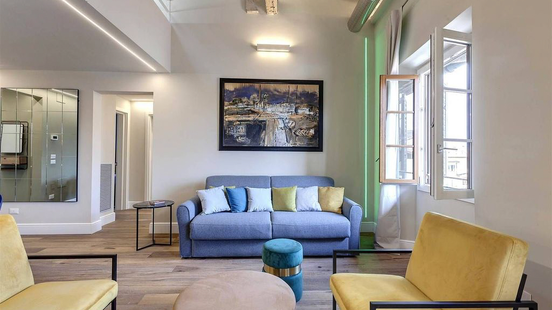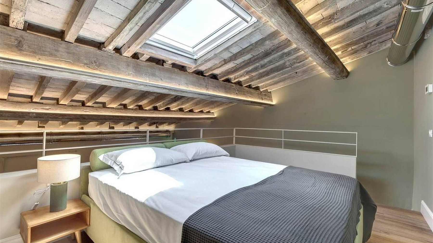Tucked away in the vibrant heart of Florence, this residence is a sanctuary of elegance and comfort. As sunlight filters through sheer curtains, illuminating the tastefully decorated interiors, one can almost hear the gentle hum of the city mingling with the peaceful atmosphere of this exquisite home. Spanning 110 square meters, this stunning property boasts five beautifully appointed rooms and three luxurious bathrooms, perfect for a sophisticated urban lifestyle. Every corner of this home is a testament to refined taste, from the tufted orange headboard in the serene bedroom to the exposed beams that add a rustic touch to the modern decor. The open living area, with its gray sofa and stylish dining setup, invites relaxation and social gatherings. A staircase leads to the upper level, promising more breathtaking spaces, all set against the backdrop of Florence's historic allure. Living in this property means experiencing the essence of Florence—a city where art and history meet contemporary charm. Imagine unwinding in the chic shell-designed chair, sipping a glass of Chianti as the golden hues of the sunset pour in, casting a warm glow over the wooden floors. This residence is not just a home but a statement of prestige and sophistication. It offers a rare opportunity to own a piece of luxury in one of the world’s most enchanting cities.