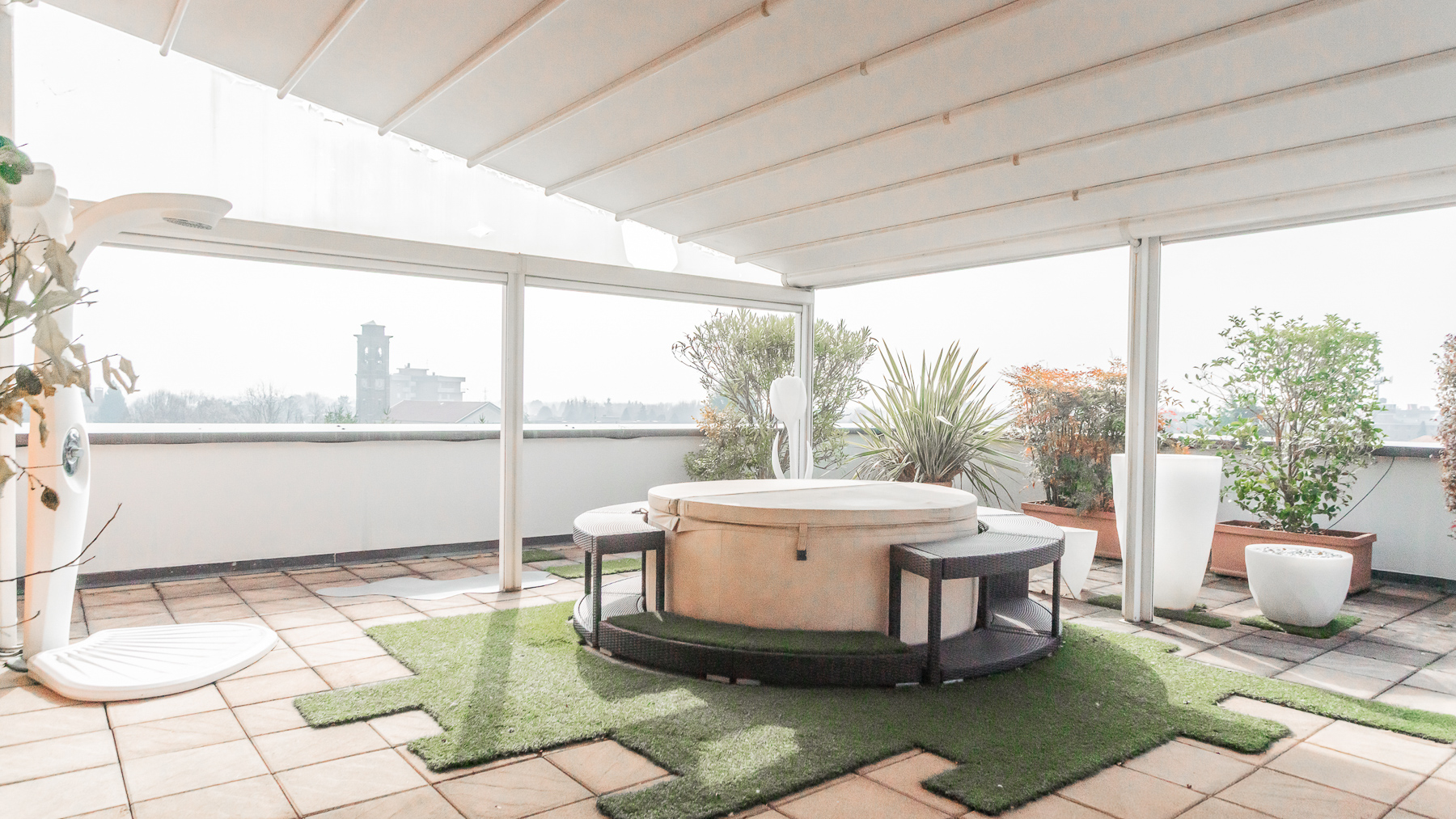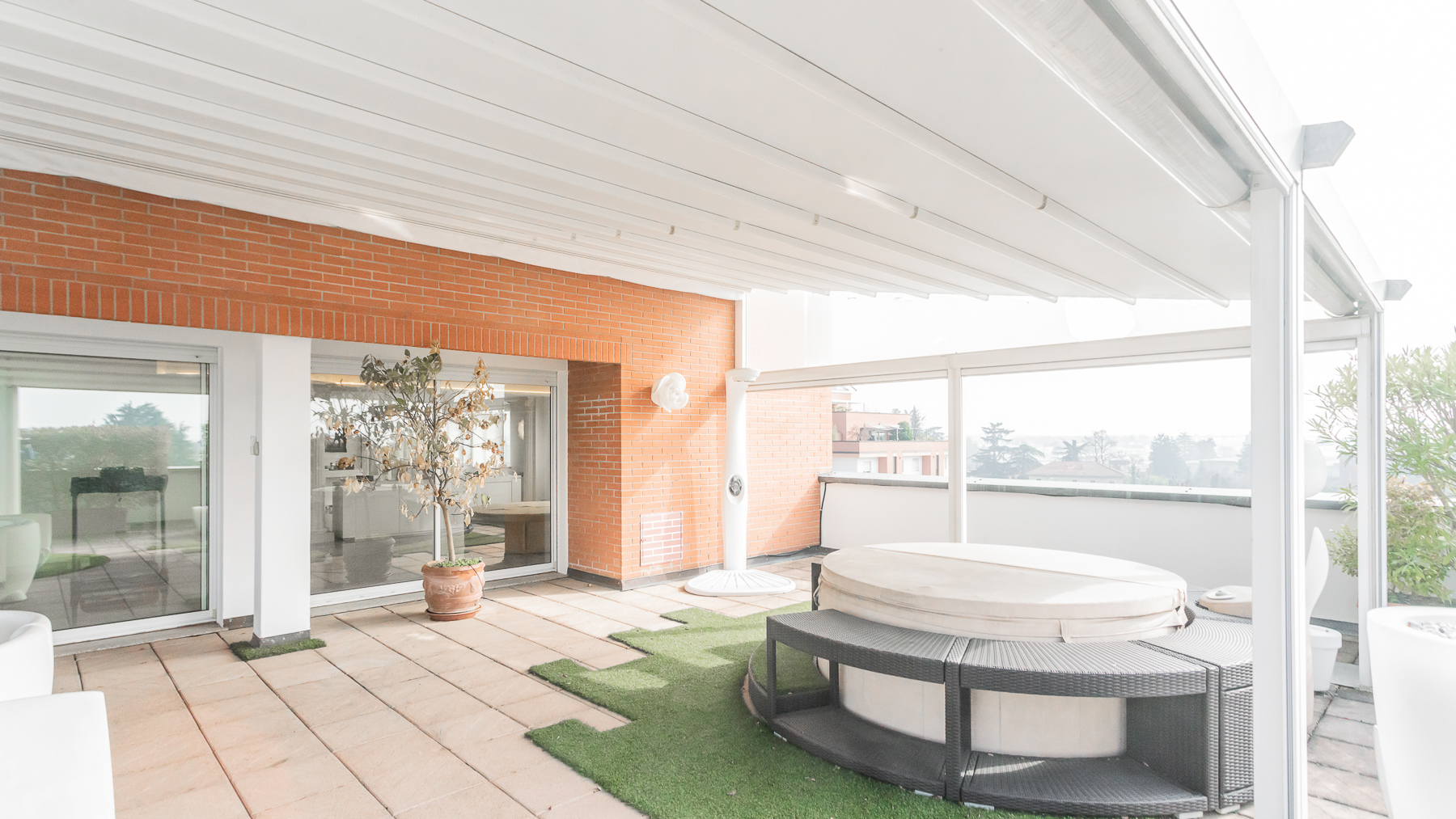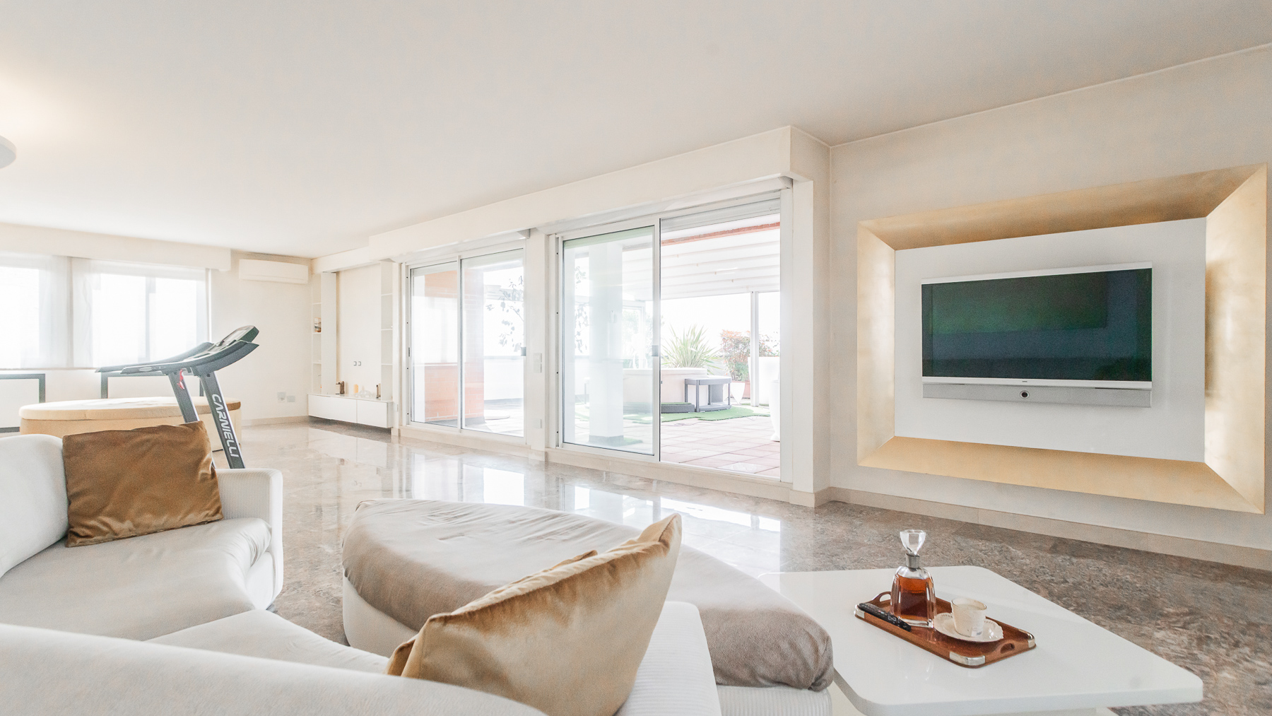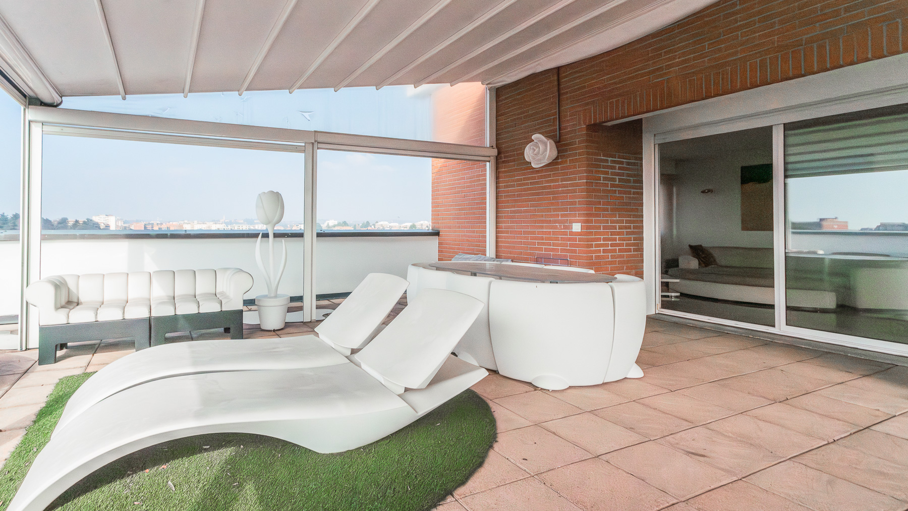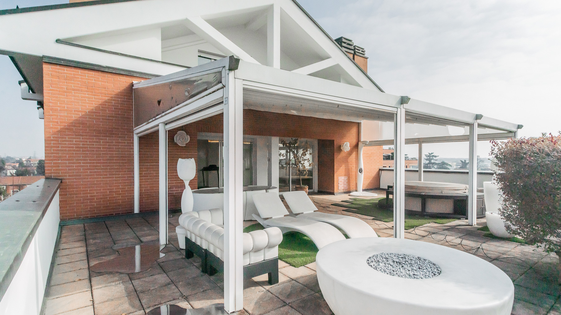 Imagine stepping into a sanctuary of modern elegance, where sunlight dances through expansive glass doors, illuminating a realm of luxury and tranquility. The gentle hum of city life fades away as you relax on the plush, light-colored sofa, enveloped by the warmth of exposed brick walls and the allure of contemporary design. This exquisite 400 sqm property in Gallarate, Varese, offers a refined living experience with eight spacious rooms and three elegant bathrooms. The open concept living area seamlessly integrates with the outdoors, where a private pool and terrace invite moments of leisure and sophistication. The minimalist aesthetic, highlighted by a treadmill and a wall-mounted television, speaks to a lifestyle of health and relaxation, while the sleek terrace provides an enchanting view of the surroundings, blending urban vibrance with serene privacy. Living here is an invitation to embrace a life of refined elegance and unparalleled comfort. Picture yourself unwinding on white lounge chairs, surrounded by stylish plant sculptures, as the tranquil ambiance of the city envelops you. Savor alfresco dining on the terrace, where the evening sky becomes a canvas of stars, offering a backdrop for intimate gatherings and solitary reflections. This residence is a rare find, embodying the essence of luxury and modernity. It is a testament to sophisticated living, where every detail is meticulously crafted to offer an exclusive retreat in the heart of the city.