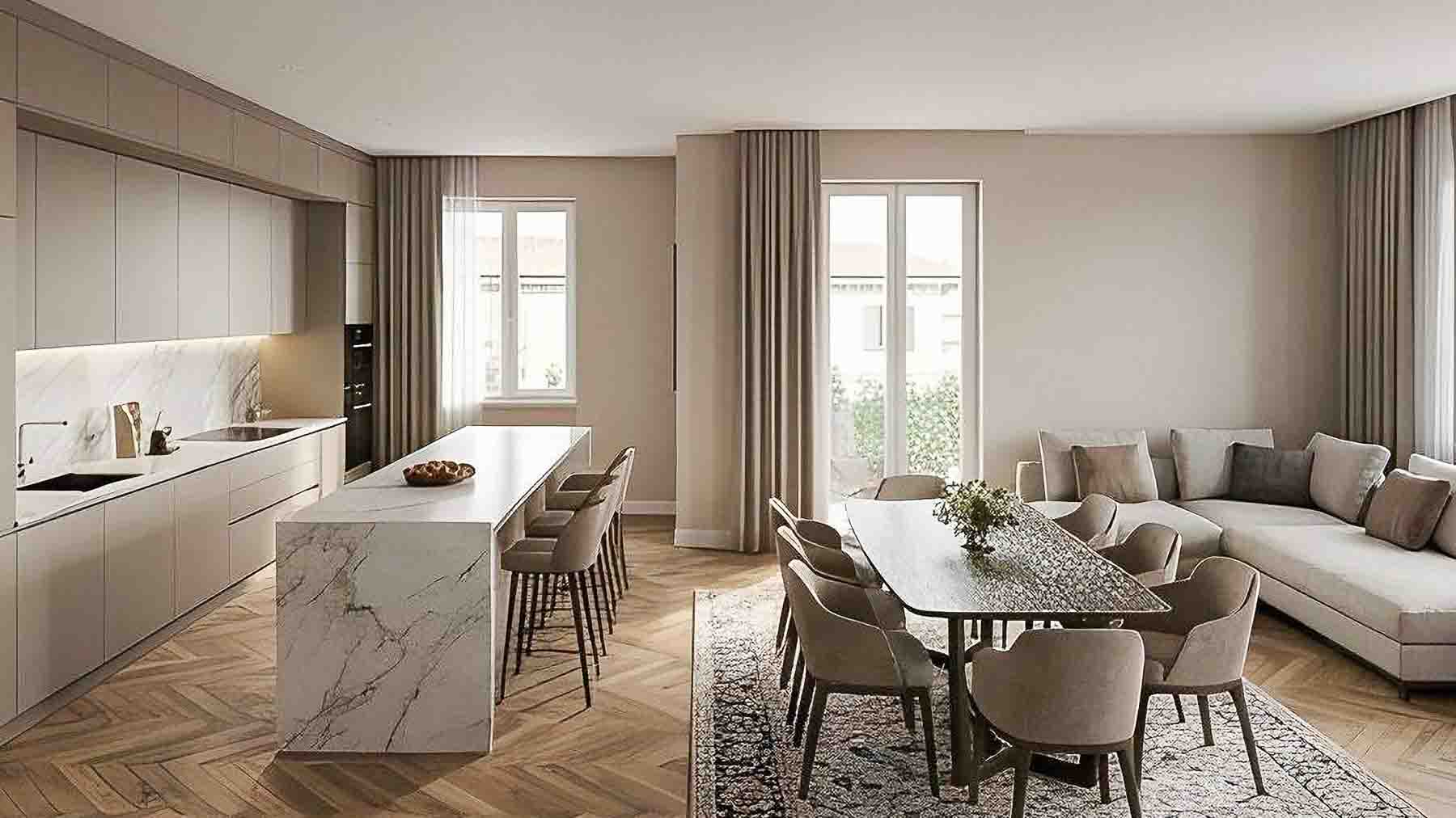 Imagine stepping into a sanctuary of modern elegance, where every detail has been meticulously crafted to offer a symphony of style and comfort. Bathed in warm natural light streaming through expansive windows, this exquisite living space in the heart of Milano welcomes you with its sophisticated charm. The scent of fresh blooms fills the air, mingling with the enticing aroma of a gourmet meal being prepared in the state-of-the-art kitchen. Spanning an impressive 230 square meters, this luxurious residence boasts five beautifully appointed rooms and three chic bathrooms. Every corner of this home exudes sophistication, with distinctive features such as sleek cabinetry, a stunning marble countertop, and a central island perfect for casual dining or entertaining guests. The herringbone-patterned wooden floors add a touch of classic warmth, while the open layout seamlessly connects the kitchen, dining, and living areas, creating an inviting atmosphere for both relaxation and social gatherings. Located in the vibrant city of Milano, this property offers a dynamic urban lifestyle that is second to none. Living here means indulging in the finest experiences life has to offer. Picture yourself savoring a morning espresso on the spacious island, bathed in sunlight, or hosting elegant dinner parties in the dining area that effortlessly flows into the plush living space. Each moment spent in this home is an opportunity to create cherished memories, surrounded by exquisite design and unparalleled comfort. This property embodies the pinnacle of luxury living in the city, a true masterpiece that combines contemporary elegance with the vibrant lifestyle of Milano. It is a rare opportunity to own a piece of architectural brilliance in the heart of one of the world's most fashionable cities.