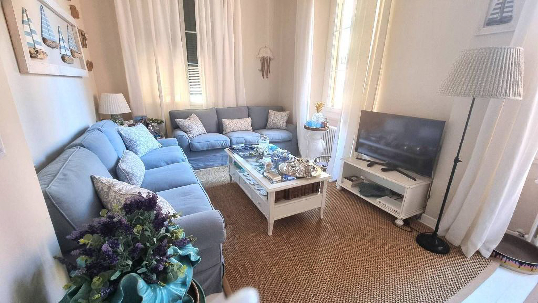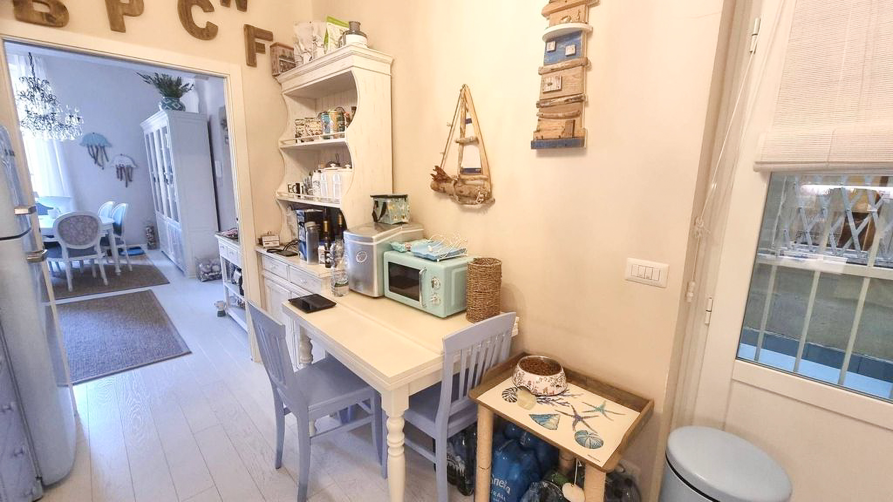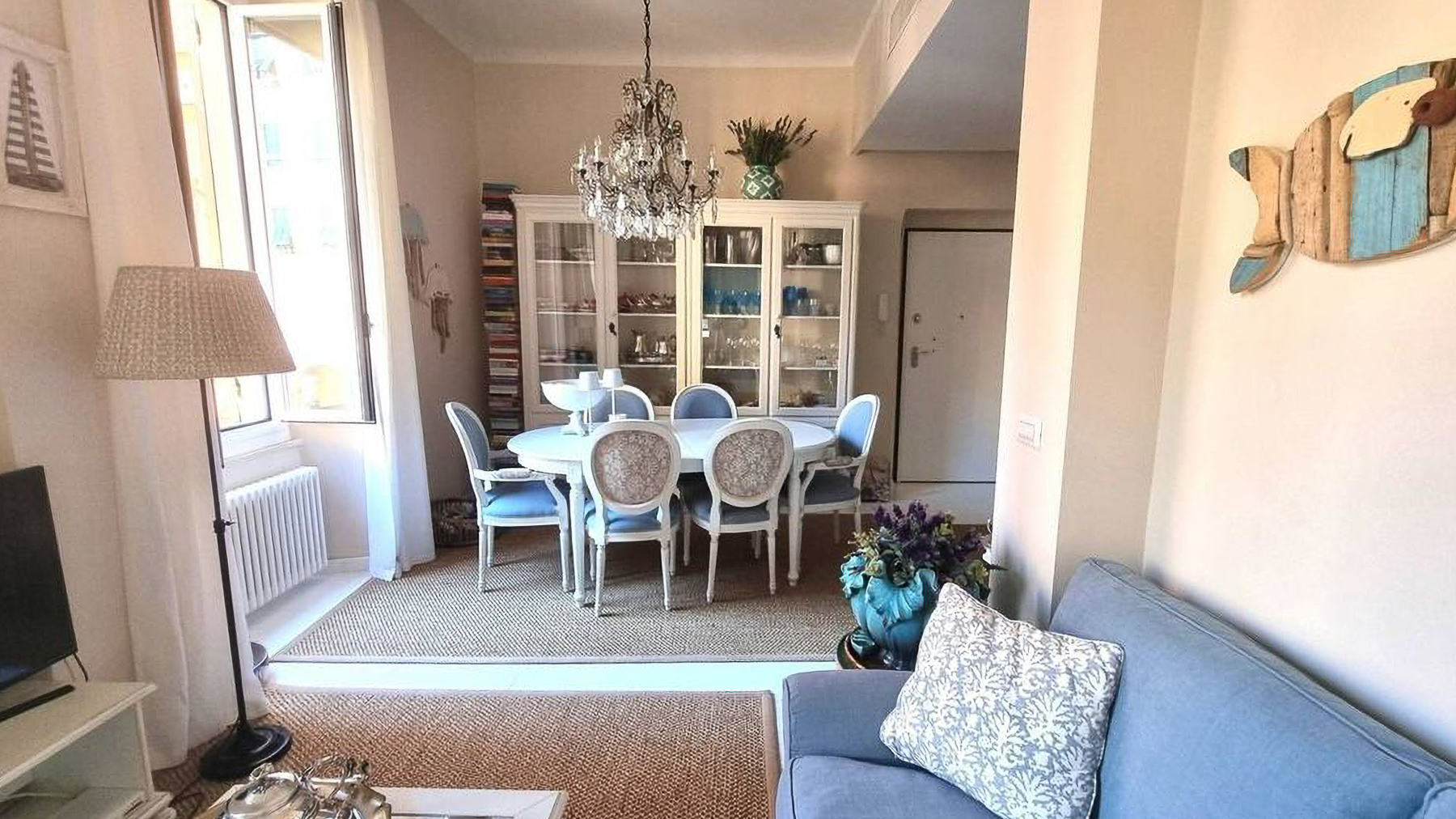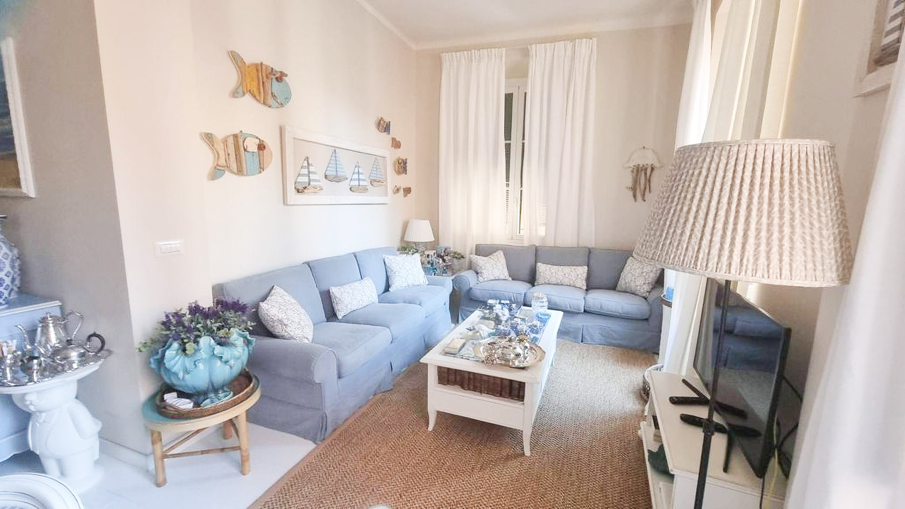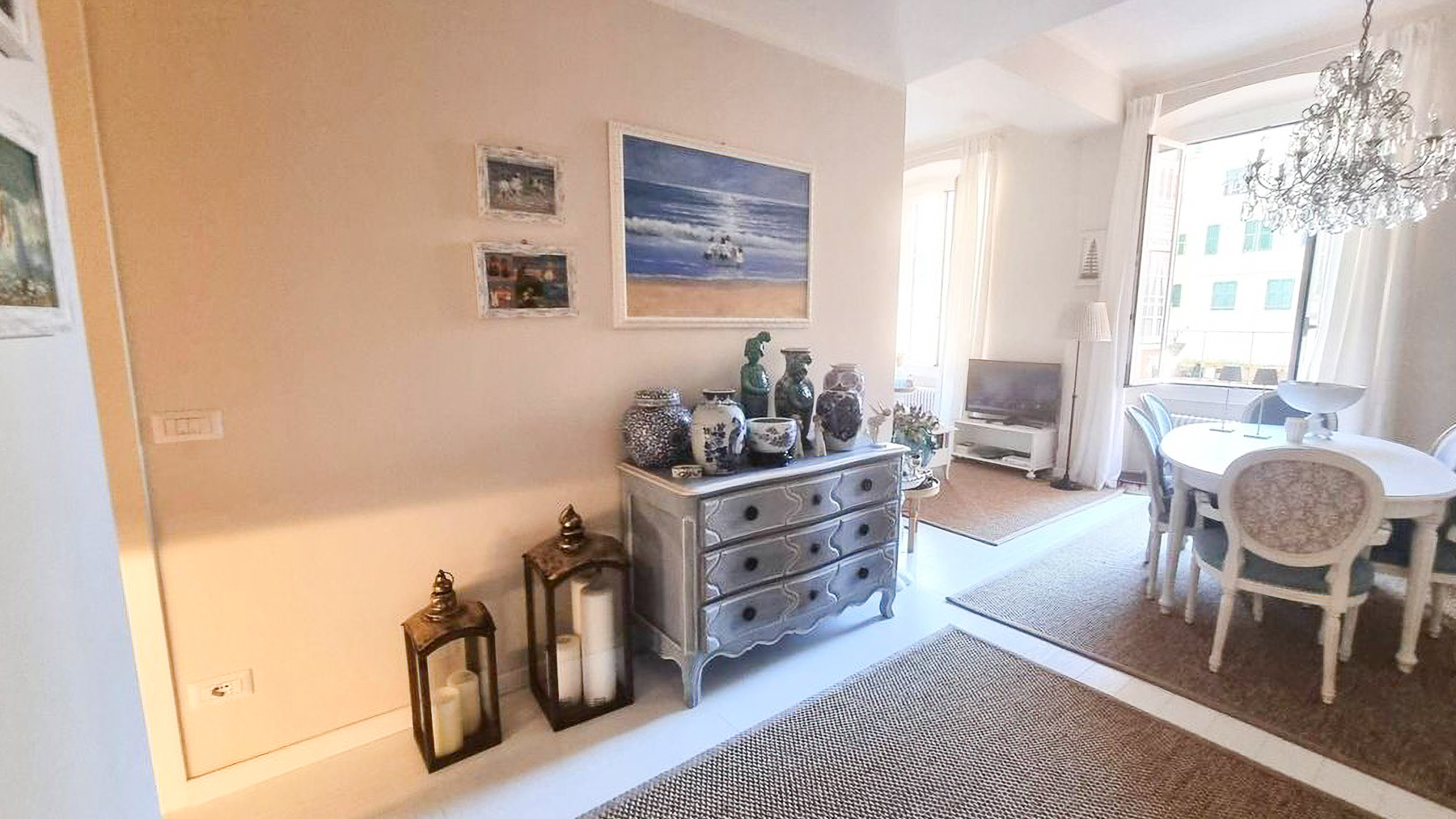 Perched gracefully on a sun-drenched hillside, this exquisite residence offers a serene escape with breathtaking views of the vibrant Santa Margherita Ligure. The gentle whisper of the sea breeze mingles with the fragrance of Mediterranean flora, crafting an idyllic setting for those seeking both tranquility and luxury. Spanning 120 square meters, this elegant property features three spacious rooms and two beautifully appointed bathrooms. The light-filled living room, adorned with nautical accents, invites relaxation with its plush blue sofa and stylish décor. A central coffee table and a textured floor lamp create a sophisticated ambiance. Natural light filters through the airy curtains, illuminating the space's delicate features, including the jute rug and the decorative plant that adds a touch of nature. Situated in Santa Margherita Ligure, Genova, this home embodies a coastal lifestyle, offering proximity to the azure waters and vibrant local culture. Imagine mornings spent sipping coffee on the balcony, overlooking the picturesque landscape of colorful homes and the iconic white church with its dome and bell tower. Afternoons unfold with coastal adventures or leisurely strolls through lush gardens, while evenings invite you to unwind with the soothing sounds of the sea and the gentle glow of the sunset. This property is a testament to refined living, where elegance meets the charm of the Mediterranean. A rare opportunity to own a piece of paradise in the luxury real estate market, it promises a lifestyle of unparalleled beauty and comfort.