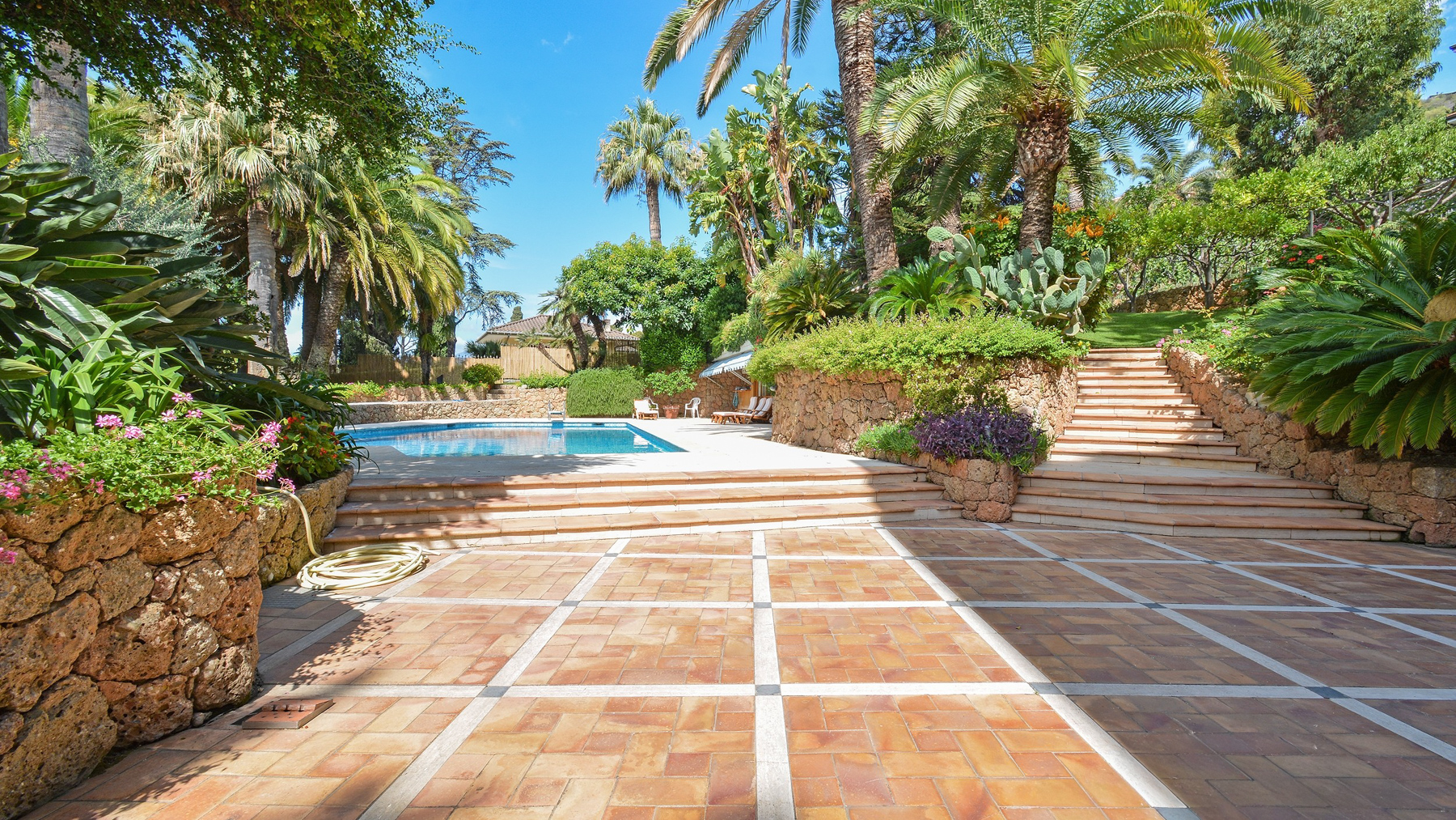 In the serene embrace of lush tropical surroundings, this exquisite property in Bordighera, Imperia, unfolds as a sanctuary of luxury and tranquility. Imagine the gentle rustle of palm leaves and the soft splash of water from the communal pool, creating a symphony of relaxation and retreat. Warm sunlight filters through expansive glass windows, casting a golden glow over a stylish and inviting interior. Spanning 200 square meters, this elegant residence boasts seven spacious rooms and six luxurious bathrooms, thoughtfully designed to cater to every need. The property seamlessly blends indoor elegance with outdoor allure, featuring a garden that invites peaceful reflection and leisurely strolls. The communal pool serves as both a visual centerpiece and a refreshing escape. Every corner of this home is crafted to offer a harmonious balance of modern design and natural beauty, with wicker furniture and modern art accentuating the sophisticated ambiance. Life here is a tapestry of enchanting experiences. Picture yourself lounging by the pool under a sun-drenched sky or savoring a quiet moment in the garden, surrounded by nature's vibrant palette. As day turns to evening, the allure of this seaside location becomes even more pronounced, with the sea's whispering breeze enhancing the property’s allure. This property stands as a testament to the rare fusion of timeless elegance and contemporary comfort. It is not just a home, but a unique masterpiece offering an unparalleled lifestyle on the Italian Riviera.
