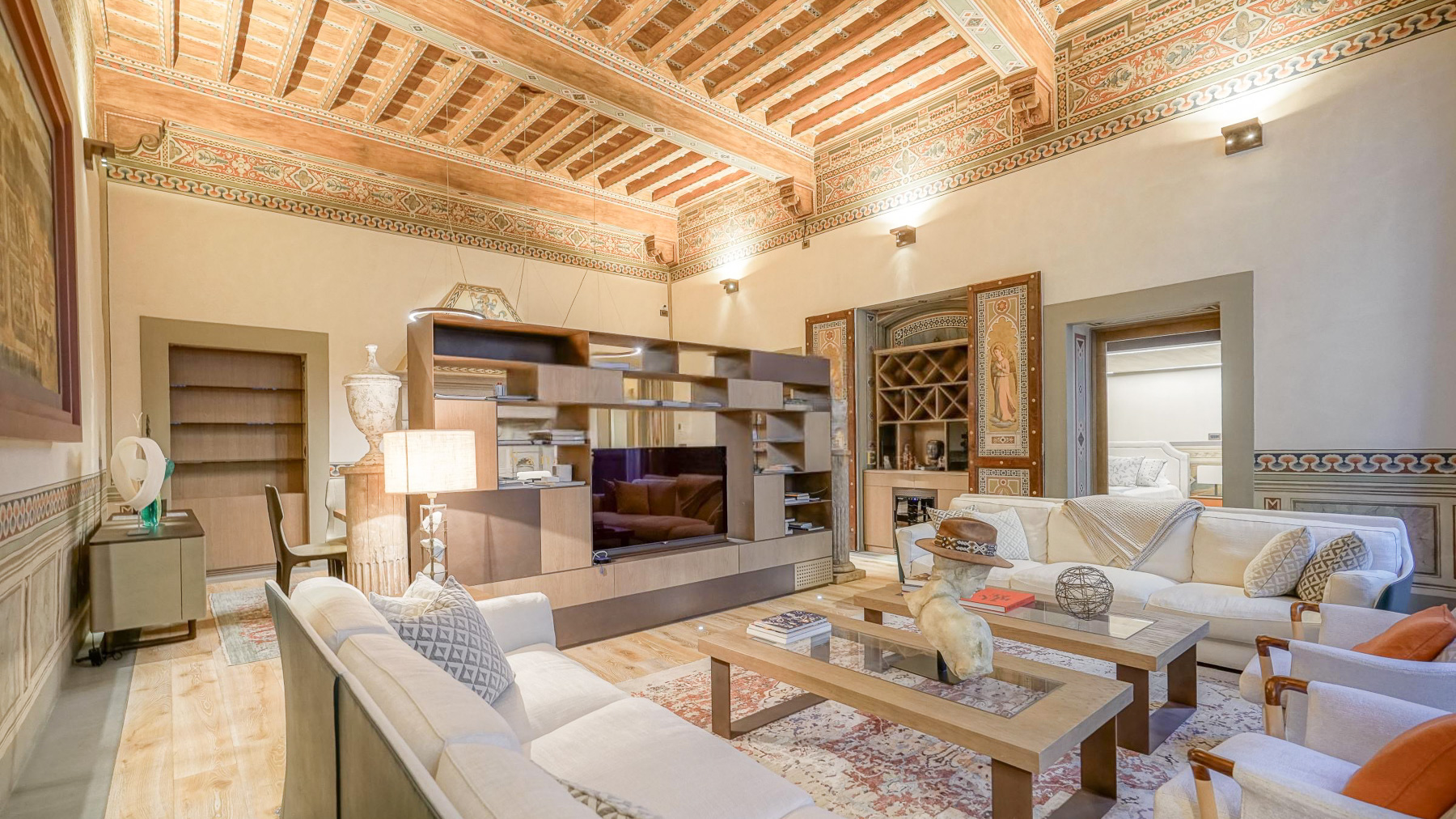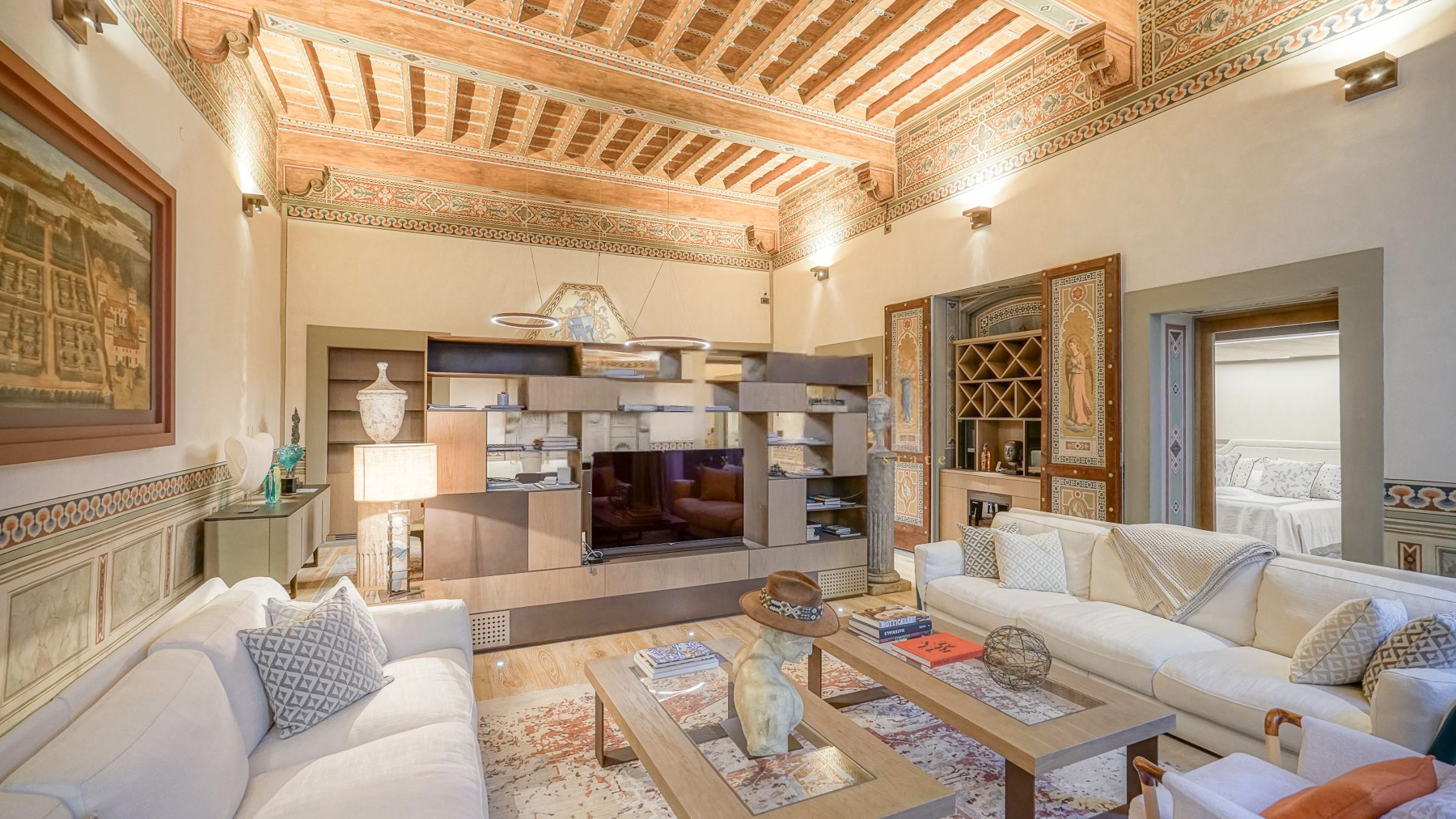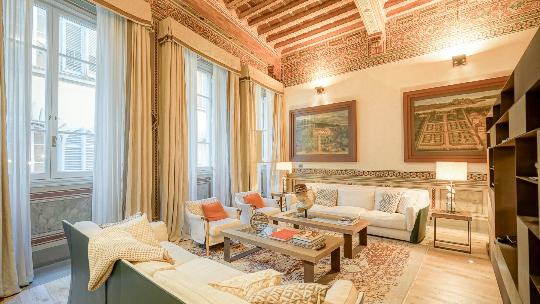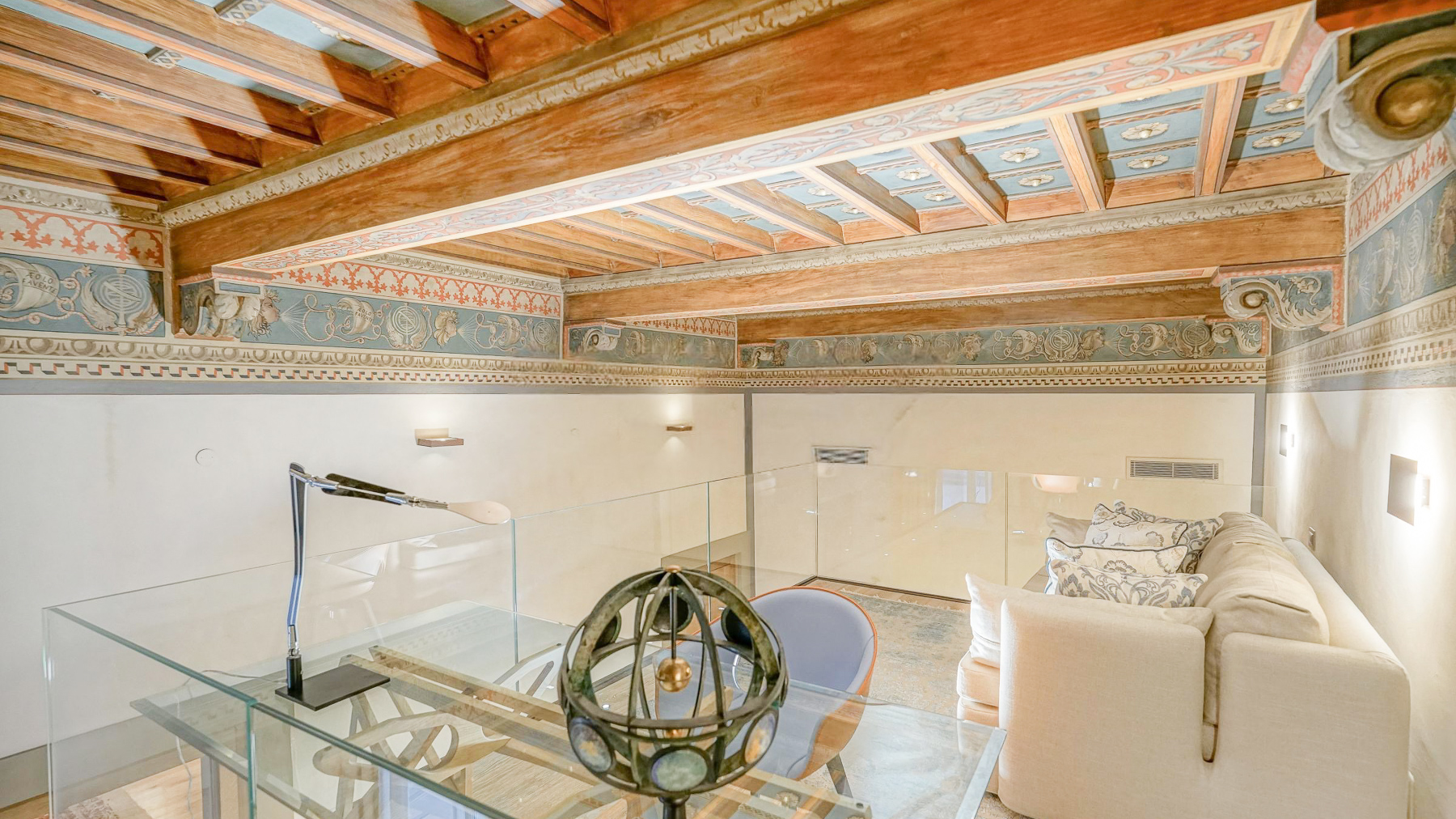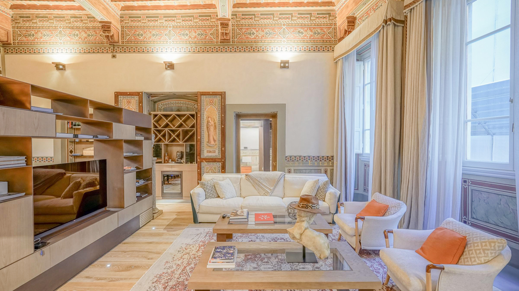 Tucked away in the vibrant heart of Florence, this exquisite property offers an oasis of elegance and sophistication. As you step inside, the interplay of light and shadow, combined with the gentle aroma of Italian blooms from the private garden, envelops you in a sense of tranquility and luxury. Spanning an impressive 340 square meters, this remarkable residence boasts nine spacious rooms and five opulent bathrooms. The living room is a masterpiece of design, featuring high ceilings with exposed wooden beams and intricate painted details. Comfortable white sofas with patterned cushions invite relaxation, while a contemporary entertainment unit and decorative pieces add a touch of modern flair. The bedroom exudes serenity, with a light-colored bedspread, decorative pillows, and large windows that drape the space in natural light. A set of stairs leads to a charming lofted area, enhancing the room's airy ambiance. The private garden offers a serene escape, making this home a perfect blend of elegance and comfort. Imagine waking up to the gentle glow of the Tuscan sun, drawing back the light, flowing curtains to reveal a new day in one of Italy's most enchanting cities. Evenings can be spent in the inviting seating area, savoring a glass of wine from your own storage unit, as you relax in the harmonious blend of modern and traditional design elements. This property is a testament to refined living, offering a unique blend of historical charm and contemporary luxury. It stands as a rare jewel in the prestigious Florence real estate market, capturing the essence of a sophisticated city lifestyle.
