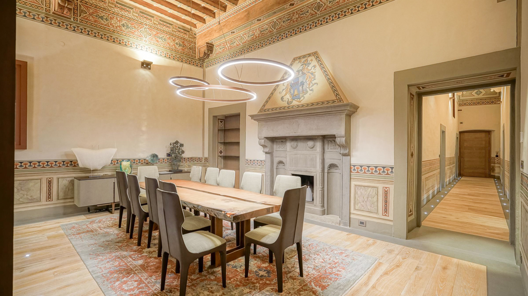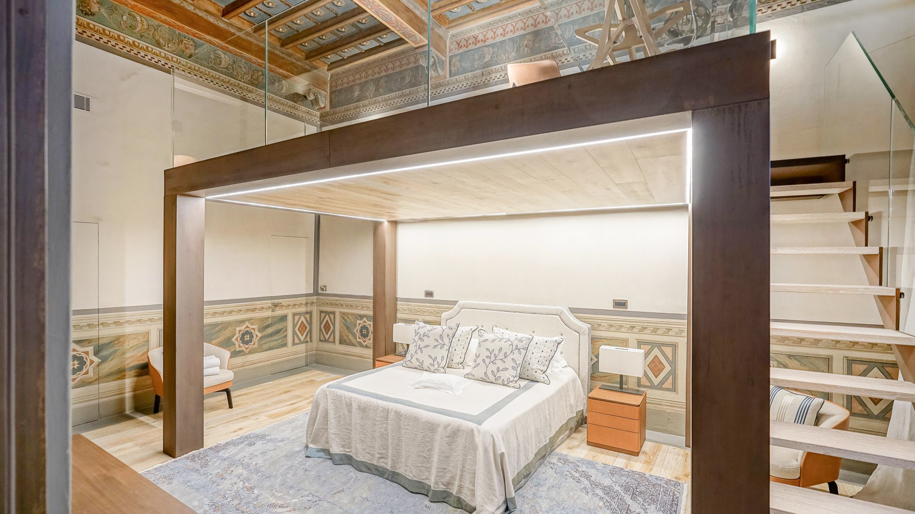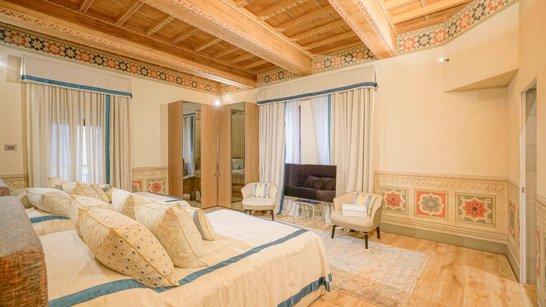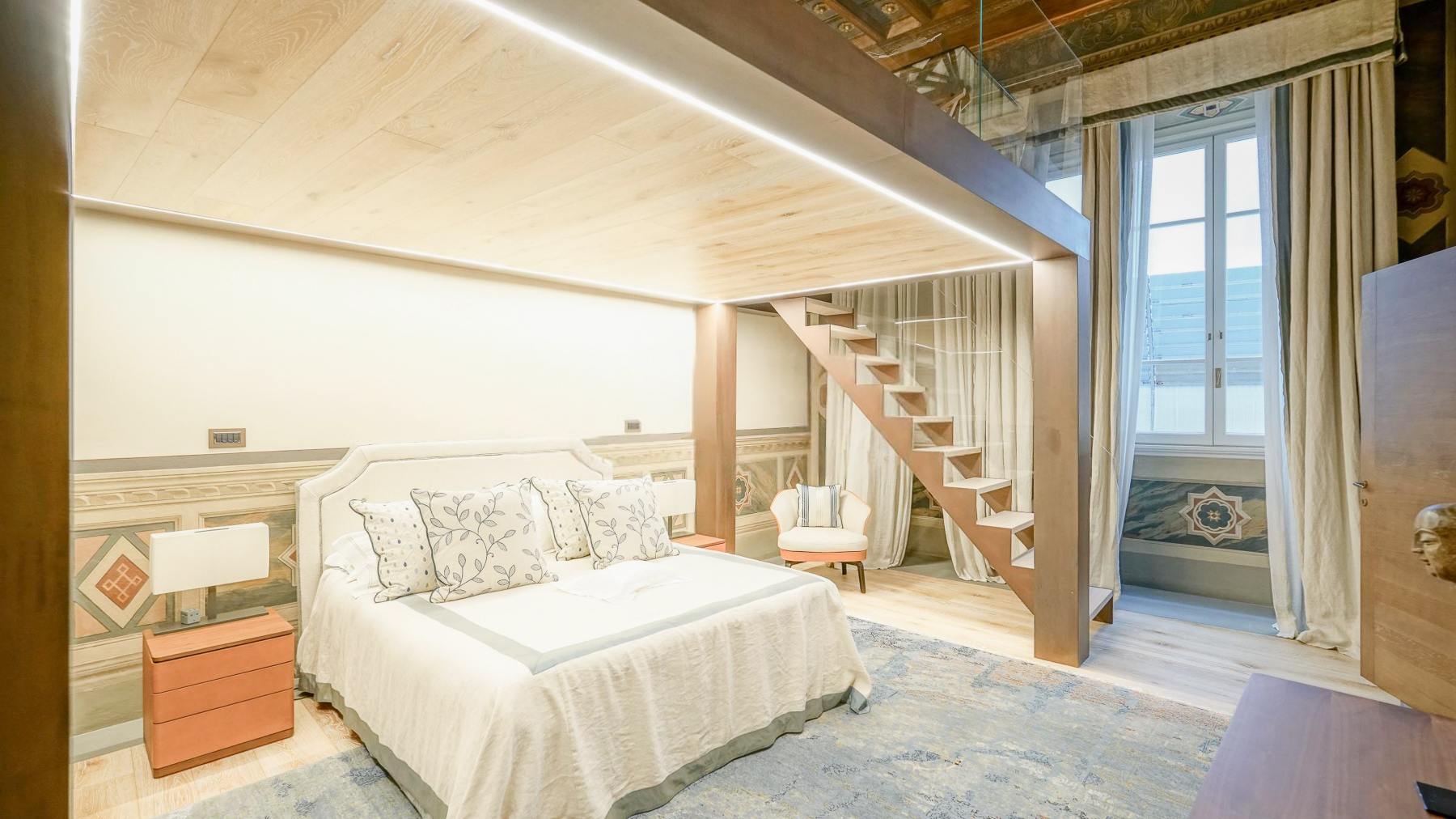 Tucked away in the vibrant heart of Florence, this exquisite property offers an oasis of elegance and sophistication. As you step inside, the interplay of light and shadow, combined with the gentle aroma of Italian blooms from the private garden, envelops you in a sense of tranquility and luxury. Spanning an impressive 340 square meters, this remarkable residence boasts nine spacious rooms and five opulent bathrooms. The living room is a masterpiece of design, featuring high ceilings with exposed wooden beams and intricate painted details. Comfortable white sofas with patterned cushions invite relaxation, while a contemporary entertainment unit and decorative pieces add a touch of modern flair. The bedroom exudes serenity, with a light-colored bedspread, decorative pillows, and large windows that drape the space in natural light. A set of stairs leads to a charming lofted area, enhancing the room's airy ambiance. The private garden offers a serene escape, making this home a perfect blend of elegance and comfort. Imagine waking up to the gentle glow of the Tuscan sun, drawing back the light, flowing curtains to reveal a new day in one of Italy's most enchanting cities. Evenings can be spent in the inviting seating area, savoring a glass of wine from your own storage unit, as you relax in the harmonious blend of modern and traditional design elements. This property is a testament to refined living, offering a unique blend of historical charm and contemporary luxury. It stands as a rare jewel in the prestigious Florence real estate market, capturing the essence of a sophisticated city lifestyle.