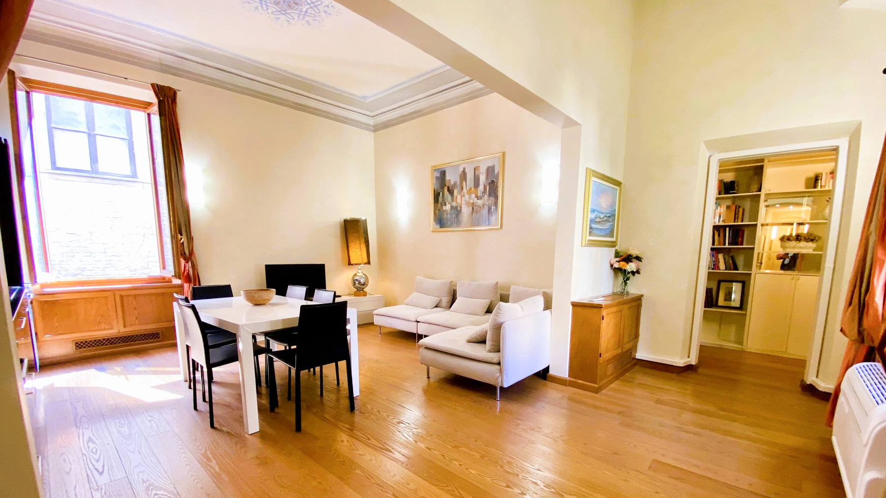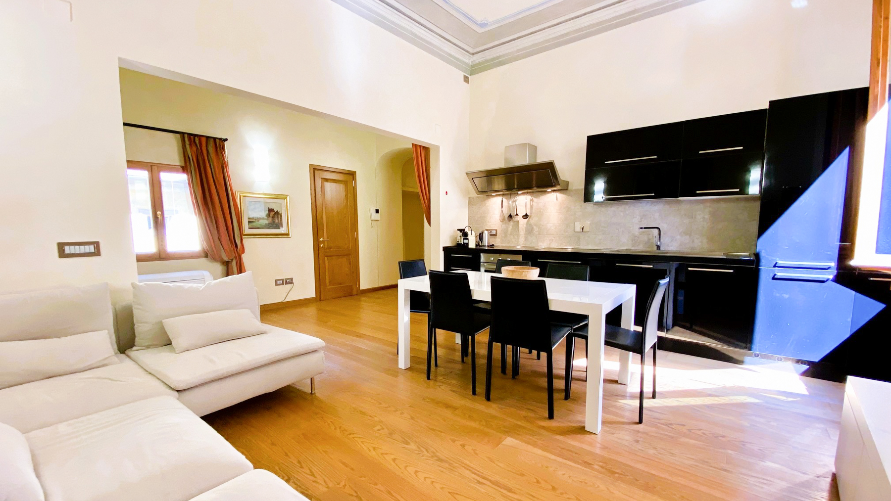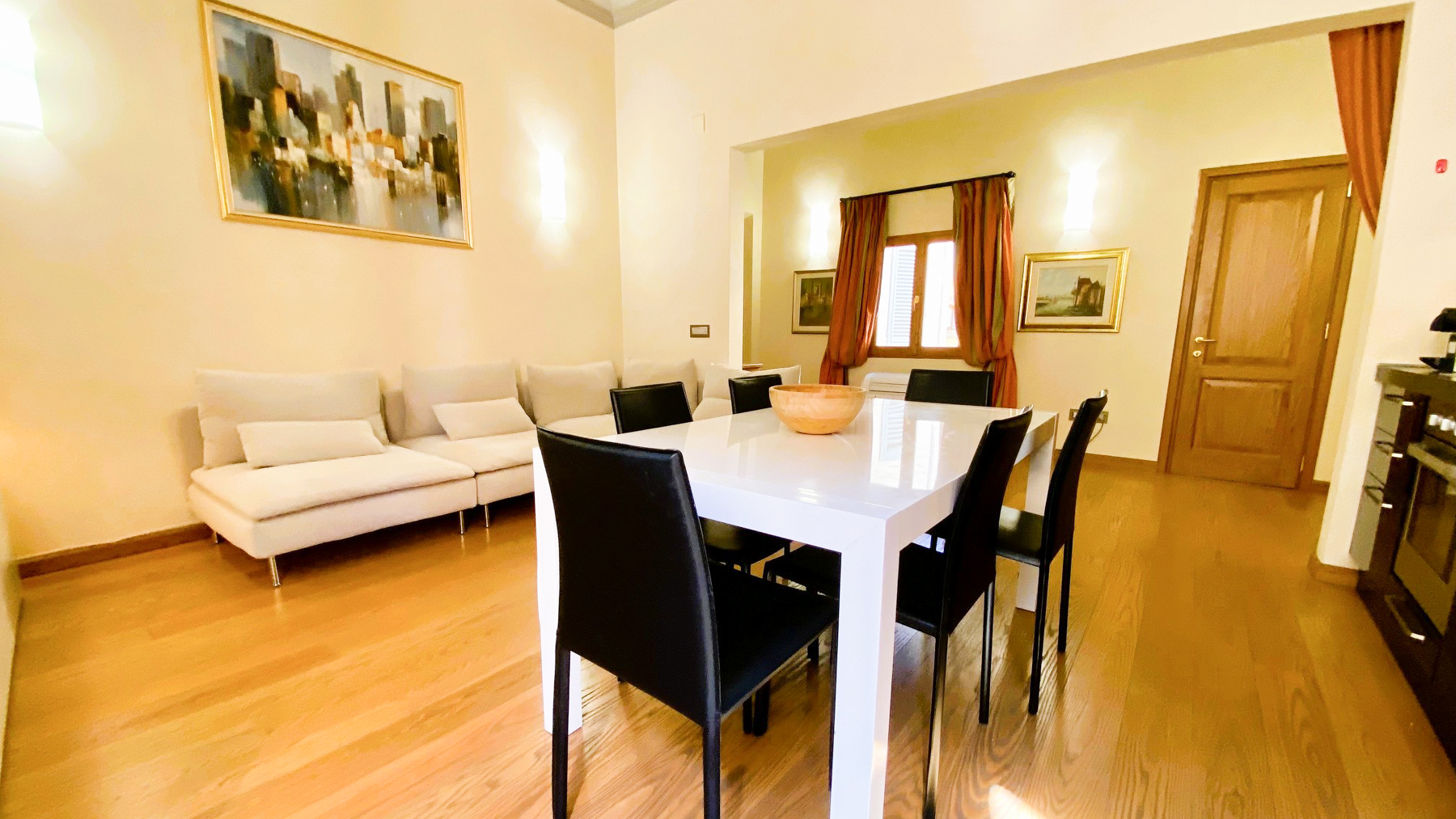 Enveloped in the charm of Florence, this exquisite property captures the essence of elegance and serenity. Bathed in natural light, the interiors invite you to embrace the warmth and tranquility of a luxurious urban sanctuary. The gentle hum of the city beyond the windows offers a harmonious backdrop to this refined retreat. Spanning 120 square meters, this sophisticated residence boasts four elegantly designed rooms and three modern bathrooms. The expansive living and dining area is a masterpiece of contemporary style, featuring a sleek white dining table, chic black chairs, and a light-colored sofa, all illuminated by large windows. The seamless blend of wooden flooring and tasteful decorative elements creates a space that is both inviting and refined. The private quarters reveal a serene bedroom with a minimalist bed, complemented by a cozy bedside table and a mirror that enhances the room's airy ambiance. The bathroom is a sanctuary of relaxation, complete with a glass shower enclosure and pristine, light-colored tiles. Living in this refined Florence abode means indulging in the vibrant city life while enjoying your own peaceful haven. Picture yourself savoring peaceful mornings with a cup of coffee as sunlight streams through the windows, or hosting intimate gatherings around the elegantly appointed dining area, where laughter and conversation flow freely. This property is not just a home; it is a statement of prestige and distinction, a rare find in the heart of Florence's luxury real estate market. Embrace the unparalleled blend of timeless beauty and modern sophistication that awaits within these walls.