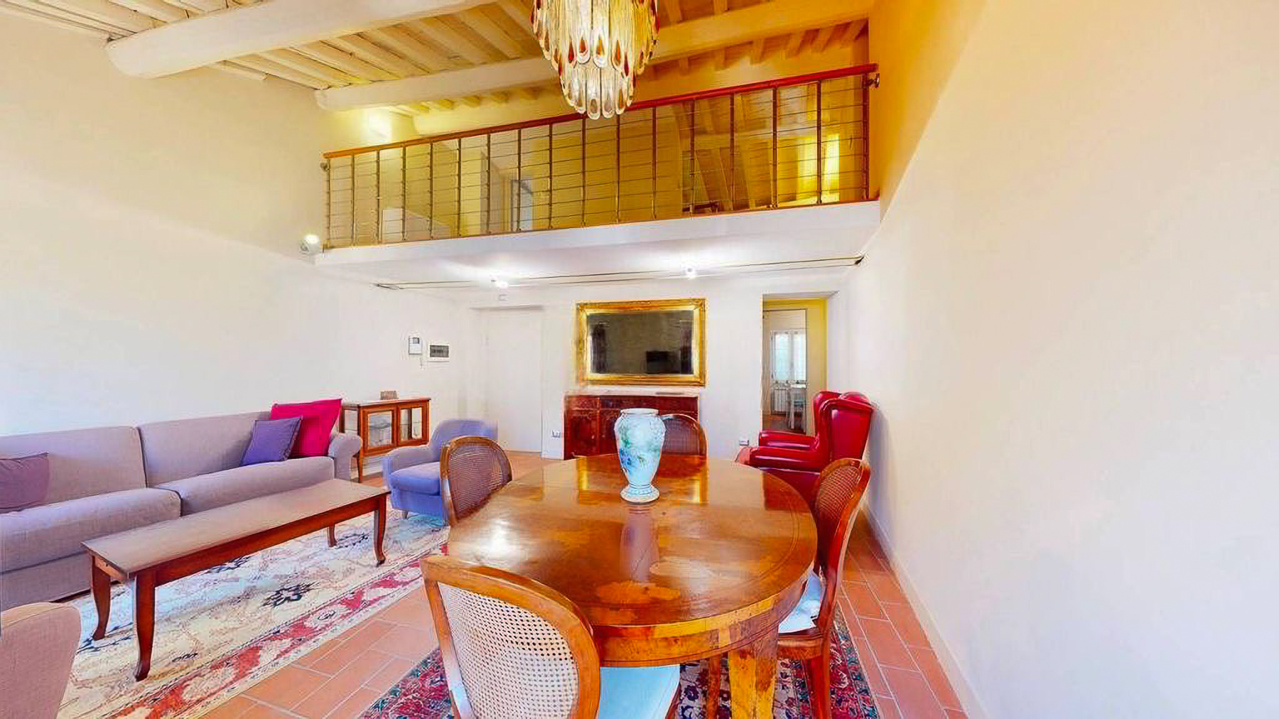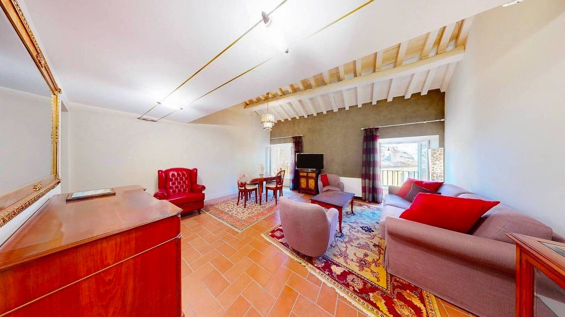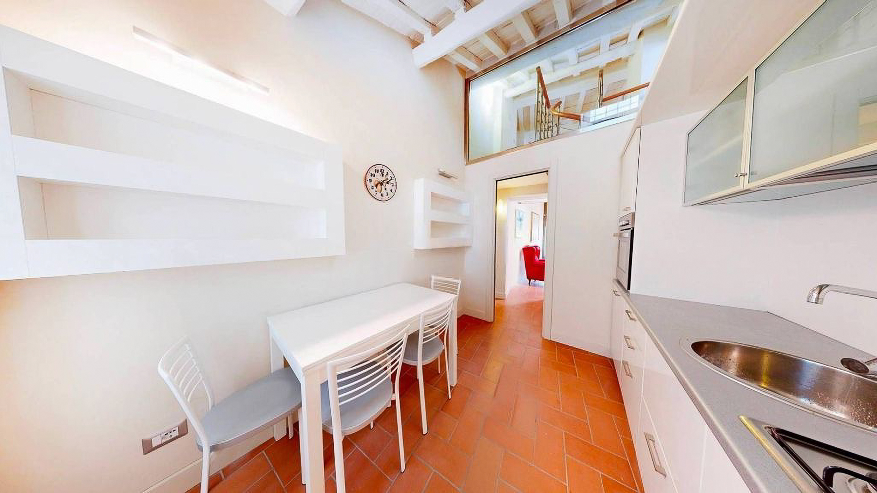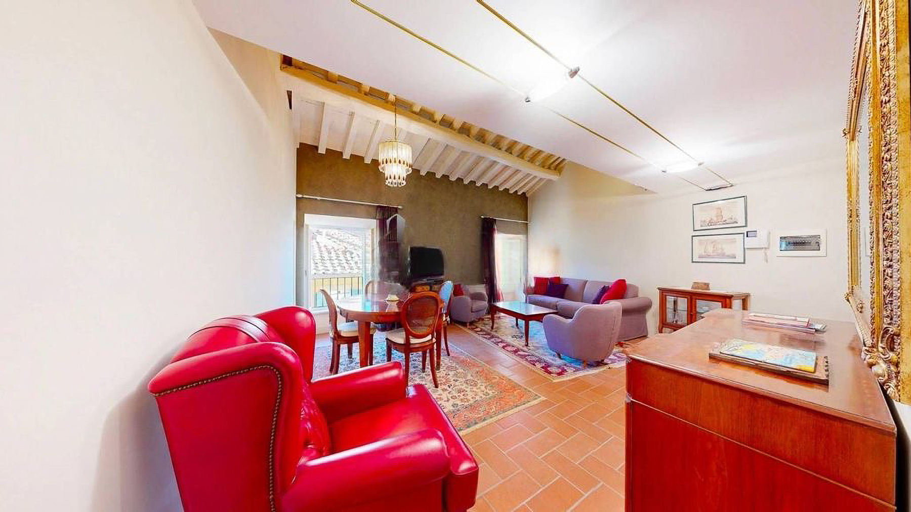 Tucked away in the heart of Rome, this exquisite residence epitomizes the perfect blend of modern sophistication and classic charm. As you step inside, you're embraced by the warmth of wooden beams overhead and the soft glow of elegant lighting, inviting you to explore further into this serene oasis amidst the bustling city. Spanning a generous 123 square meters, this luxurious home features four spacious rooms and three elegantly styled bathrooms. The open living and dining area boasts a high ceiling, a decorative gold-framed mirror, and a beautiful fusion of modern and classic elements. The kitchen is a masterpiece of contemporary design, with dark cabinetry, gold accents, and a pristine marble countertop. A distinctive red armchair adds a pop of color, while the cozy light-colored sofa promises relaxation. The property also offers a stunning terrace, perfect for outdoor enjoyment in the heart of Rome. Living here means indulging in a lifestyle of luxury and comfort. Picture yourself unwinding in the inviting lounge, or hosting intimate dinner parties with the city as your backdrop. The terrace becomes a focal point for gatherings, where you can savor Italian wine under the stars, feeling the pulse of the city in the air. This remarkable residence offers an unparalleled opportunity to experience the finest in urban living. It is not just a home, but a statement of elegance and sophistication—truly a rare find in Rome's luxury real estate market.