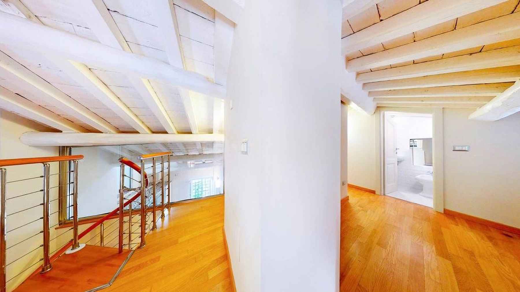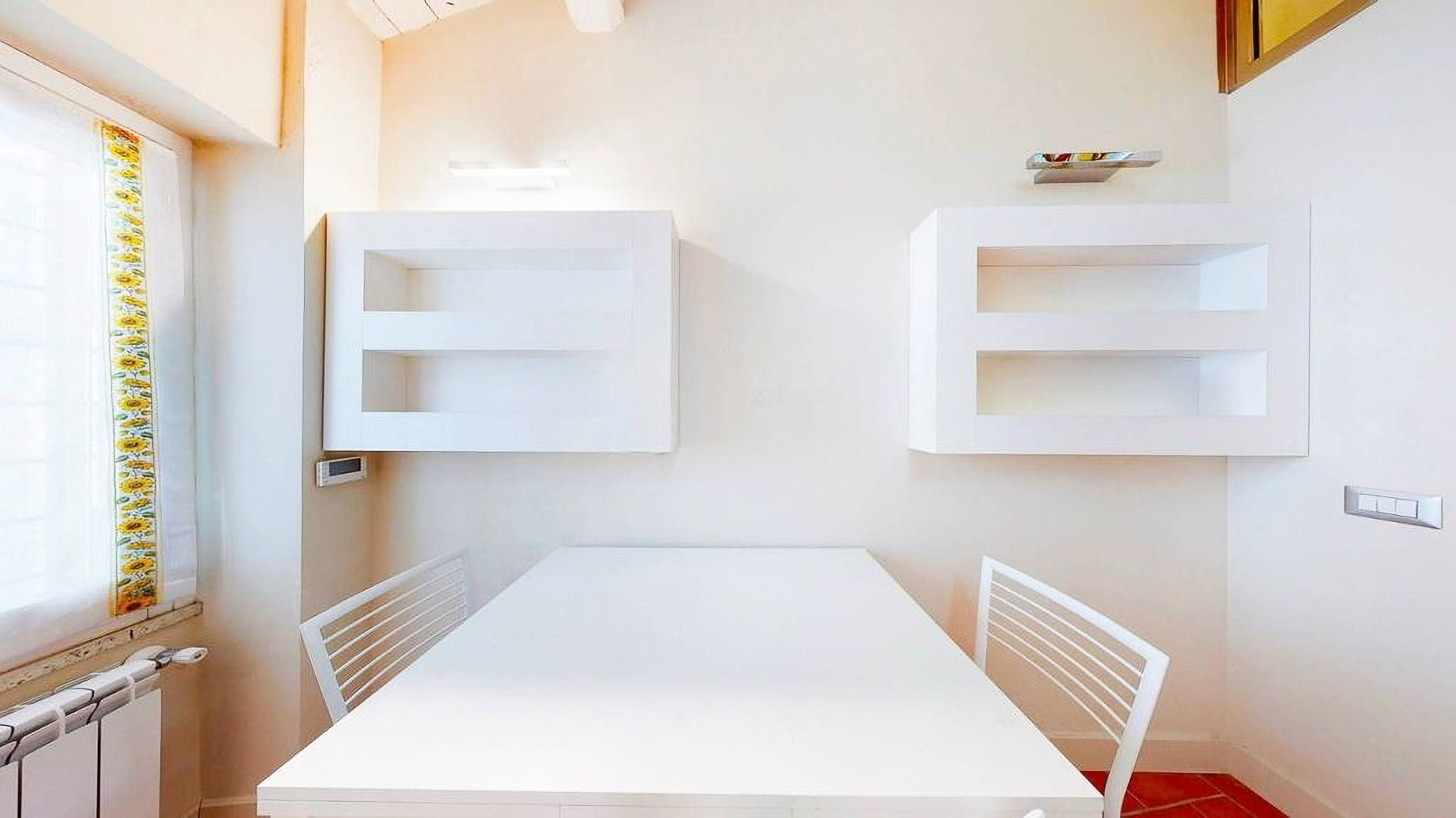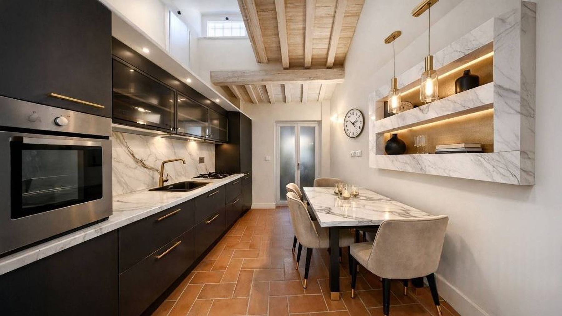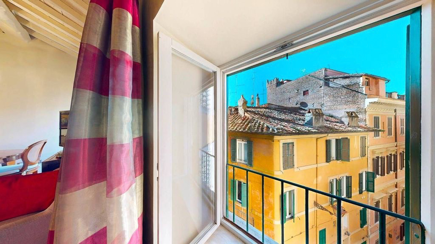 Tucked away in the heart of Rome, this exquisite residence epitomizes the perfect blend of modern sophistication and classic charm. As you step inside, you're embraced by the warmth of wooden beams overhead and the soft glow of elegant lighting, inviting you to explore further into this serene oasis amidst the bustling city. Spanning a generous 123 square meters, this luxurious home features four spacious rooms and three elegantly styled bathrooms. The open living and dining area boasts a high ceiling, a decorative gold-framed mirror, and a beautiful fusion of modern and classic elements. The kitchen is a masterpiece of contemporary design, with dark cabinetry, gold accents, and a pristine marble countertop. A distinctive red armchair adds a pop of color, while the cozy light-colored sofa promises relaxation. The property also offers a stunning terrace, perfect for outdoor enjoyment in the heart of Rome. Living here means indulging in a lifestyle of luxury and comfort. Picture yourself unwinding in the inviting lounge, or hosting intimate dinner parties with the city as your backdrop. The terrace becomes a focal point for gatherings, where you can savor Italian wine under the stars, feeling the pulse of the city in the air. This remarkable residence offers an unparalleled opportunity to experience the finest in urban living. It is not just a home, but a statement of elegance and sophistication—truly a rare find in Rome's luxury real estate market.