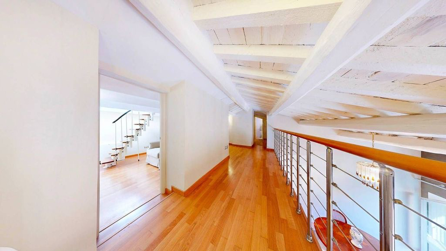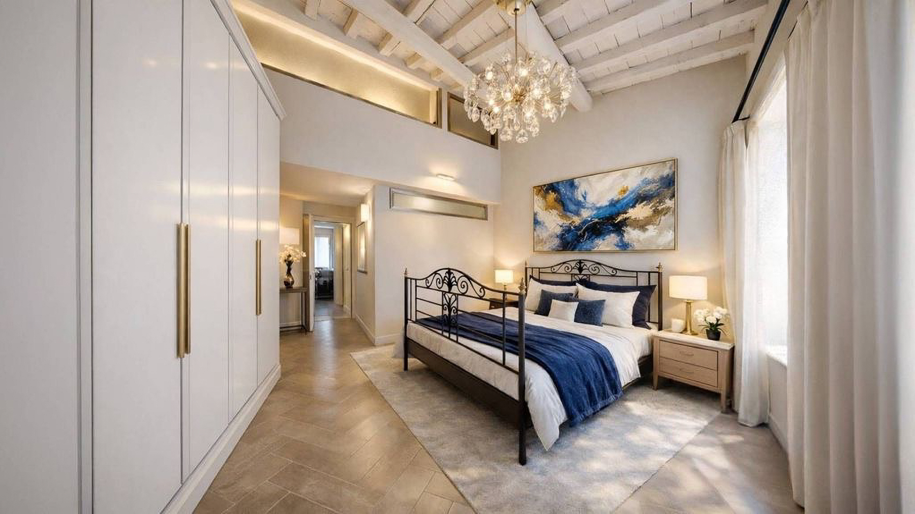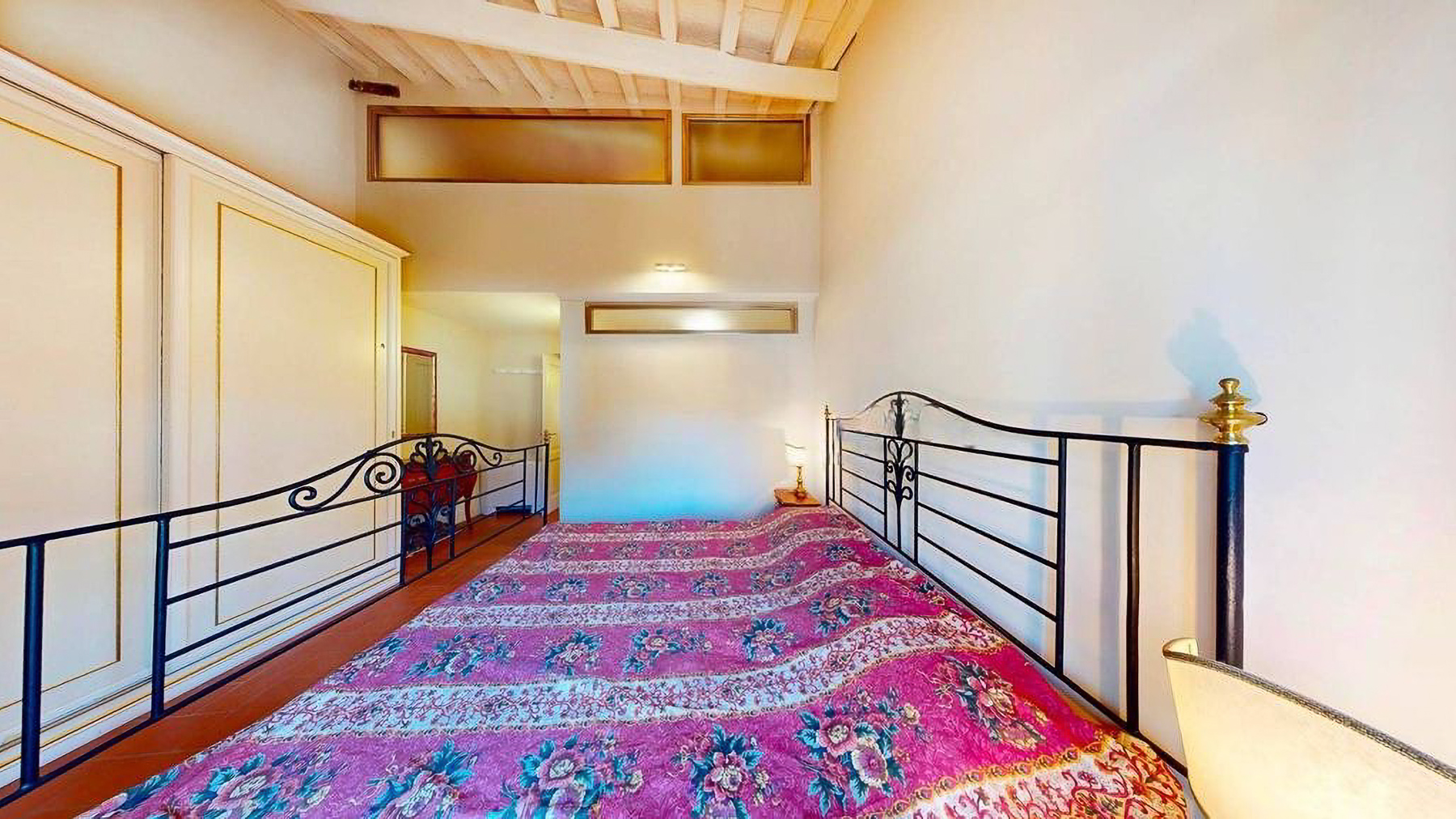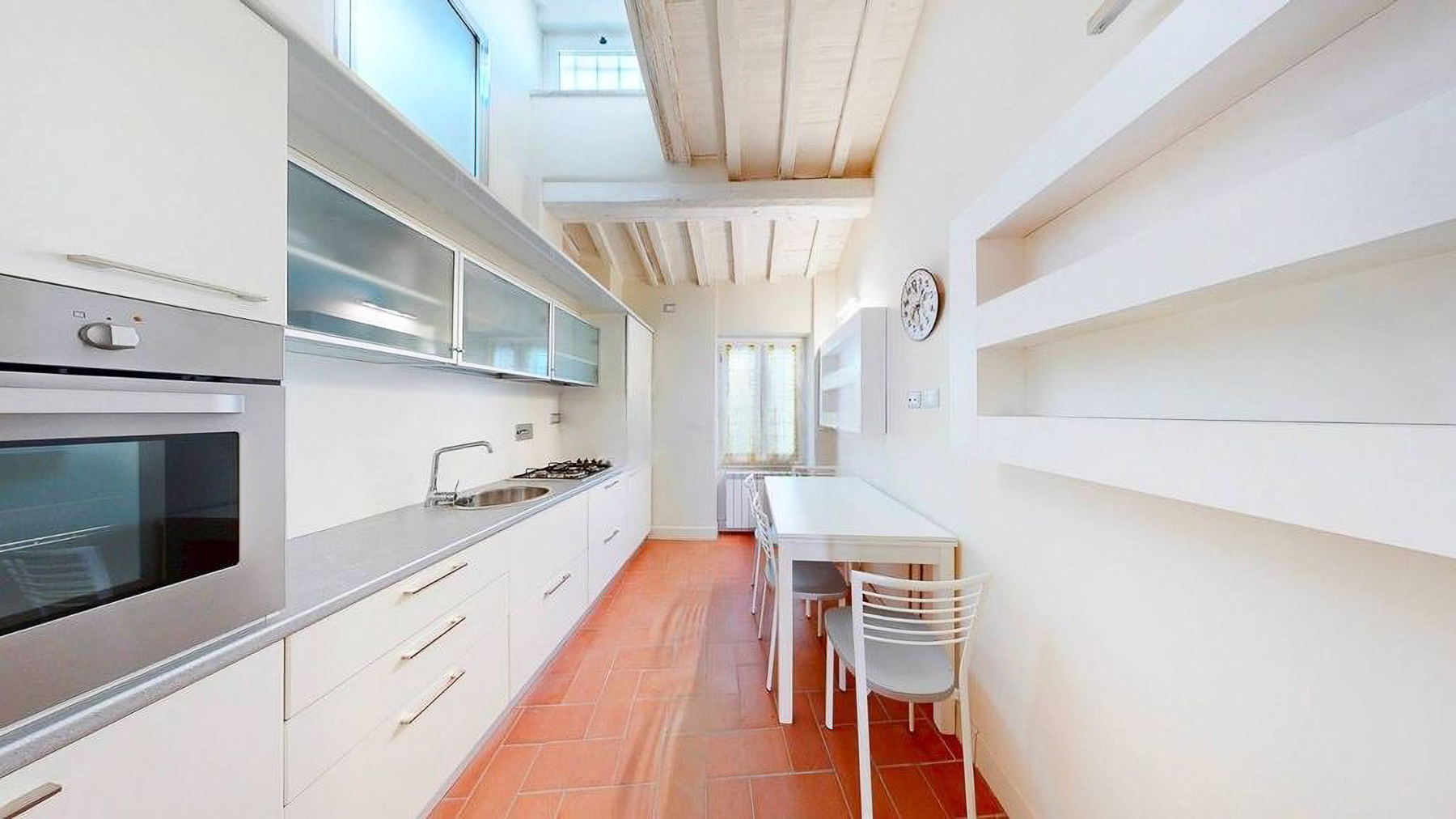 Tucked away in the heart of Rome, this exquisite residence epitomizes the perfect blend of modern sophistication and classic charm. As you step inside, you're embraced by the warmth of wooden beams overhead and the soft glow of elegant lighting, inviting you to explore further into this serene oasis amidst the bustling city. Spanning a generous 123 square meters, this luxurious home features four spacious rooms and three elegantly styled bathrooms. The open living and dining area boasts a high ceiling, a decorative gold-framed mirror, and a beautiful fusion of modern and classic elements. The kitchen is a masterpiece of contemporary design, with dark cabinetry, gold accents, and a pristine marble countertop. A distinctive red armchair adds a pop of color, while the cozy light-colored sofa promises relaxation. The property also offers a stunning terrace, perfect for outdoor enjoyment in the heart of Rome. Living here means indulging in a lifestyle of luxury and comfort. Picture yourself unwinding in the inviting lounge, or hosting intimate dinner parties with the city as your backdrop. The terrace becomes a focal point for gatherings, where you can savor Italian wine under the stars, feeling the pulse of the city in the air. This remarkable residence offers an unparalleled opportunity to experience the finest in urban living. It is not just a home, but a statement of elegance and sophistication—truly a rare find in Rome's luxury real estate market.