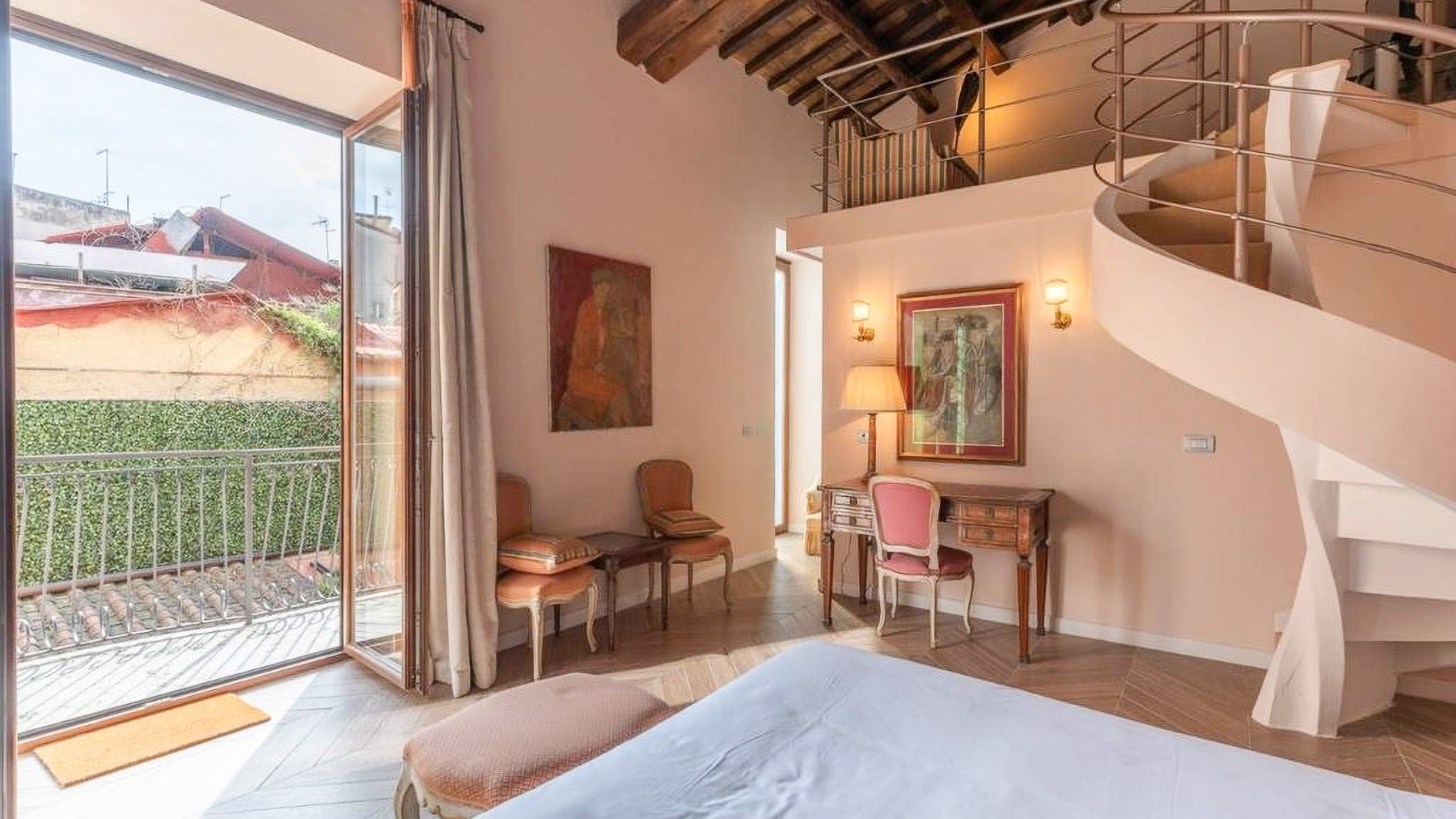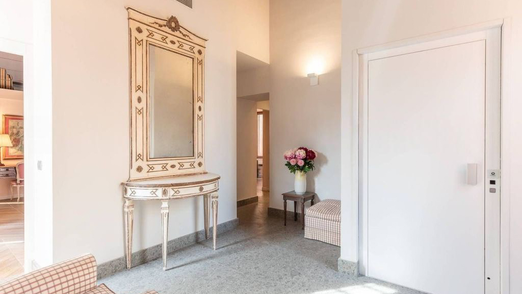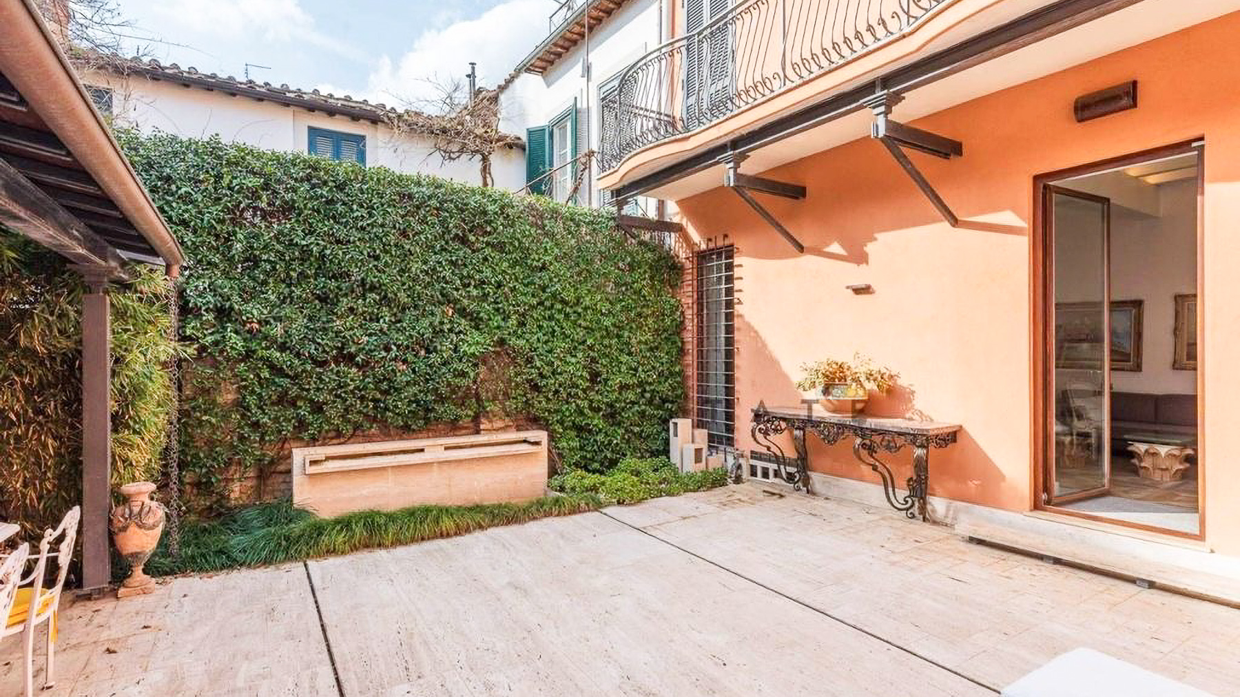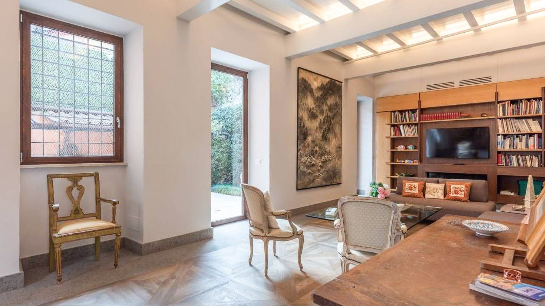 In the heart of Rome, where ancient history meets modern elegance, lies a luxurious retreat that invites you to experience the essence of refined living. This exquisite residence, bathed in natural light through its expansive windows, offers a serene escape from the bustling city while enveloping you in the warmth of a home designed with both comfort and style. Spanning an impressive 525 square meters, this property boasts five beautifully appointed rooms and three elegant bathrooms, providing ample space for relaxation and entertainment. The living area is a harmonious blend of classic and contemporary design elements, featuring antique-style chairs with heart-shaped backrests and a sleek modern sofa. A large bookshelf, filled with books and decorative treasures, adds character, while the patterned tile flooring enhances the aesthetic appeal. This urban sanctuary also includes a charming outdoor terrace, perfect for enjoying moments of peace amidst the greenery of the private courtyard or patio area. Living here means embracing a lifestyle of sophistication and charm. Imagine savoring your morning coffee on the terrace, surrounded by the gentle rustle of leaves and the soothing sounds of the city awakening. As the day unfolds, the covered pergola offers a tranquil spot for reading or unwinding, while the flat-screen TV and modern amenities ensure you stay connected and entertained. This residence epitomizes the pinnacle of luxury living in the eternal city of Rome. It is a unique opportunity to own a piece of timeless beauty, where every detail has been crafted to elevate your everyday experience into something extraordinary.