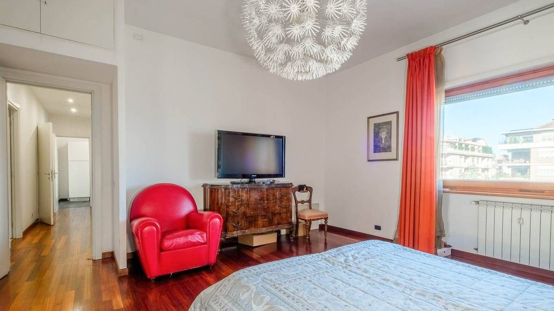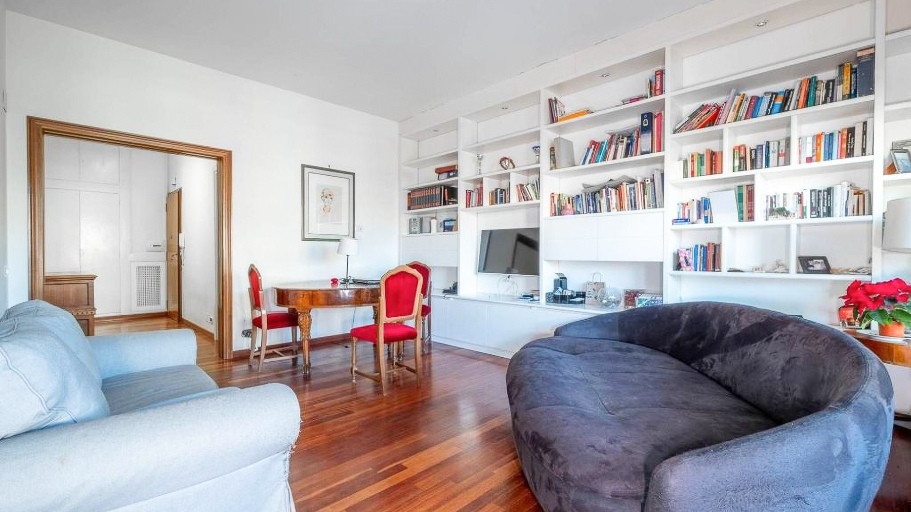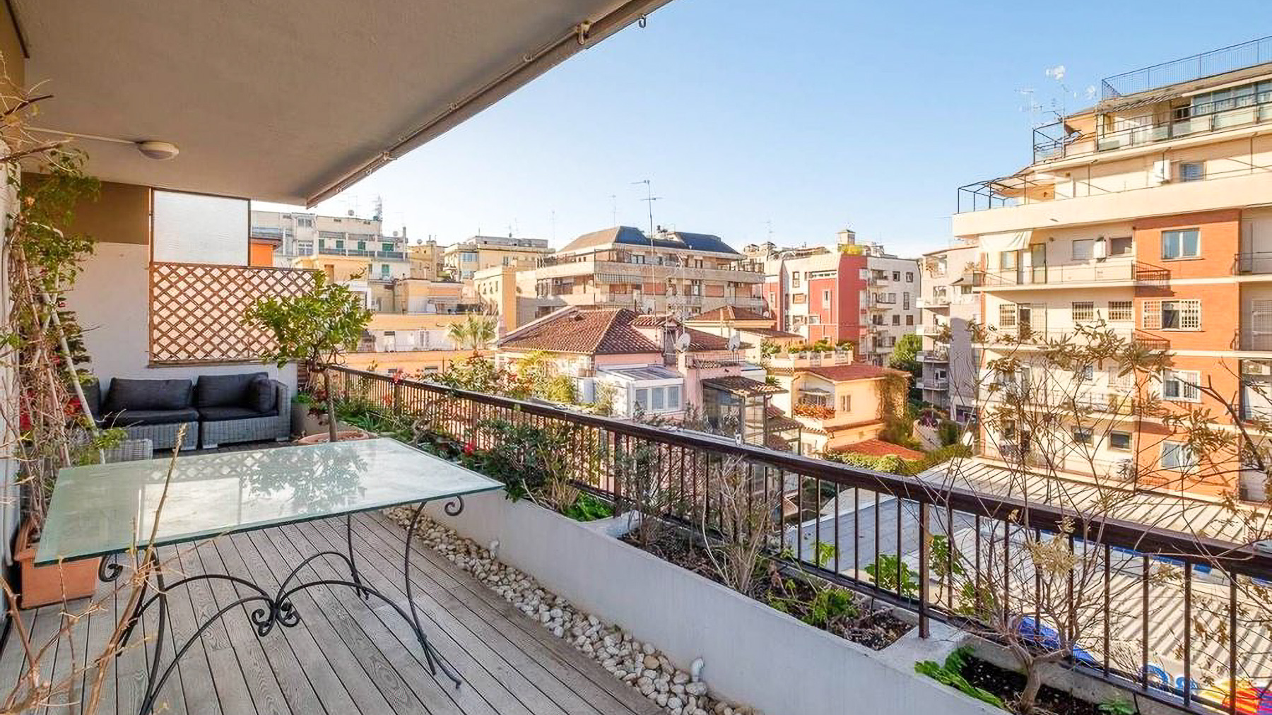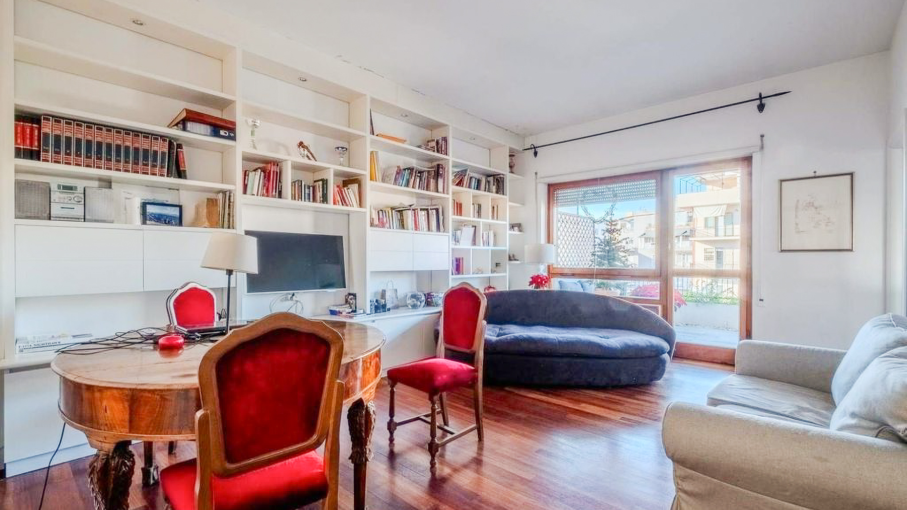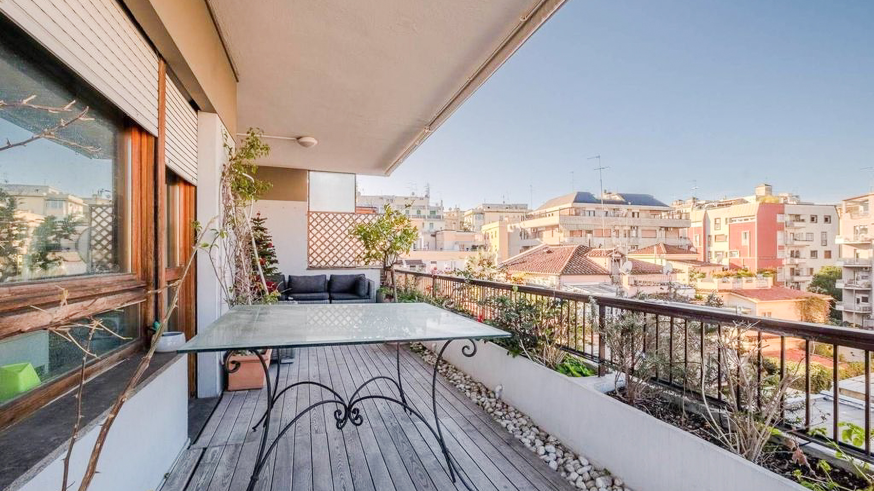Perched in the heart of Rome, this exquisite property captivates with its blend of modern elegance and urban vibrancy. As sunlight streams through the expansive windows, the cityscape unfolds before you, offering a panorama of architectural beauty and the gentle hum of city life. Spanning 145 square meters, this stunning residence boasts five spacious rooms and two elegant bathrooms, providing ample space for comfort and sophistication. The centerpiece is a stylish living room, where a light blue couch complements an oval dark gray chair, inviting relaxation. A small round table with distinctive chairs enhances the room's charm, while a television and decorative items provide modern conveniences. The wooden flooring adds warmth to the ambiance. A terrace extends the living space, offering a perfect spot for enjoying the view of Rome’s enchanting skyline. Living here is an experience of daily indulgence. Picture yourself savoring a morning coffee on the terrace as the city awakens, or unwinding in the cozy living room after a day spent exploring Rome’s rich history. The vibrant lifestyle of the city is at your doorstep, yet the property offers a serene escape from the hustle and bustle. This residence is a testament to luxury and style, offering a rare opportunity to own a piece of urban paradise in Rome. It embodies the perfect harmony of opulence and modern living, making it a standout in the luxury real estate market.