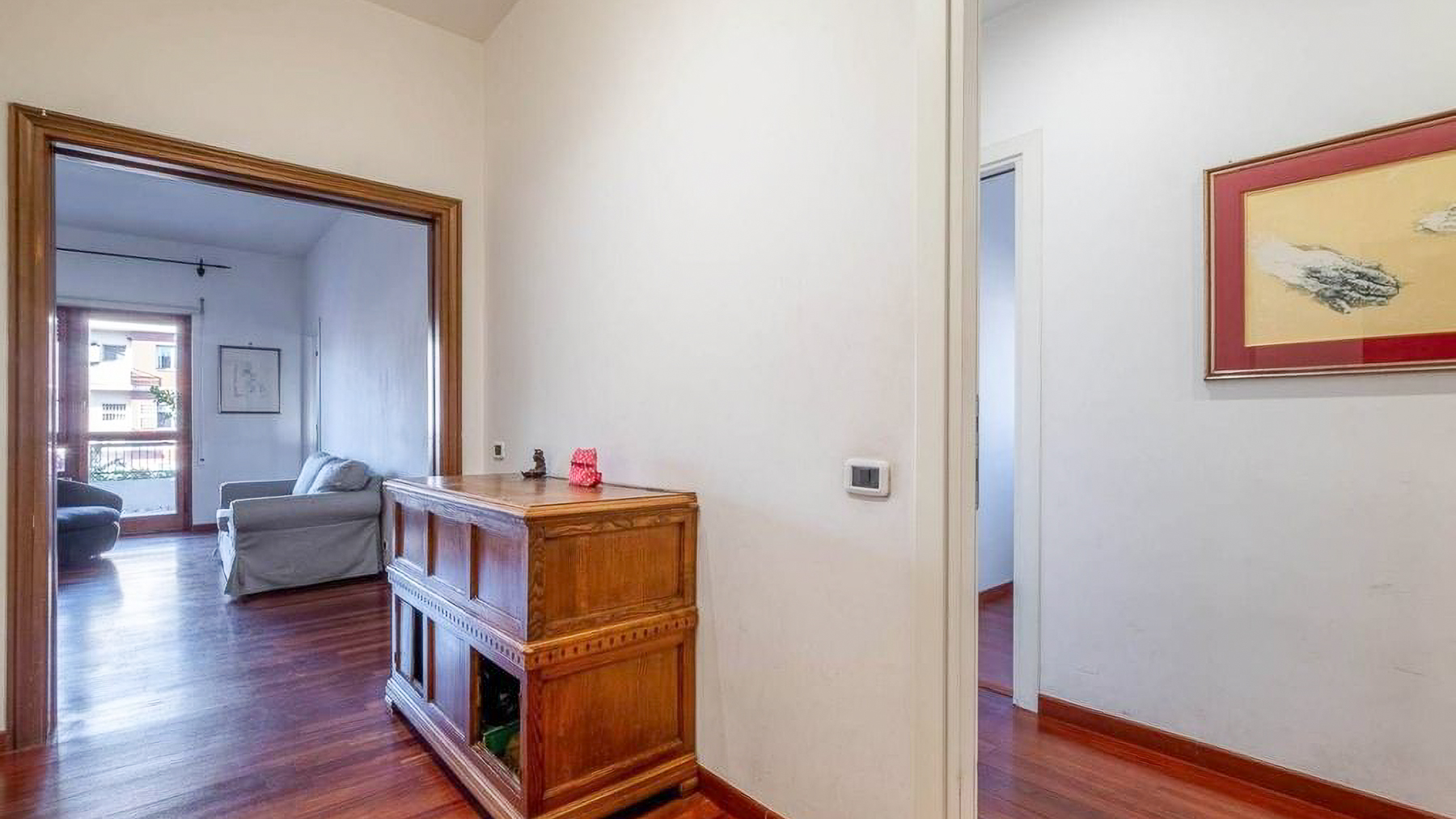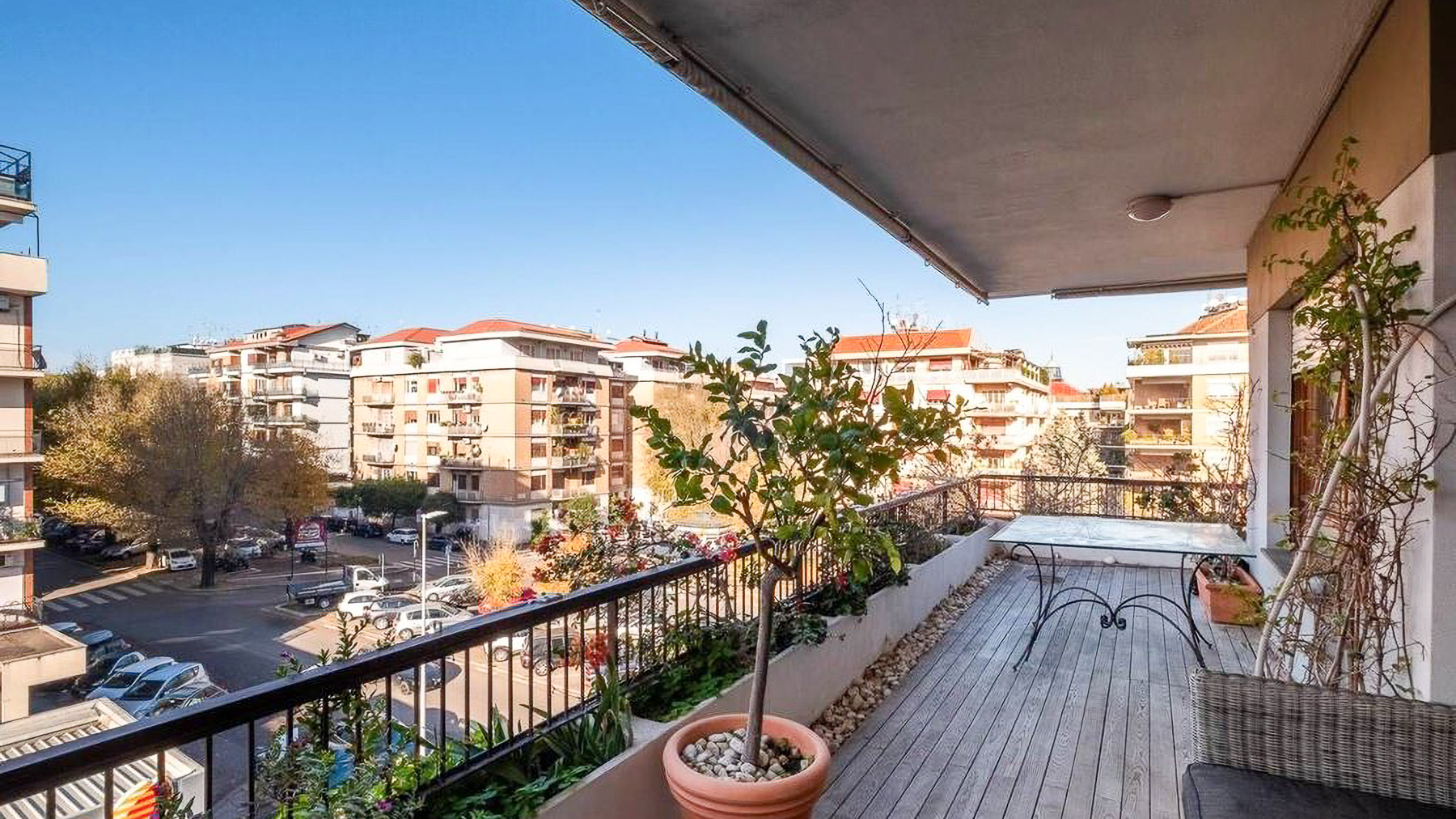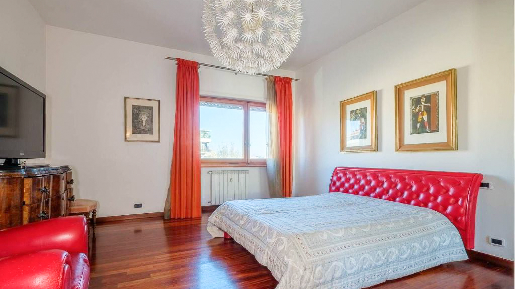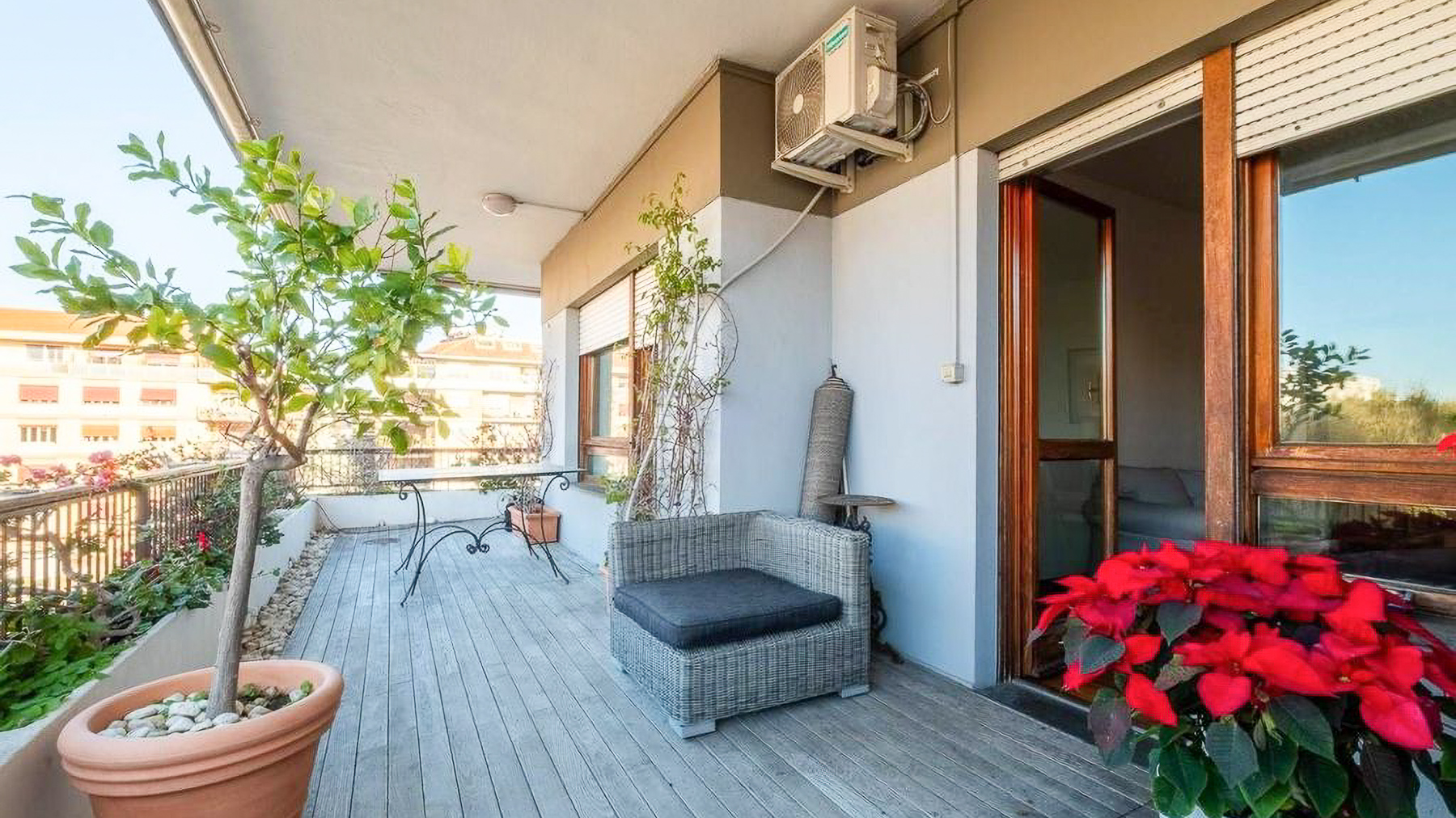 Perched in the heart of Rome, this exquisite property captivates with its blend of modern elegance and urban vibrancy. As sunlight streams through the expansive windows, the cityscape unfolds before you, offering a panorama of architectural beauty and the gentle hum of city life. Spanning 145 square meters, this stunning residence boasts five spacious rooms and two elegant bathrooms, providing ample space for comfort and sophistication. The centerpiece is a stylish living room, where a light blue couch complements an oval dark gray chair, inviting relaxation. A small round table with distinctive chairs enhances the room's charm, while a television and decorative items provide modern conveniences. The wooden flooring adds warmth to the ambiance. A terrace extends the living space, offering a perfect spot for enjoying the view of Rome’s enchanting skyline. Living here is an experience of daily indulgence. Picture yourself savoring a morning coffee on the terrace as the city awakens, or unwinding in the cozy living room after a day spent exploring Rome’s rich history. The vibrant lifestyle of the city is at your doorstep, yet the property offers a serene escape from the hustle and bustle. This residence is a testament to luxury and style, offering a rare opportunity to own a piece of urban paradise in Rome. It embodies the perfect harmony of opulence and modern living, making it a standout in the luxury real estate market.