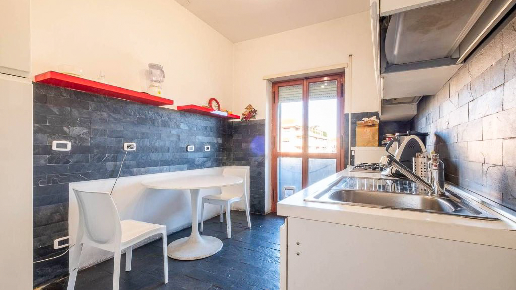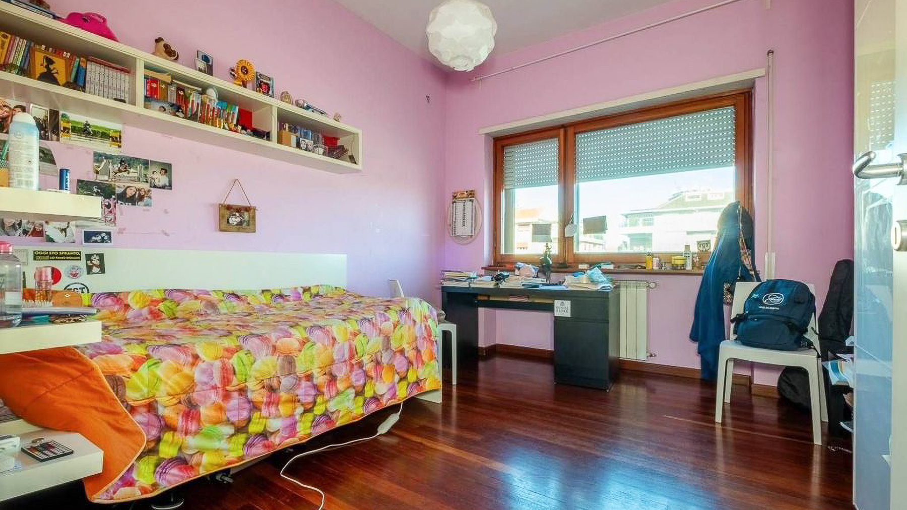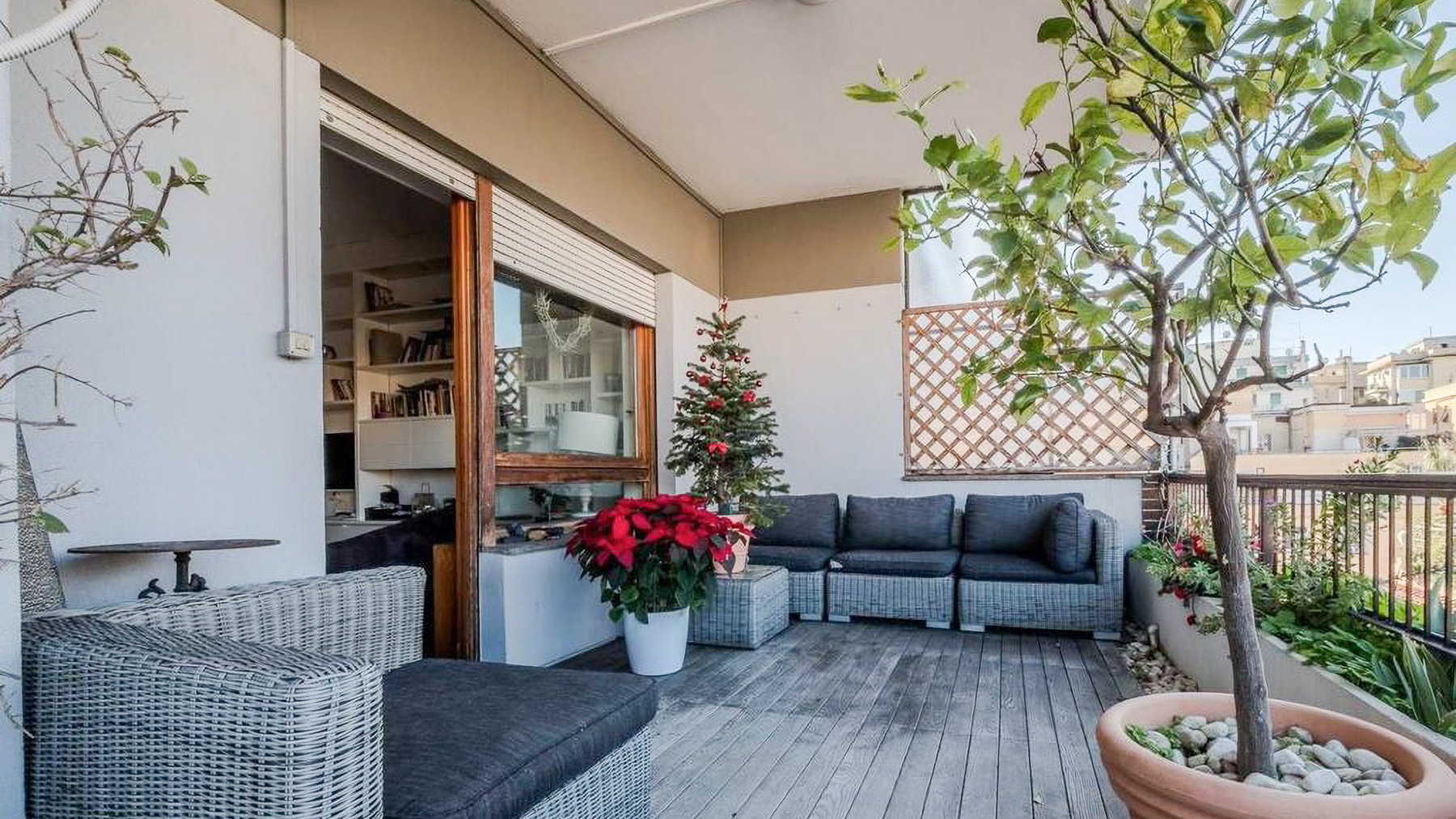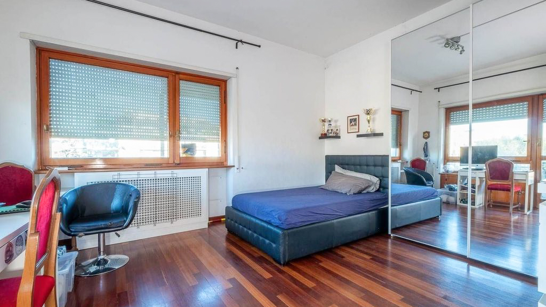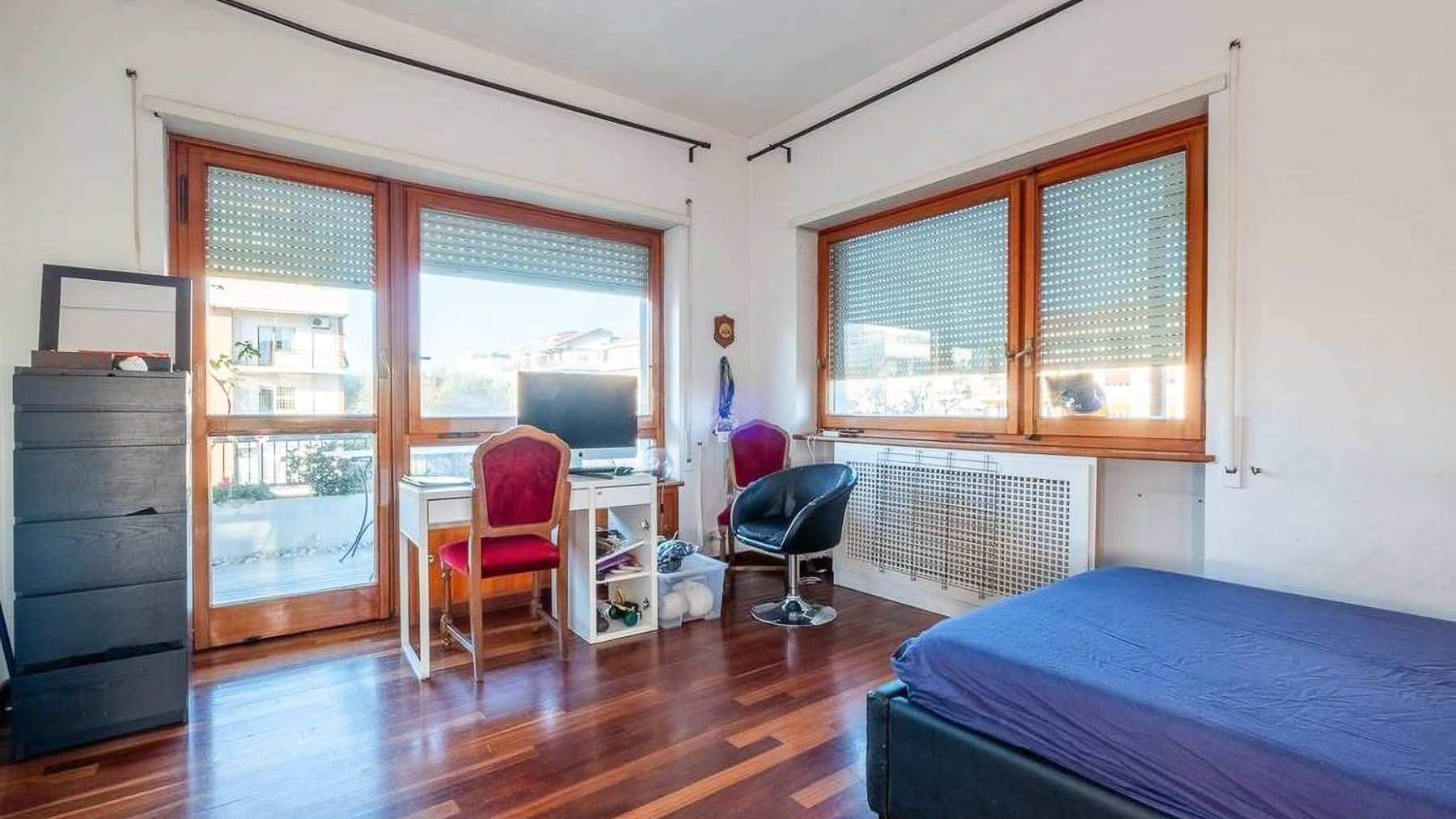Perched in the heart of Rome, this exquisite property captivates with its blend of modern elegance and urban vibrancy. As sunlight streams through the expansive windows, the cityscape unfolds before you, offering a panorama of architectural beauty and the gentle hum of city life. Spanning 145 square meters, this stunning residence boasts five spacious rooms and two elegant bathrooms, providing ample space for comfort and sophistication. The centerpiece is a stylish living room, where a light blue couch complements an oval dark gray chair, inviting relaxation. A small round table with distinctive chairs enhances the room's charm, while a television and decorative items provide modern conveniences. The wooden flooring adds warmth to the ambiance. A terrace extends the living space, offering a perfect spot for enjoying the view of Rome’s enchanting skyline. Living here is an experience of daily indulgence. Picture yourself savoring a morning coffee on the terrace as the city awakens, or unwinding in the cozy living room after a day spent exploring Rome’s rich history. The vibrant lifestyle of the city is at your doorstep, yet the property offers a serene escape from the hustle and bustle. This residence is a testament to luxury and style, offering a rare opportunity to own a piece of urban paradise in Rome. It embodies the perfect harmony of opulence and modern living, making it a standout in the luxury real estate market.