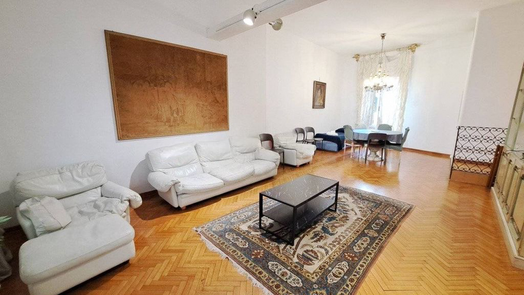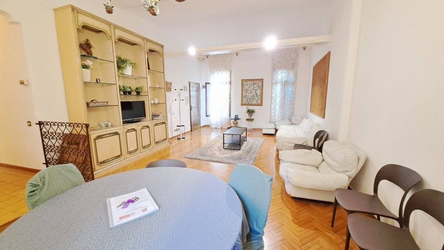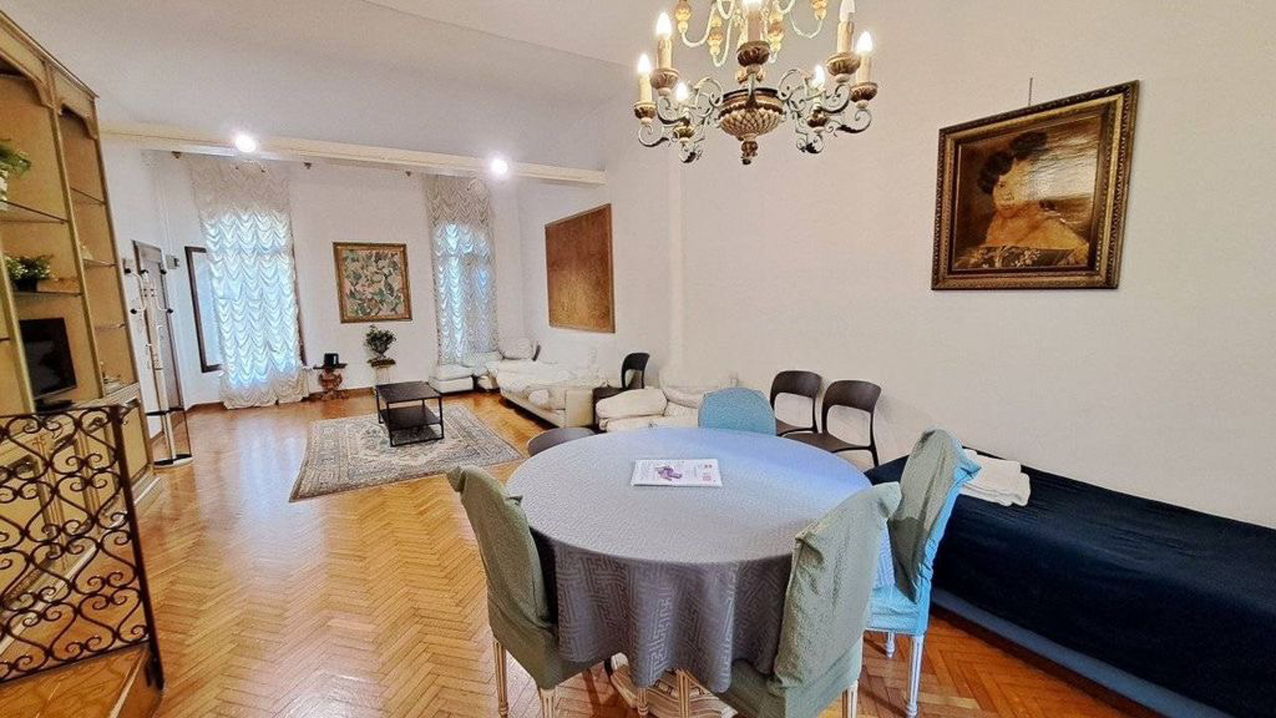 In the heart of enchanting Venice, where art and history meet, lies a residence that invites you into a world of elegance and modern charm. As sunlight filters through sheer curtains, the gentle ambiance of this home wraps around you, creating a sanctuary amidst the vibrant cityscape. Spanning 110 square meters, this exquisite property offers three thoughtfully designed rooms and a pristine bathroom. The interior is a blend of contemporary and cozy, featuring a spacious living area with a plush white sofa and a sleek black coffee table, all set upon a stylish patterned rug. The dining area, with its light blue table and chairs, sits adjacent to a built-in wooden shelf that doubles as a display unit and entertainment center. Light-colored walls and a herringbone-patterned wooden floor enhance the sense of space, while large windows bring in abundant natural light. Living here offers an unparalleled lifestyle that combines the serenity of your private retreat with the lively pulse of Venice. Imagine leisurely mornings sipping espresso as sunlight dances across the room, or intimate dinners surrounded by art and elegance. This home is more than just a dwelling; it's an experience of luxury in the city's heart. An oasis of sophistication and warmth, this property is a rare find in Venice. It provides an exquisite blend of modern living and timeless charm, ensuring it stands as a testament to refined taste and exclusivity.