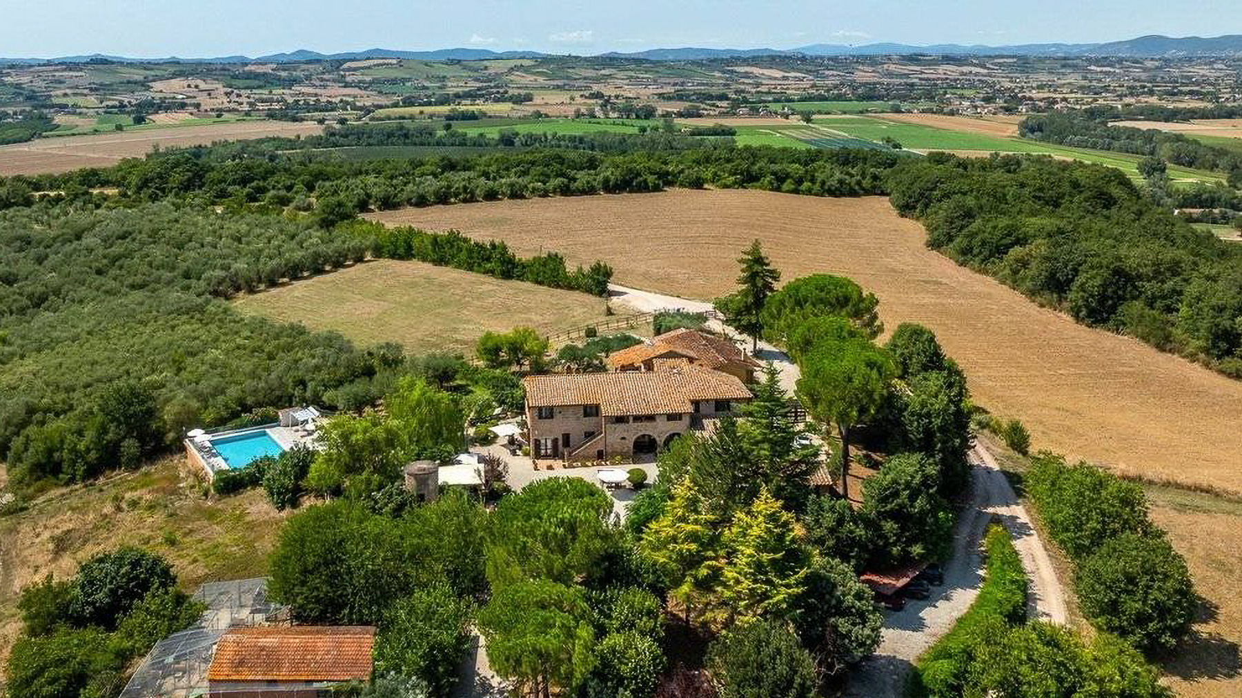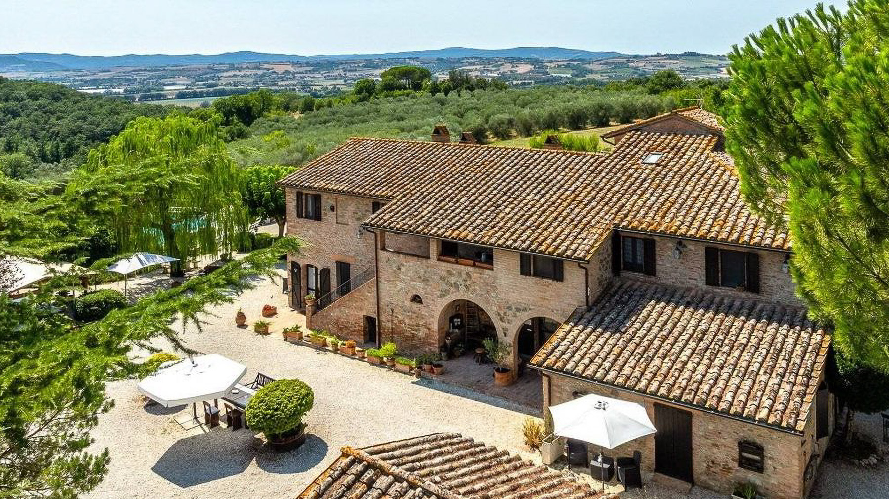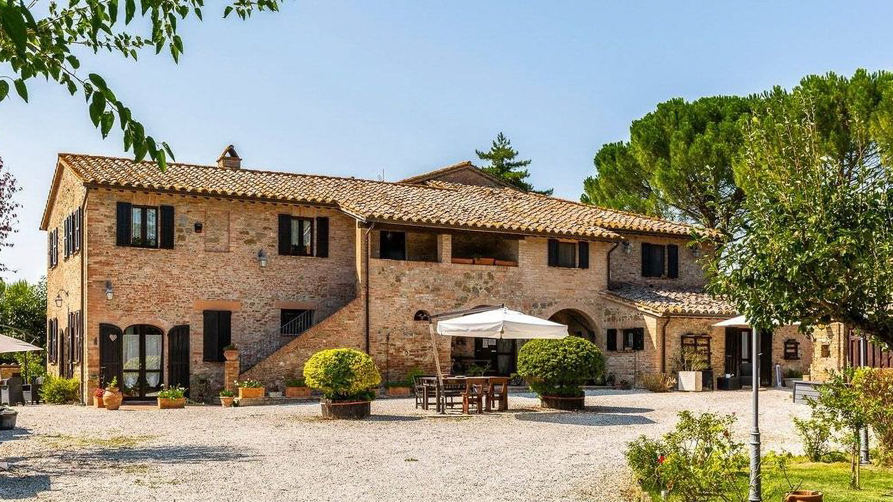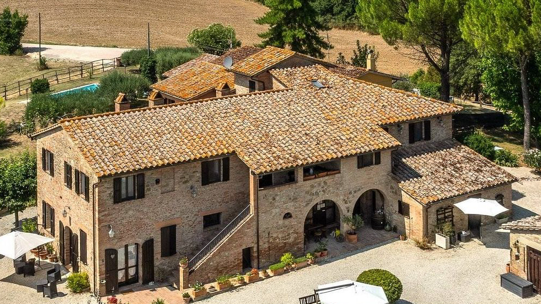 In the heart of Italy's verdant countryside, this enchanting property offers a sanctuary of peace and luxury. As you approach, the gentle rustling of leaves and the faint aroma of blooming flowers create a soothing symphony, inviting you to leave behind the hustle and bustle of daily life. Spanning an impressive 621 square meters, this rustic villa in Deruta, Perugia, captures the essence of Italian country living. With five spacious rooms and three elegantly designed bathrooms, it combines comfort with classic charm. The property boasts a private garden and a serene pool, set against a backdrop of open fields. The distinctive tiled roof and brick walls exude a timeless allure, while the outdoor seating areas under white umbrellas promise leisurely afternoons in nature's embrace. Here, life unfolds at a leisurely pace. Imagine days spent by the pool, surrounded by lush greenery, or evenings dining alfresco under a wooden canopy, the sky a canvas of stars. The serene countryside setting offers a lifestyle of tranquility, allowing you to reconnect with nature and yourself. This villa stands as a testament to the perfect blend of rustic charm and modern luxury—a rare find in the prestigious realm of luxury real estate.