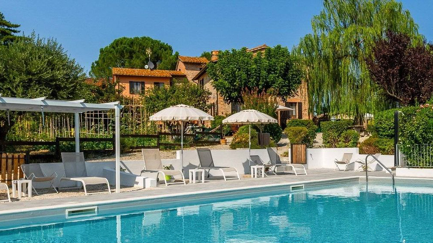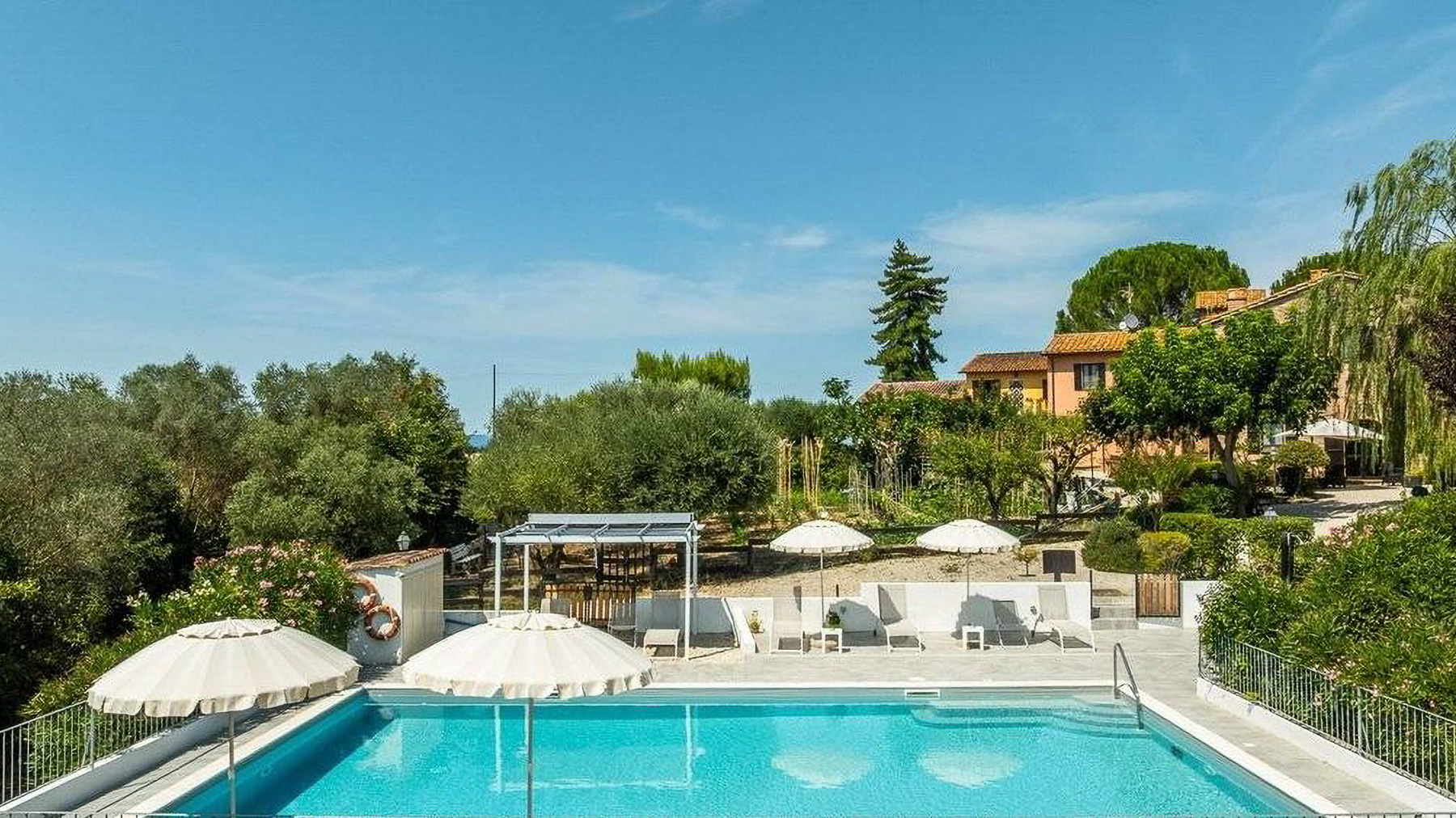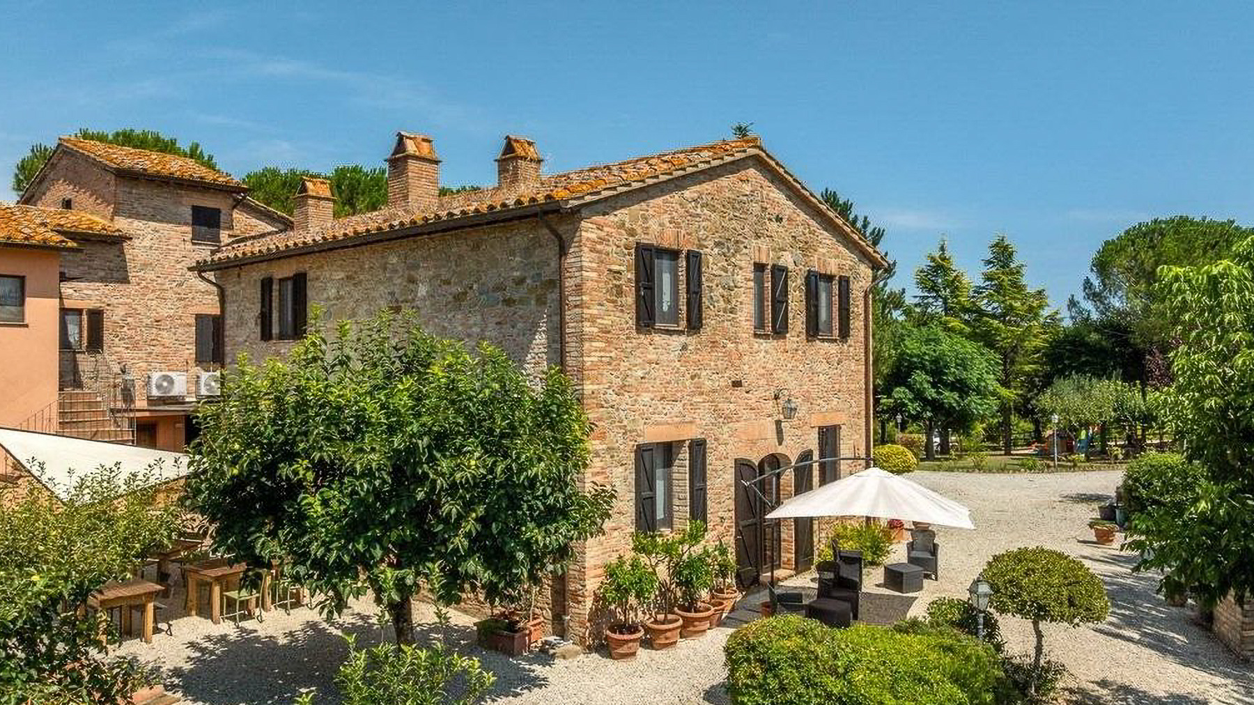 In the heart of Italy's verdant countryside, this enchanting property offers a sanctuary of peace and luxury. As you approach, the gentle rustling of leaves and the faint aroma of blooming flowers create a soothing symphony, inviting you to leave behind the hustle and bustle of daily life. Spanning an impressive 621 square meters, this rustic villa in Deruta, Perugia, captures the essence of Italian country living. With five spacious rooms and three elegantly designed bathrooms, it combines comfort with classic charm. The property boasts a private garden and a serene pool, set against a backdrop of open fields. The distinctive tiled roof and brick walls exude a timeless allure, while the outdoor seating areas under white umbrellas promise leisurely afternoons in nature's embrace. Here, life unfolds at a leisurely pace. Imagine days spent by the pool, surrounded by lush greenery, or evenings dining alfresco under a wooden canopy, the sky a canvas of stars. The serene countryside setting offers a lifestyle of tranquility, allowing you to reconnect with nature and yourself. This villa stands as a testament to the perfect blend of rustic charm and modern luxury—a rare find in the prestigious realm of luxury real estate.