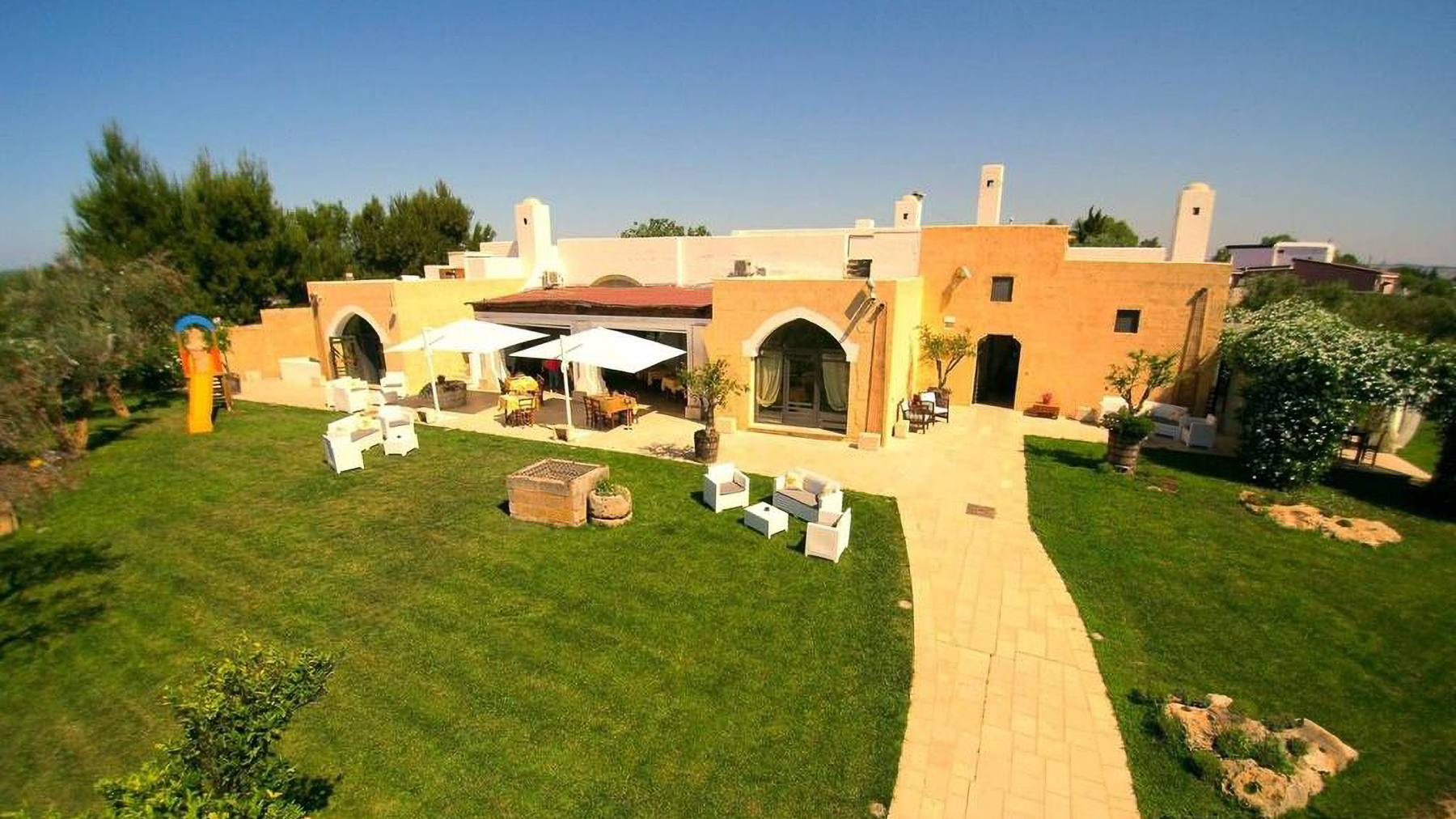 In the serene embrace of Gallipoli's countryside, a magnificent property awaits, bathed in the gentle glow of ambient lights and the tranquil whispers of nature. This unique residence seamlessly blends rustic charm with contemporary elegance, inviting you to experience the ultimate in comfort and style. Under a canopy of stars, the outdoor space becomes a magical setting, perfect for intimate gatherings or peaceful solitude. Spanning an impressive 750 square meters, this exquisite home offers five spacious rooms and three elegant bathrooms, providing ample space for family and guests. The property boasts a private garden, a lush oasis where you can unwind amidst verdant greenery, and a terrace that promises breathtaking views of the surrounding landscape. Its traditional architecture, adorned with arched windows and doors, speaks of timeless beauty, while the strategic location in Gallipoli, Lecce, ensures both privacy and convenience. Imagine mornings spent savoring coffee on the terrace, the sun's warm rays gently awakening the day. Picture yourself hosting vibrant celebrations on the expansive lawn, where children play joyously on the slide, and adults enjoy leisurely conversations under the large umbrellas. This is a home where every corner tells a story, where every moment is an opportunity to create cherished memories. This property is not just a home