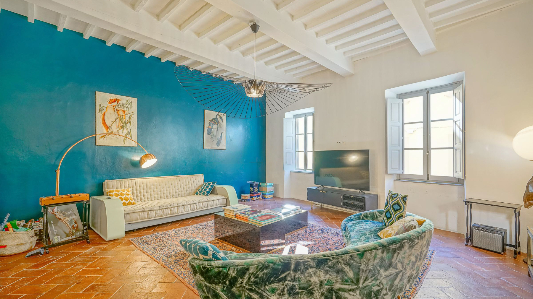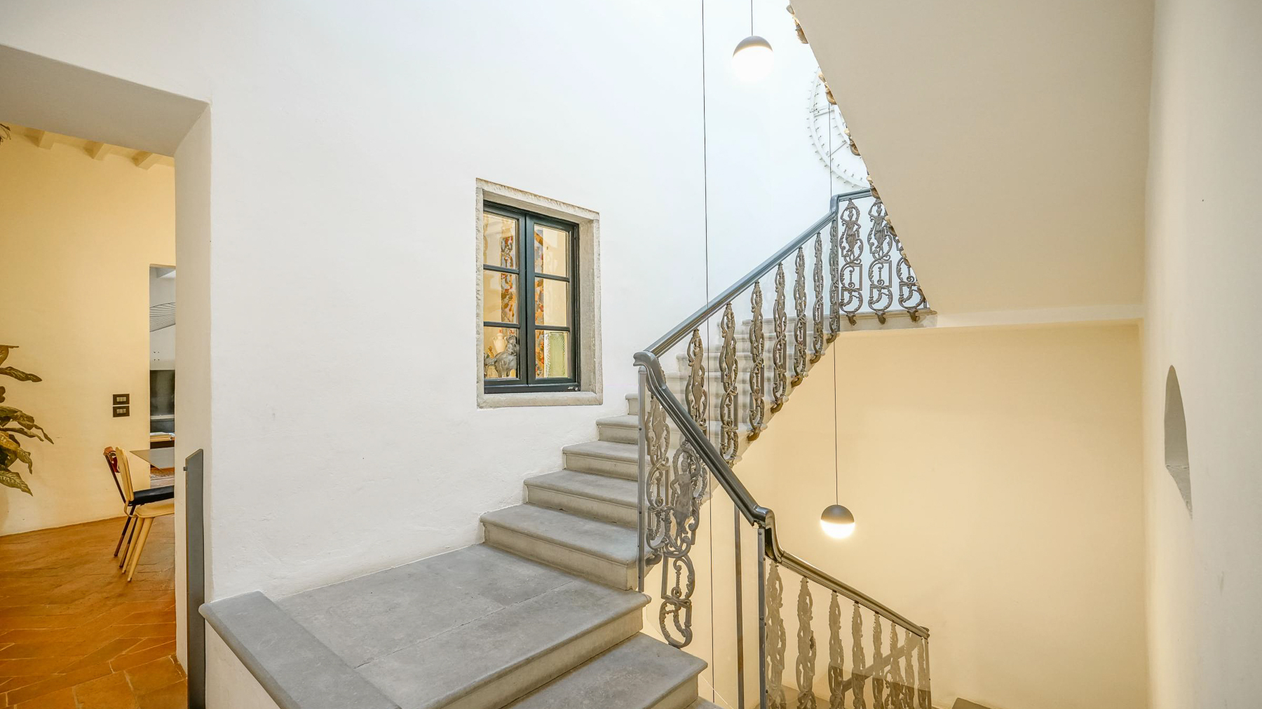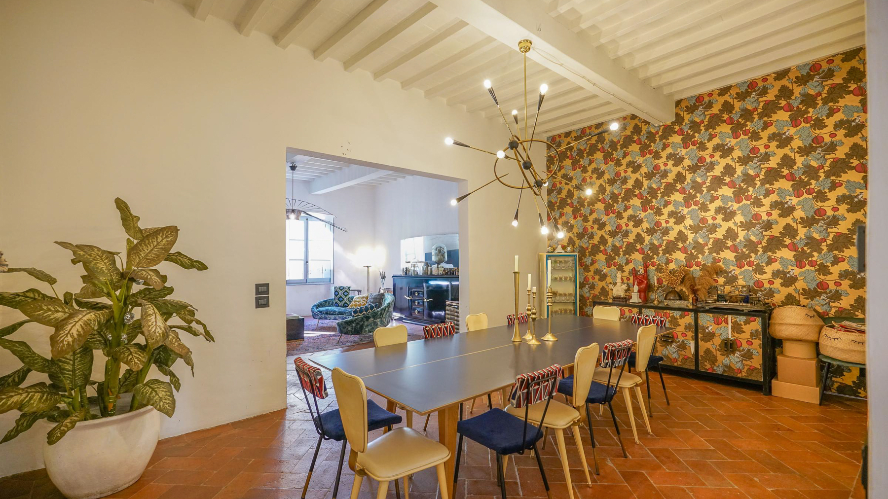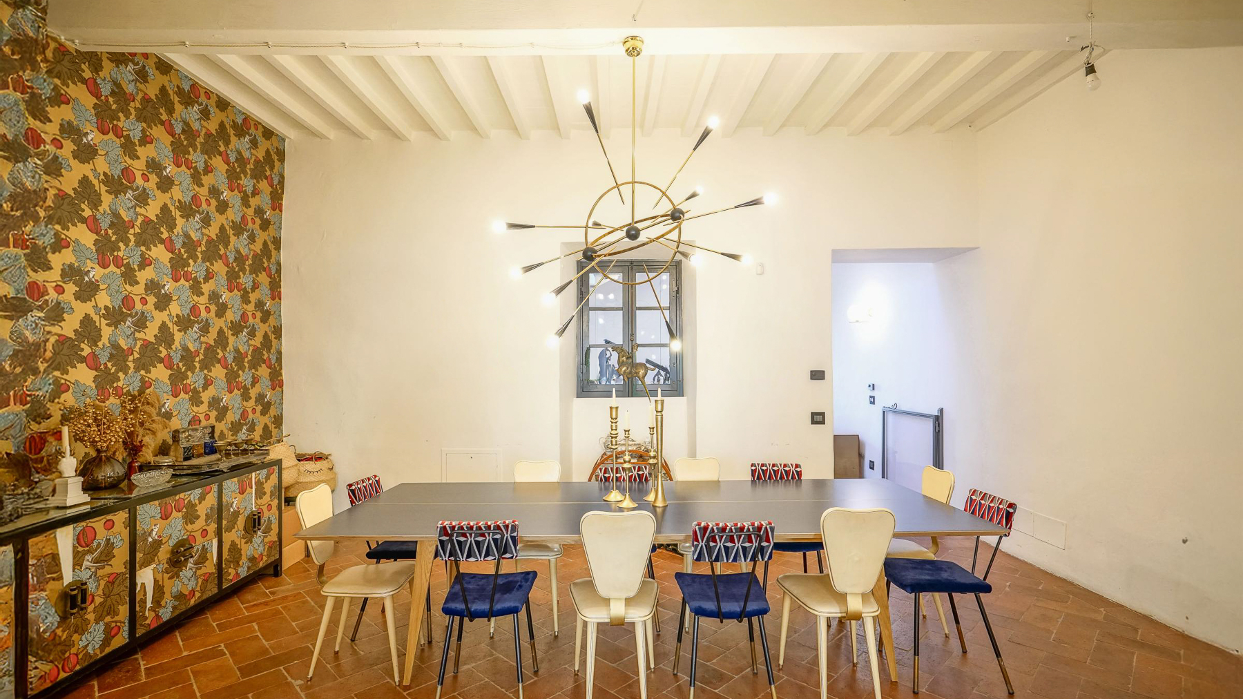 Tucked away in the vibrant heart of Arezzo, this exquisite residence is a sanctuary of style and sophistication. Imagine stepping into a world where modern elegance meets vintage charm, bathed in natural light streaming through open shutters. The soothing blue walls, exposed beams, and unique light fixtures create a captivating atmosphere, inviting you to unwind and indulge your senses. Spanning a generous 340 square meters, this luxurious property boasts seven beautifully appointed rooms and five stylish bathrooms. Each room is a masterpiece, thoughtfully designed to blend contemporary flair with timeless allure. The spacious interiors flow seamlessly into a private garden and a stunning terrace, perfect for hosting gatherings or savoring quiet moments of solitude. Located in the bustling city life of Arezzo, this property offers a unique blend of urban convenience and serene living. Picture yourself lounging in the chic living room, surrounded by a harmonious mix of modern and vintage decor. The plush sofas and vibrant artwork set the stage for delightful conversations, while the patterned rug adds warmth and character. Step outside to the terrace, where the cityscape unfolds before you, offering breathtaking views and the promise of unforgettable alfresco dinners under the stars. This extraordinary dwelling epitomizes the pinnacle of luxury living. It's a rare jewel that perfectly combines contemporary design with timeless sophistication—a true testament to elegance and comfort in the heart of Arezzo.