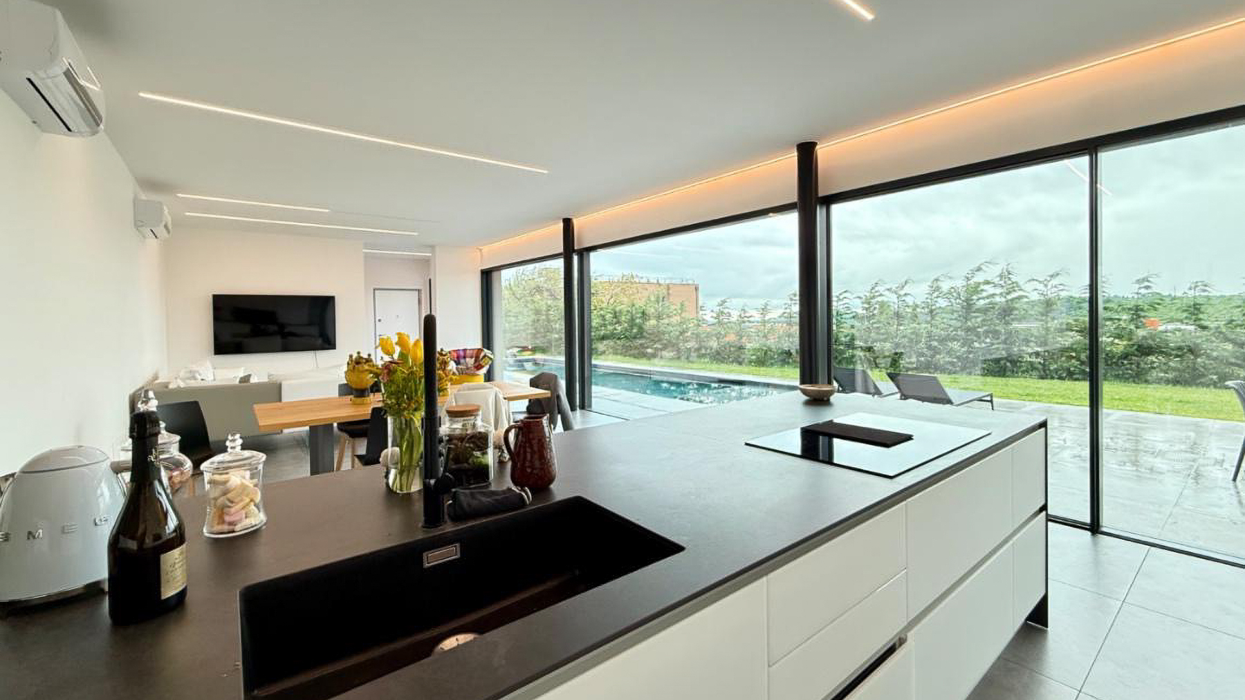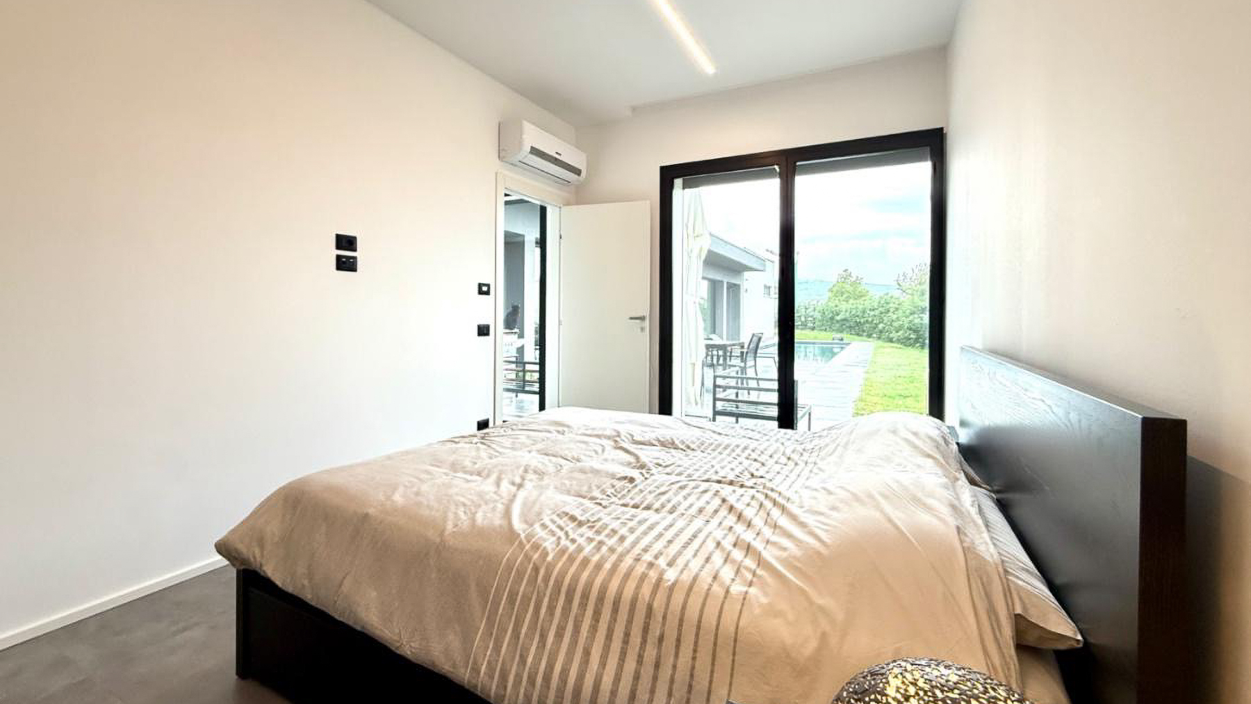 Perched amidst the serene beauty of Affi, Verona, this architectural marvel offers an oasis of modern luxury and nature's tranquility. Imagine waking up to the gentle rustle of leaves and the warm embrace of sunlight streaming through expansive glass walls, framing picturesque views of lush greenery and the inviting outdoor pool. Spanning an impressive 320 square meters, this elegant home boasts five spacious rooms and four luxurious bathrooms. Its distinctive flat roof is adorned with solar panels, epitomizing sustainable living. The minimalist interior design, featuring a bright and airy bedroom with direct access to a charming patio, seamlessly blends comfort and style. The property is complemented by a private garden, providing a tranquil retreat in the heart of the countryside. Living here is an experience of unparalleled peace and refinement. Picture yourself unwinding by the pool, surrounded by nature's symphony, or enjoying leisurely afternoons in the sun-drenched garden. This home is a sanctuary where elegance meets the simplicity of rural life. A rare find in the luxury real estate market, this property is a testament to modern design and environmental harmony, promising a lifestyle of exclusivity and sophistication.
