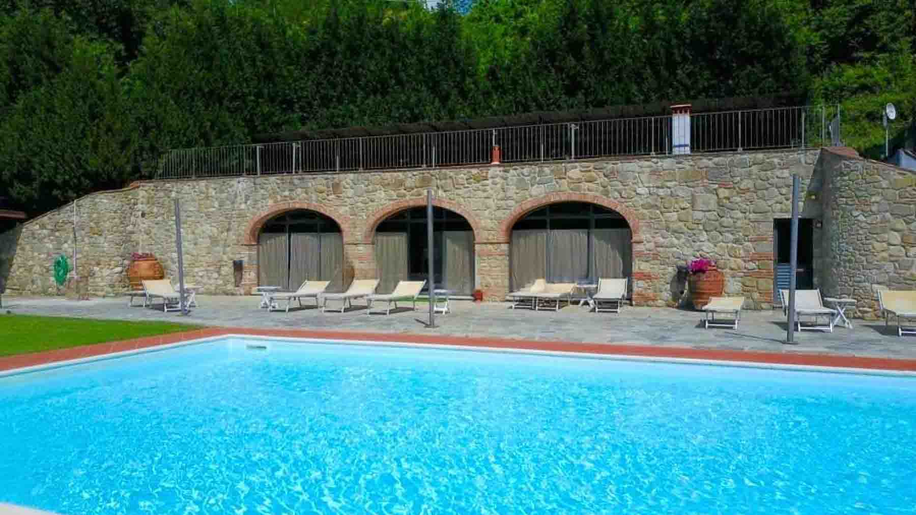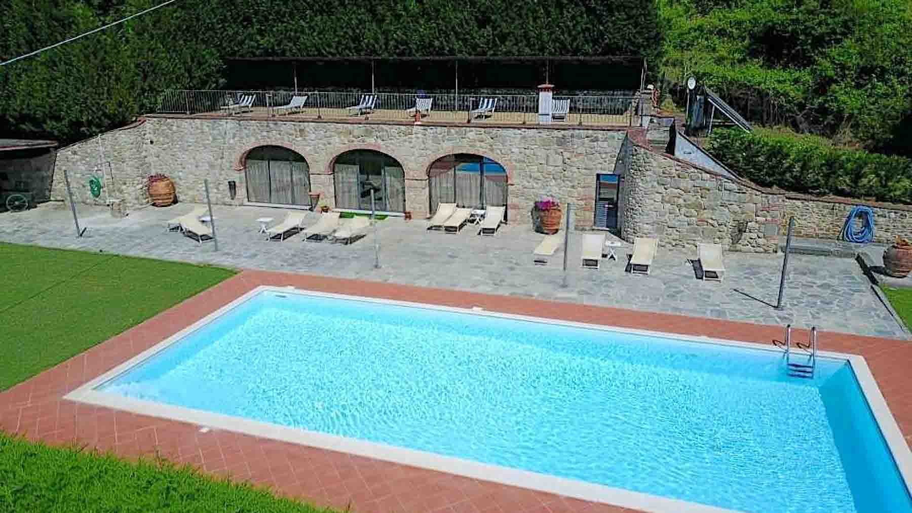 Tucked amidst the enchanting Italian countryside, this magnificent stone villa emerges as a sanctuary of peace and opulence. The gentle rustle of leaves and the soft chirping of birds create a symphony of nature, enveloping you in a serene embrace. Sunlight dances off the rustic stone and yellow walls, while the scent of blooming flowers fills the air, inviting you to explore further. Sprawling across 2600 square meters, this exquisite estate in Castelfranco Piandiscò, Arezzo, boasts 15 spacious rooms and 12 luxurious bathrooms. The villa harmoniously blends traditional elegance with modern amenities, featuring a private garden and a shimmering pool. The architecture, with its arched doorways and tiled roof, is a testament to the region's timeless charm, offering a picturesque retreat in the heart of the countryside. Imagine waking up to the gentle whispers of the wind and savoring your morning coffee amidst the lush greenery of your private garden. Spend afternoons by the pool, where the tranquil setting provides the perfect backdrop for relaxation. Evenings bring the opportunity to gather with loved ones, sharing stories and laughter under a canopy of stars in this idyllic haven. This villa is a true masterpiece of luxury living, where elegance and comfort converge. It offers an unparalleled opportunity to own a piece of Italy's rich heritage, a rare find in the exclusive world of luxury real estate.