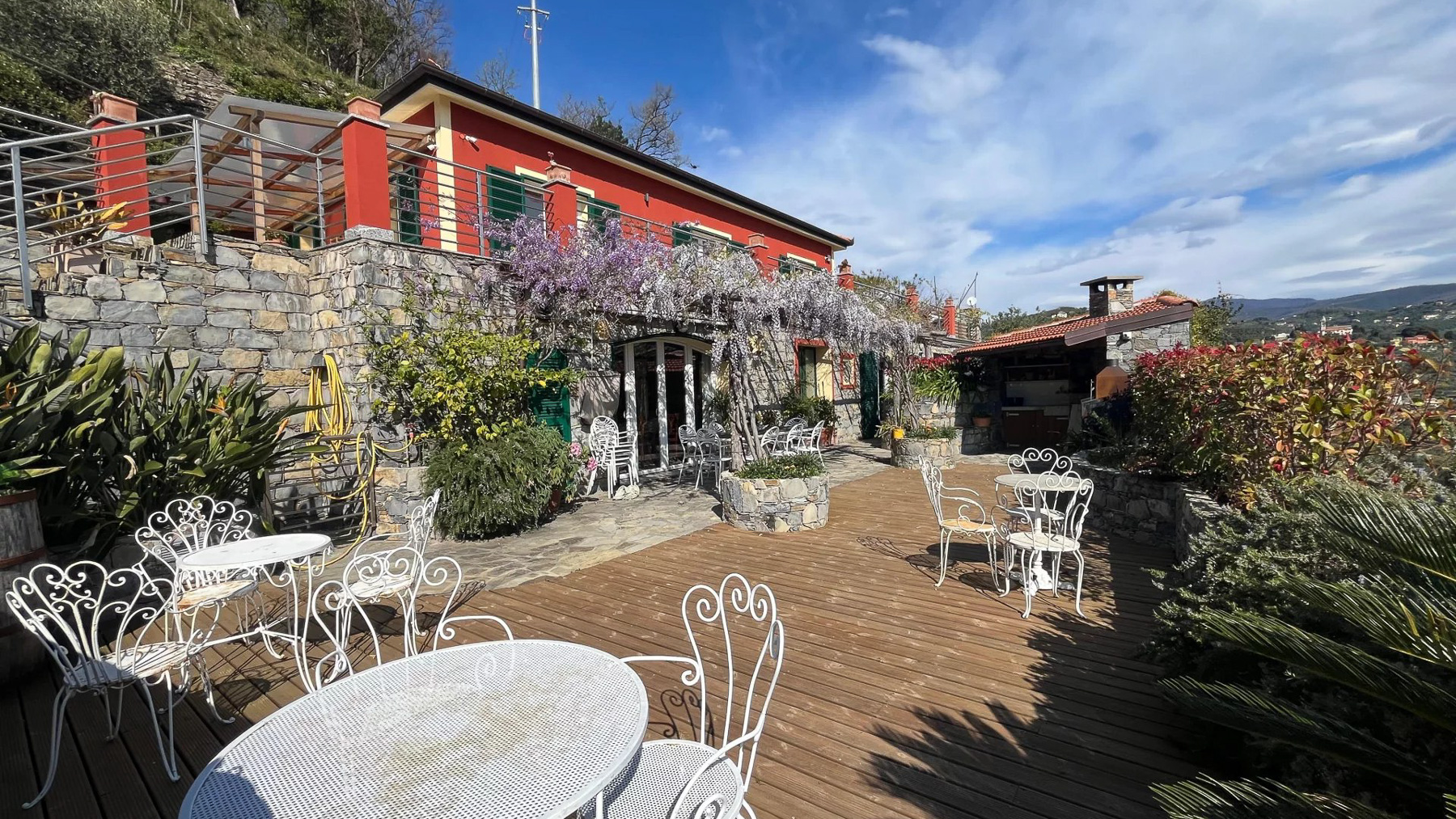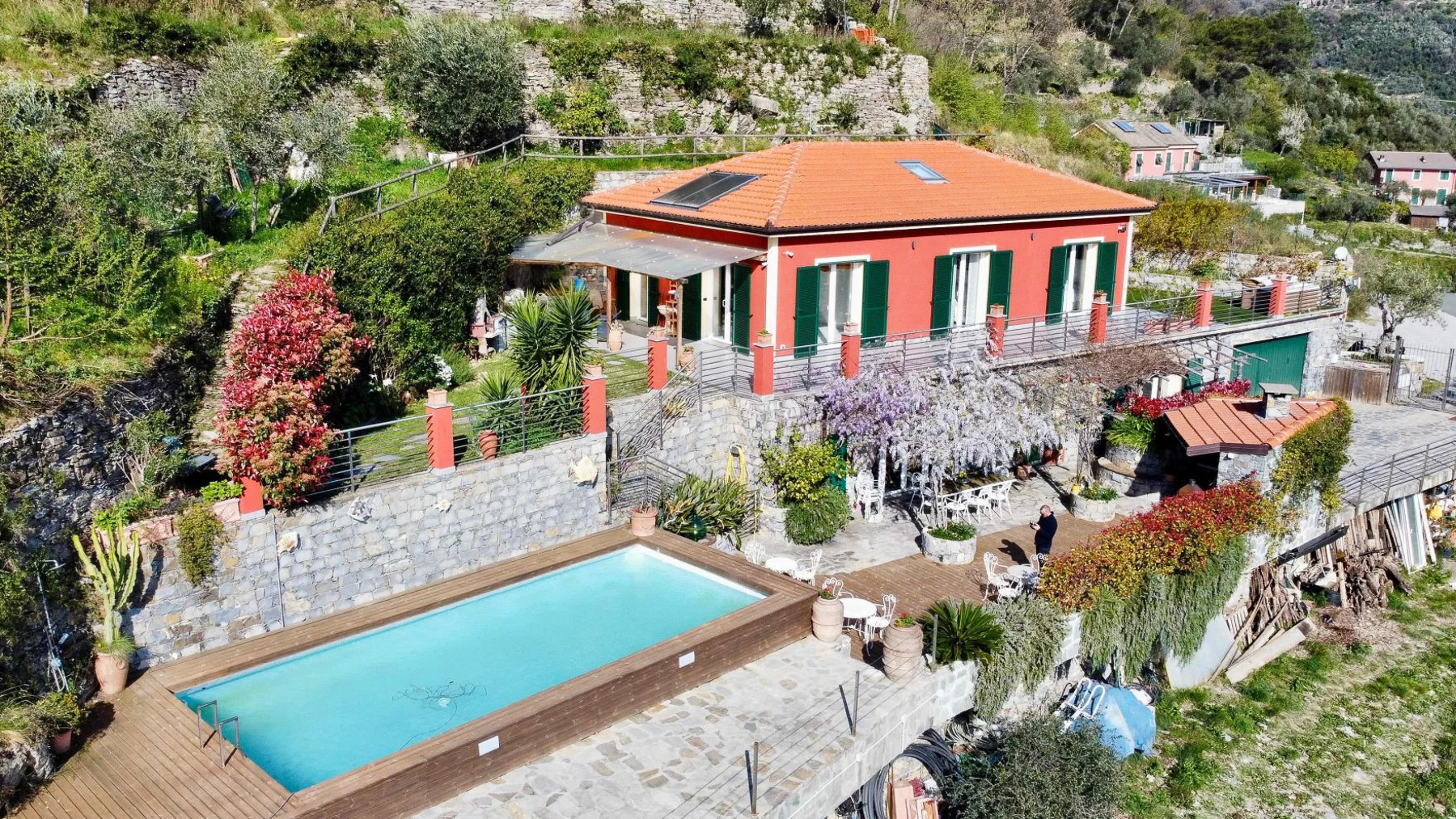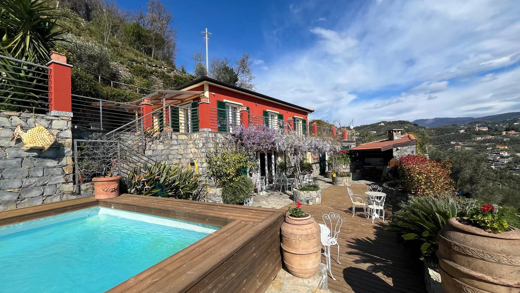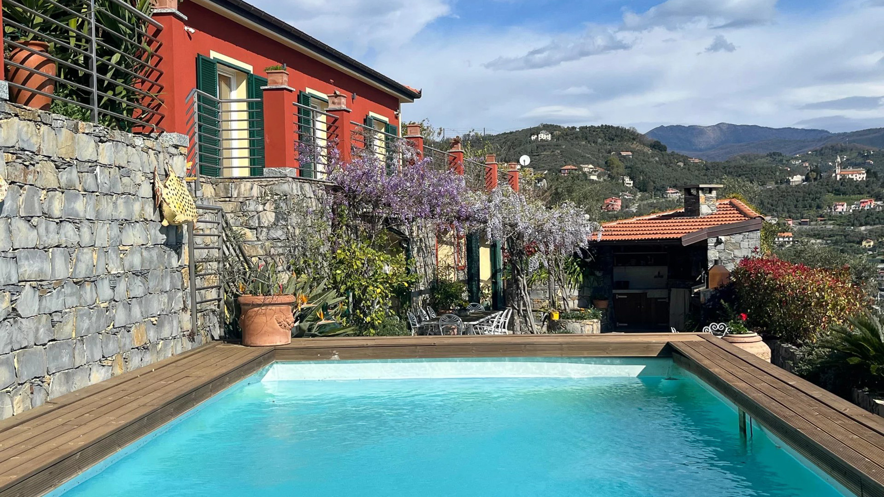 Perched on a picturesque hillside, this stunning red house with its charming green shutters stands as an oasis of serenity and luxury. The gentle rustle of leaves and the soothing sounds of nature envelop you as you step into this tranquil retreat. Bathed in sunlight, the property offers breathtaking views that stretch over lush landscapes and distant mountains, promising an unforgettable experience. Spanning 251 square meters, this exquisite residence boasts eight spacious rooms and four elegant bathrooms. Located in the enchanting town of Chiavari, Genova, the property is a testament to refined living. Distinctive features such as a private swimming pool and a state-of-the-art gym cater to your every comfort and leisure need. The bright, modern kitchen and dining area open seamlessly to the outdoors, inviting the warm embrace of the Italian sun and the refreshing sea breeze, creating an ideal setting for both relaxation and entertainment. Imagine mornings spent lounging on the wooden deck, sipping coffee as the sun rises over the horizon. Afternoons are perfect for a refreshing dip in the pool or a leisurely stroll through the landscaped gardens, where vibrant flowers and lush greenery create a symphony of colors and scents. As evening falls, the outdoor seating area transforms into a magical venue for dining under the stars, with the mountains as your backdrop. This extraordinary property is not just a home; it is a sanctuary of elegance and comfort. A rare gem in the luxury real estate market, it offers an unparalleled lifestyle where timeless beauty meets modern sophistication.