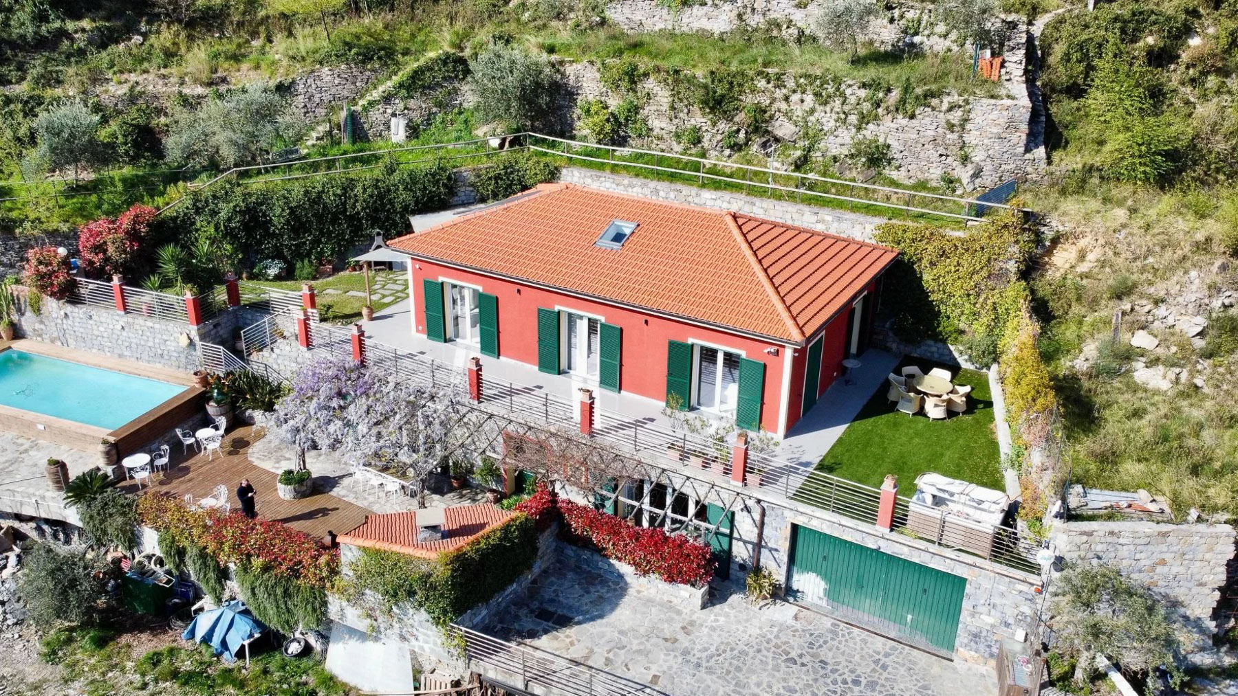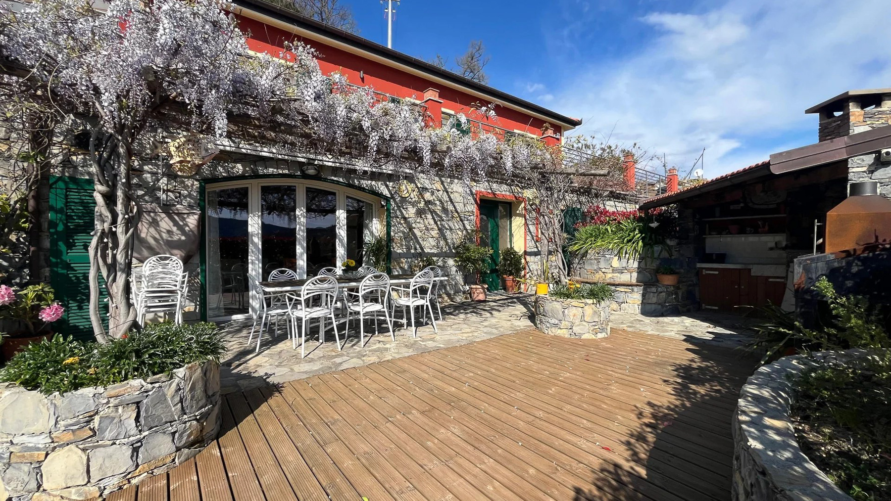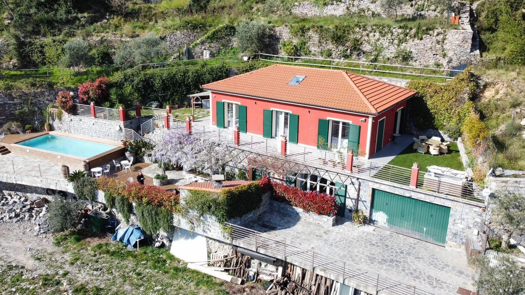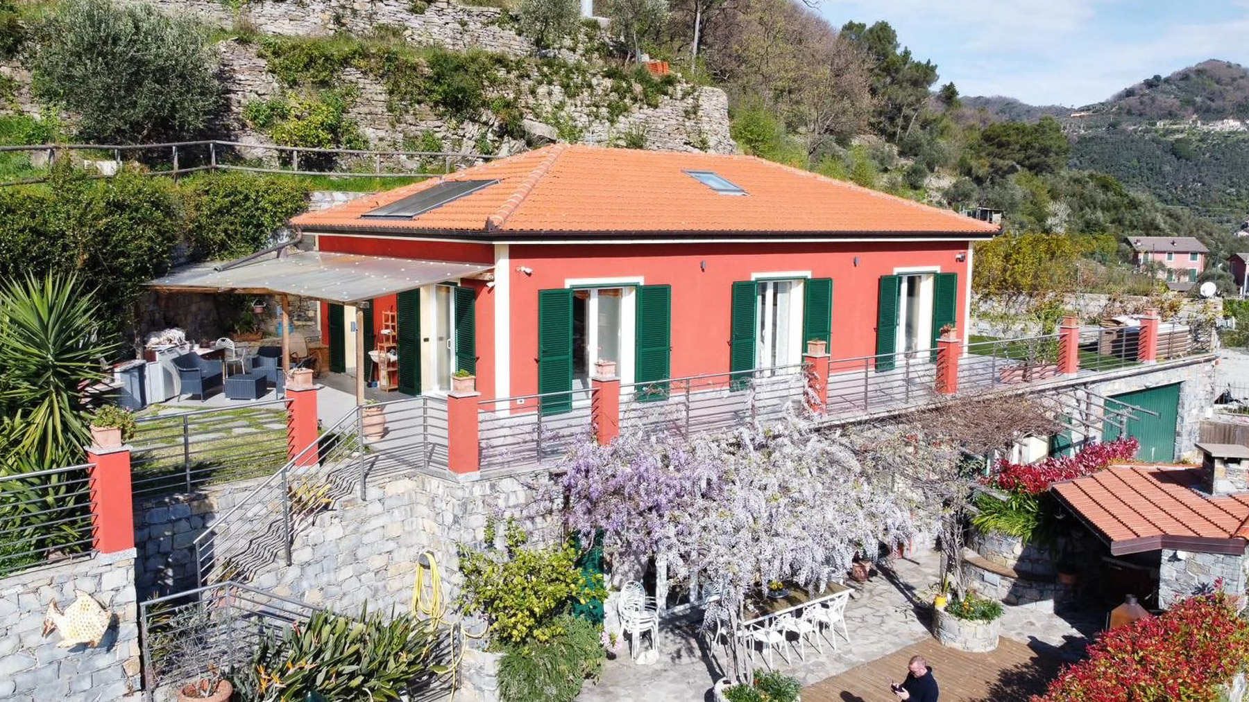 Perched on a picturesque hillside, this stunning red house with its charming green shutters stands as an oasis of serenity and luxury. The gentle rustle of leaves and the soothing sounds of nature envelop you as you step into this tranquil retreat. Bathed in sunlight, the property offers breathtaking views that stretch over lush landscapes and distant mountains, promising an unforgettable experience. Spanning 251 square meters, this exquisite residence boasts eight spacious rooms and four elegant bathrooms. Located in the enchanting town of Chiavari, Genova, the property is a testament to refined living. Distinctive features such as a private swimming pool and a state-of-the-art gym cater to your every comfort and leisure need. The bright, modern kitchen and dining area open seamlessly to the outdoors, inviting the warm embrace of the Italian sun and the refreshing sea breeze, creating an ideal setting for both relaxation and entertainment. Imagine mornings spent lounging on the wooden deck, sipping coffee as the sun rises over the horizon. Afternoons are perfect for a refreshing dip in the pool or a leisurely stroll through the landscaped gardens, where vibrant flowers and lush greenery create a symphony of colors and scents. As evening falls, the outdoor seating area transforms into a magical venue for dining under the stars, with the mountains as your backdrop. This extraordinary property is not just a home; it is a sanctuary of elegance and comfort. A rare gem in the luxury real estate market, it offers an unparalleled lifestyle where timeless beauty meets modern sophistication.