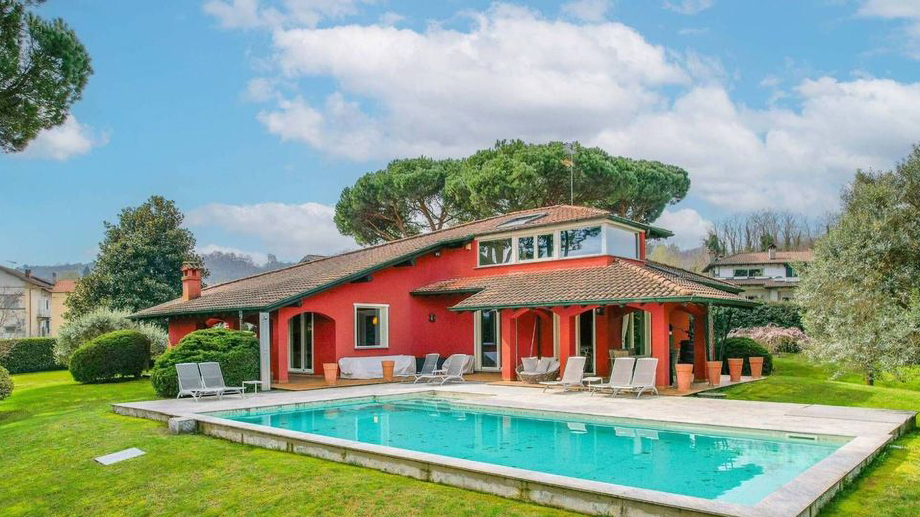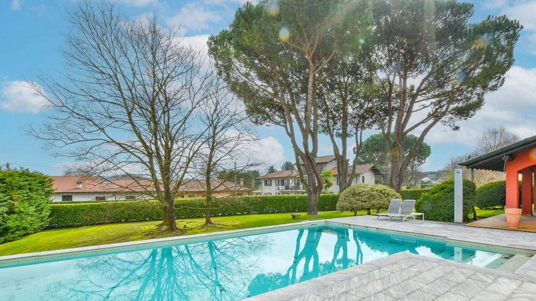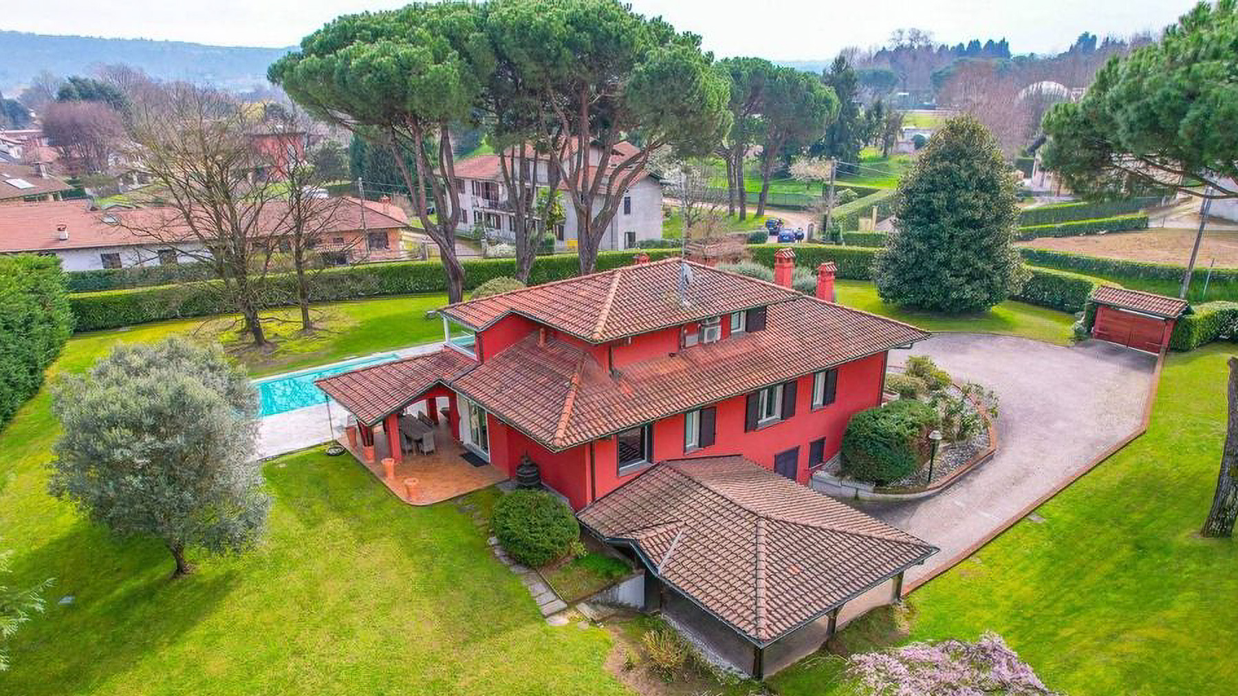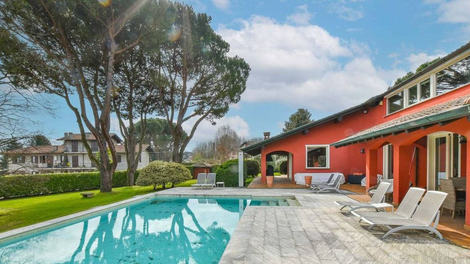 Amidst the serene backdrop of Dormelletto, this exquisite modern residence invites you into a world of vibrant elegance. The striking red exterior, set against a tapestry of lush greenery and gentle, partly cloudy skies, creates a captivating scene. The tranquil sounds of water lapping at the pool's edge and the inviting scent of blooming gardens beckon you to explore further. Spanning 270 square meters, this single-story masterpiece offers a harmonious blend of luxury and comfort. With five spacious rooms and three elegantly designed bathrooms, every corner of this home reflects sophisticated style. The expansive private garden and pristine pool provide the perfect setting for relaxation and entertainment. Large windows flood the interior with natural light, enhancing the welcoming ambiance of this remarkable property located in the charming town of Dormelletto, Novara. Imagine the joy of lounging by the pool on a warm afternoon, surrounded by the beauty of meticulously landscaped gardens. This home offers an idyllic lifestyle, where days are filled with sunlit leisure and evenings bring the allure of poolside gatherings under a starlit sky. This distinctive property embodies the pinnacle of luxury living, a rare find that seamlessly combines contemporary design with the tranquility of nature. It stands as a testament to refined elegance, offering a unique sanctuary for those who seek the extraordinary.