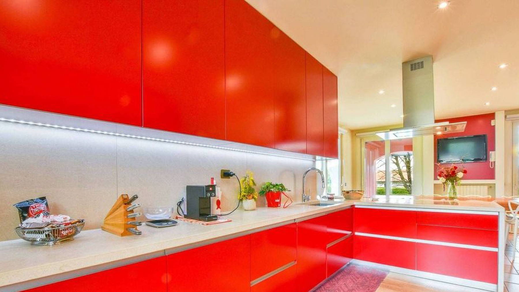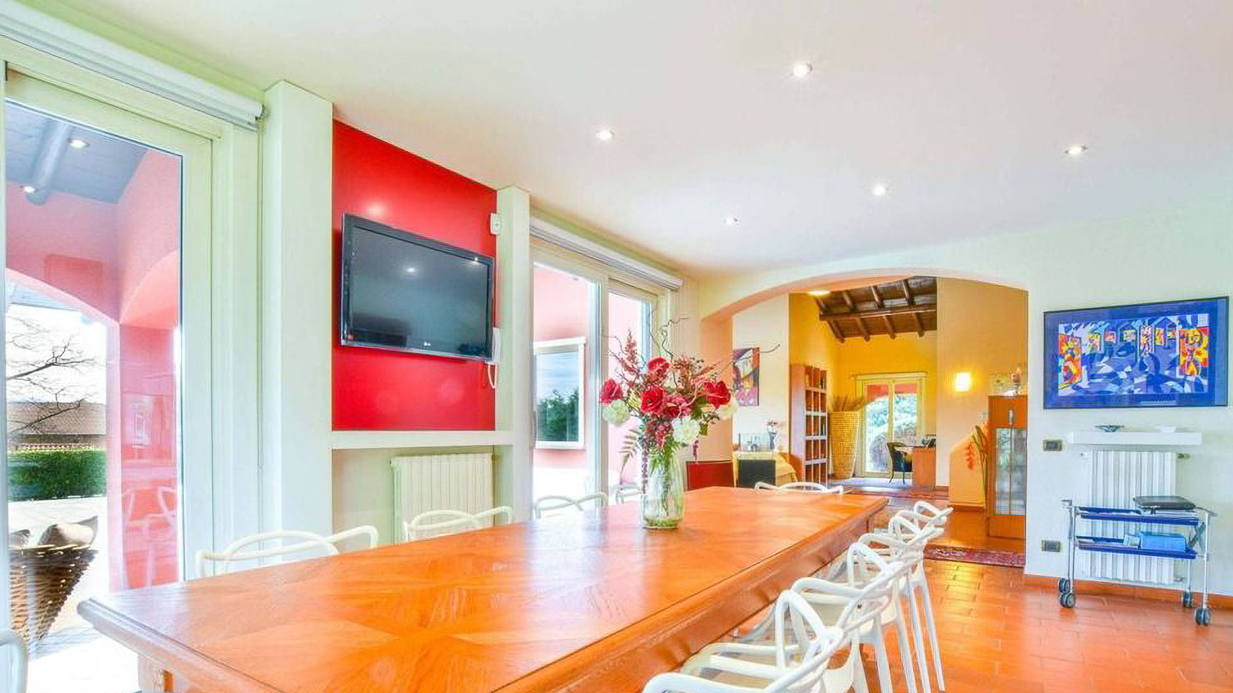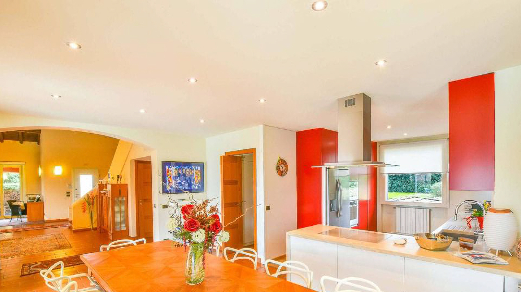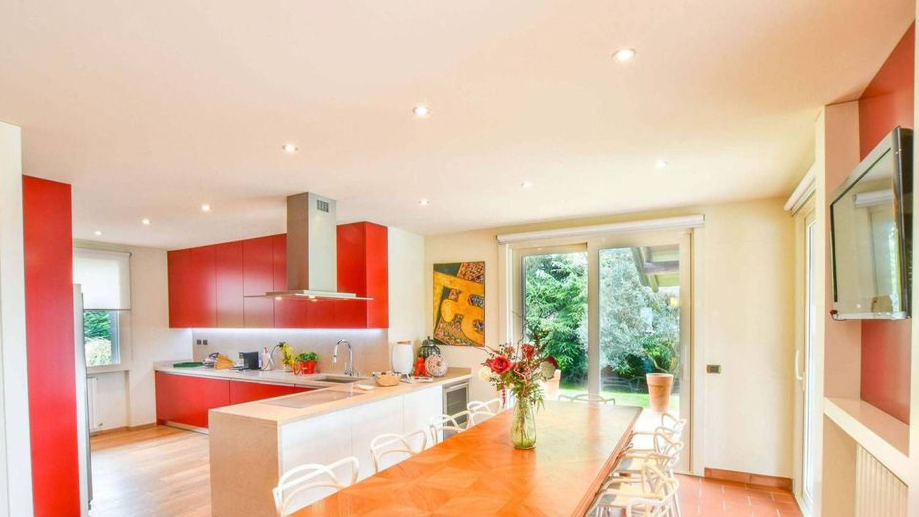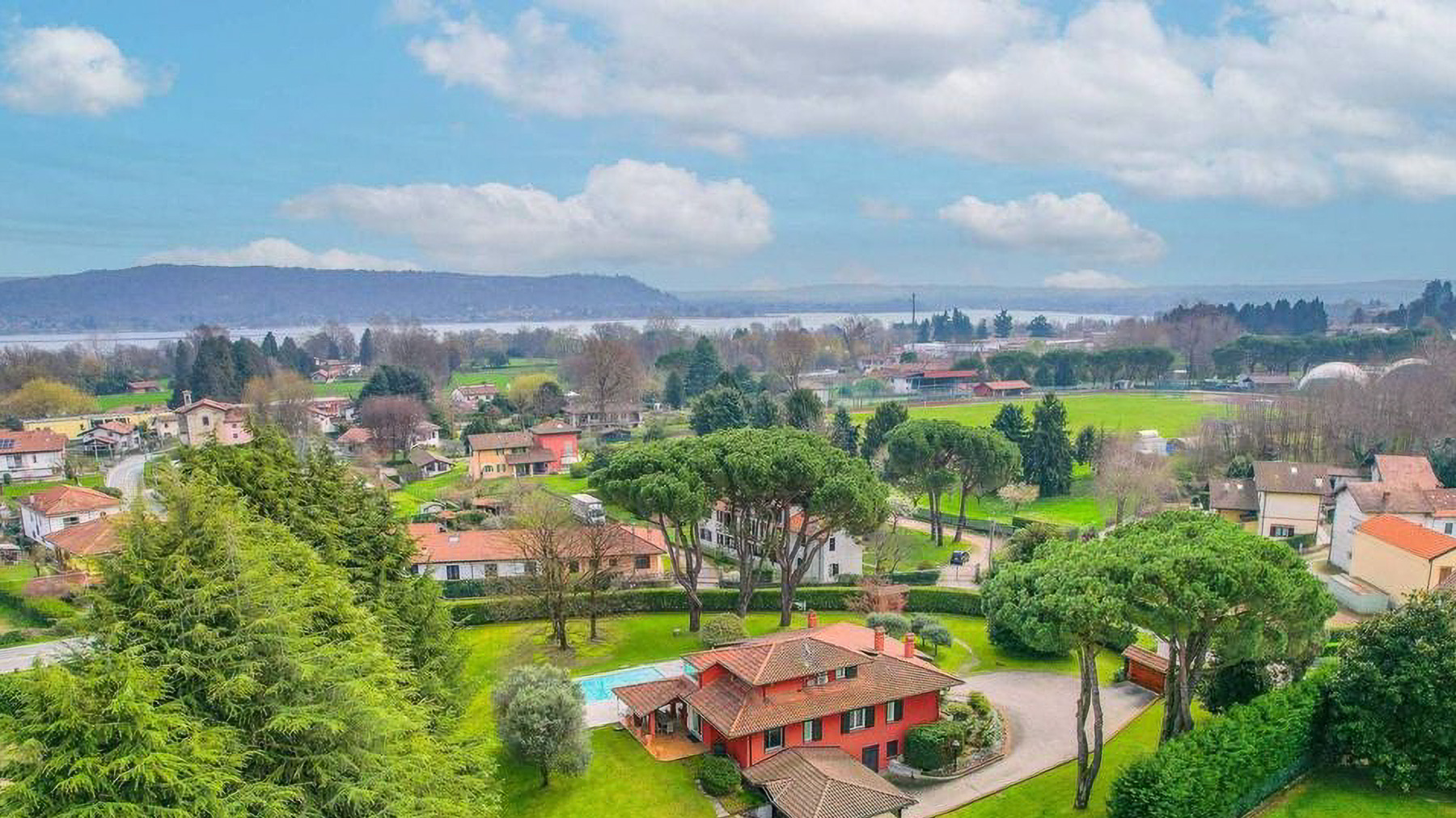 Amidst the serene backdrop of Dormelletto, this exquisite modern residence invites you into a world of vibrant elegance. The striking red exterior, set against a tapestry of lush greenery and gentle, partly cloudy skies, creates a captivating scene. The tranquil sounds of water lapping at the pool's edge and the inviting scent of blooming gardens beckon you to explore further. Spanning 270 square meters, this single-story masterpiece offers a harmonious blend of luxury and comfort. With five spacious rooms and three elegantly designed bathrooms, every corner of this home reflects sophisticated style. The expansive private garden and pristine pool provide the perfect setting for relaxation and entertainment. Large windows flood the interior with natural light, enhancing the welcoming ambiance of this remarkable property located in the charming town of Dormelletto, Novara. Imagine the joy of lounging by the pool on a warm afternoon, surrounded by the beauty of meticulously landscaped gardens. This home offers an idyllic lifestyle, where days are filled with sunlit leisure and evenings bring the allure of poolside gatherings under a starlit sky. This distinctive property embodies the pinnacle of luxury living, a rare find that seamlessly combines contemporary design with the tranquility of nature. It stands as a testament to refined elegance, offering a unique sanctuary for those who seek the extraordinary.