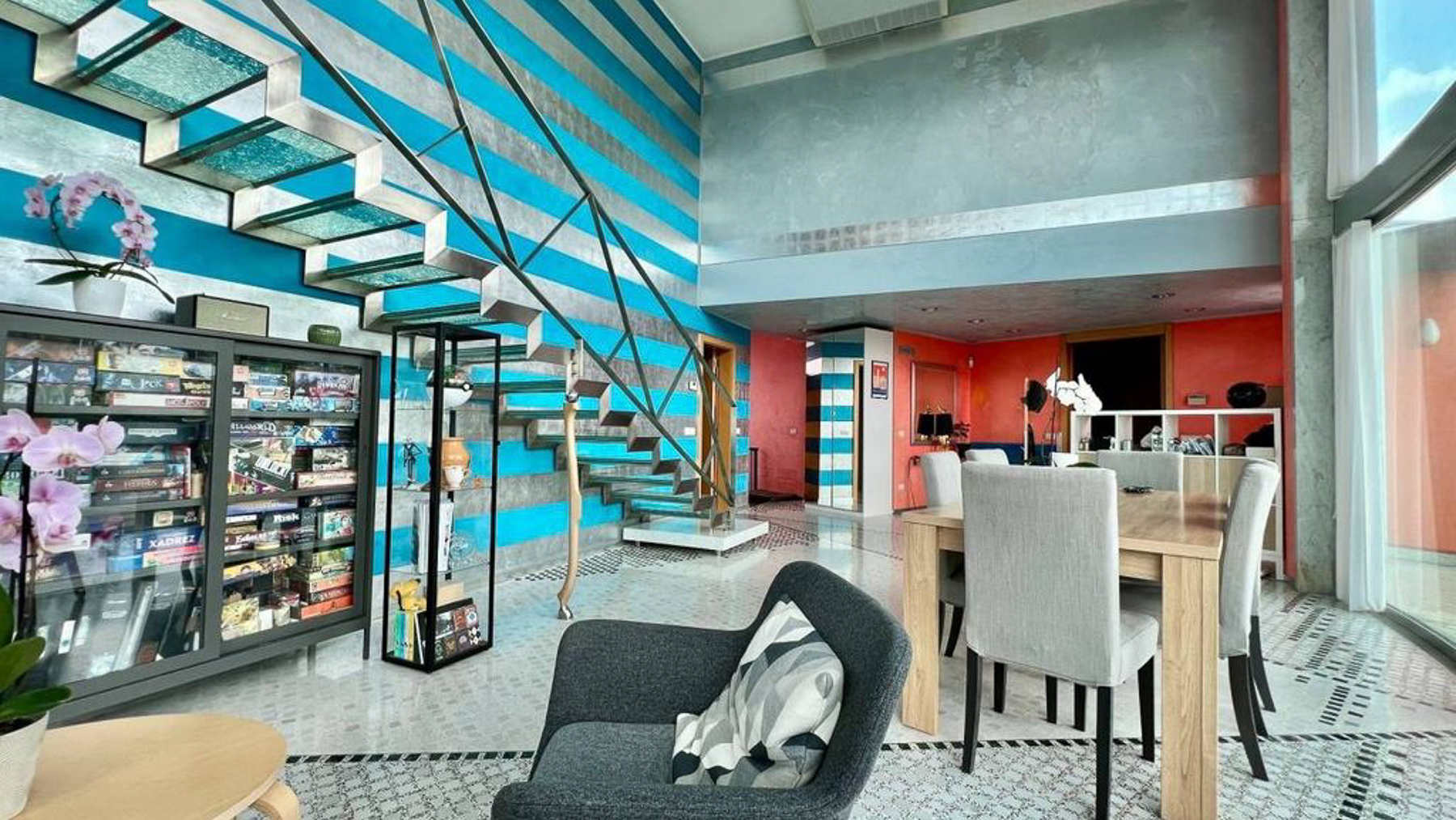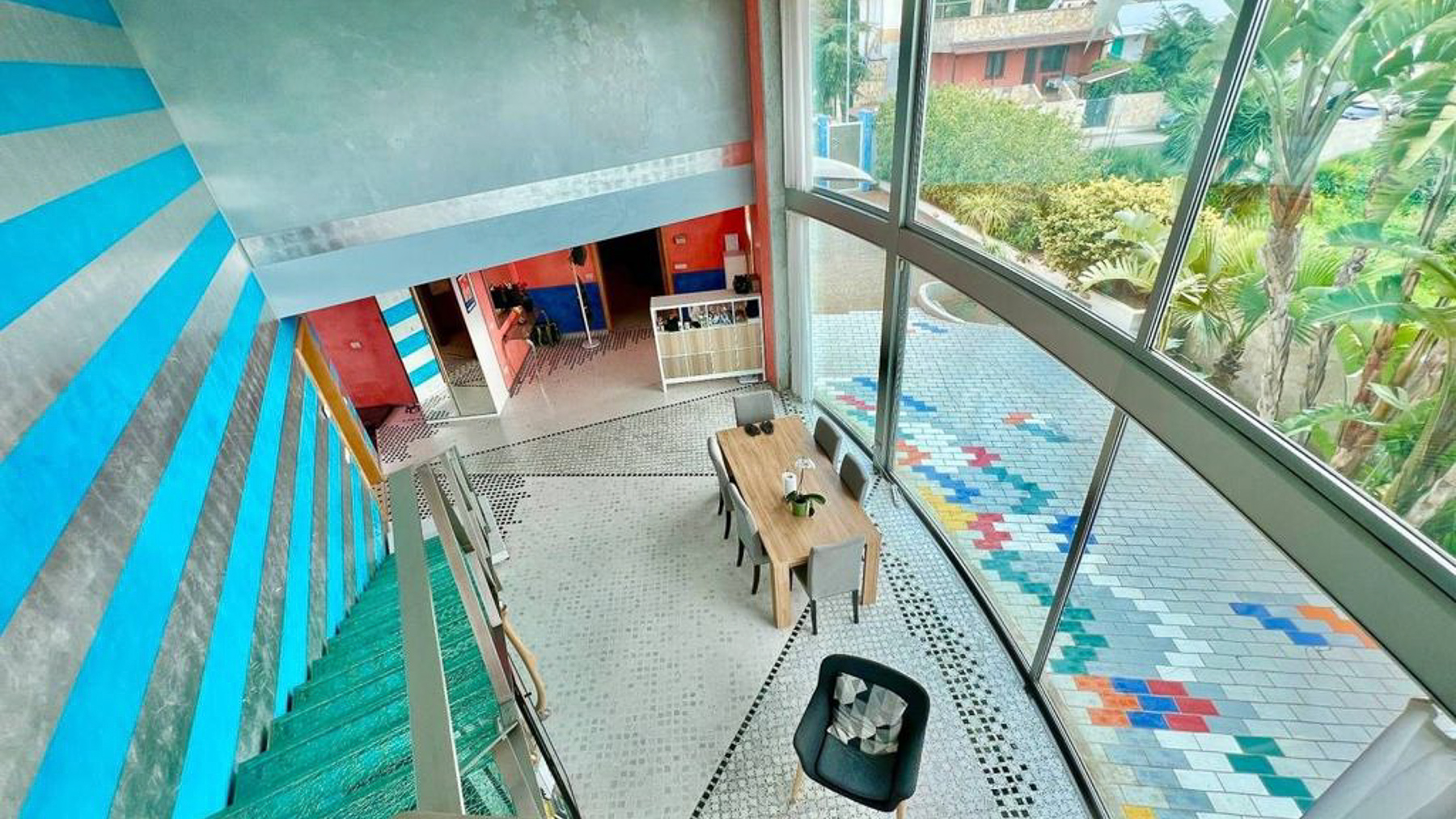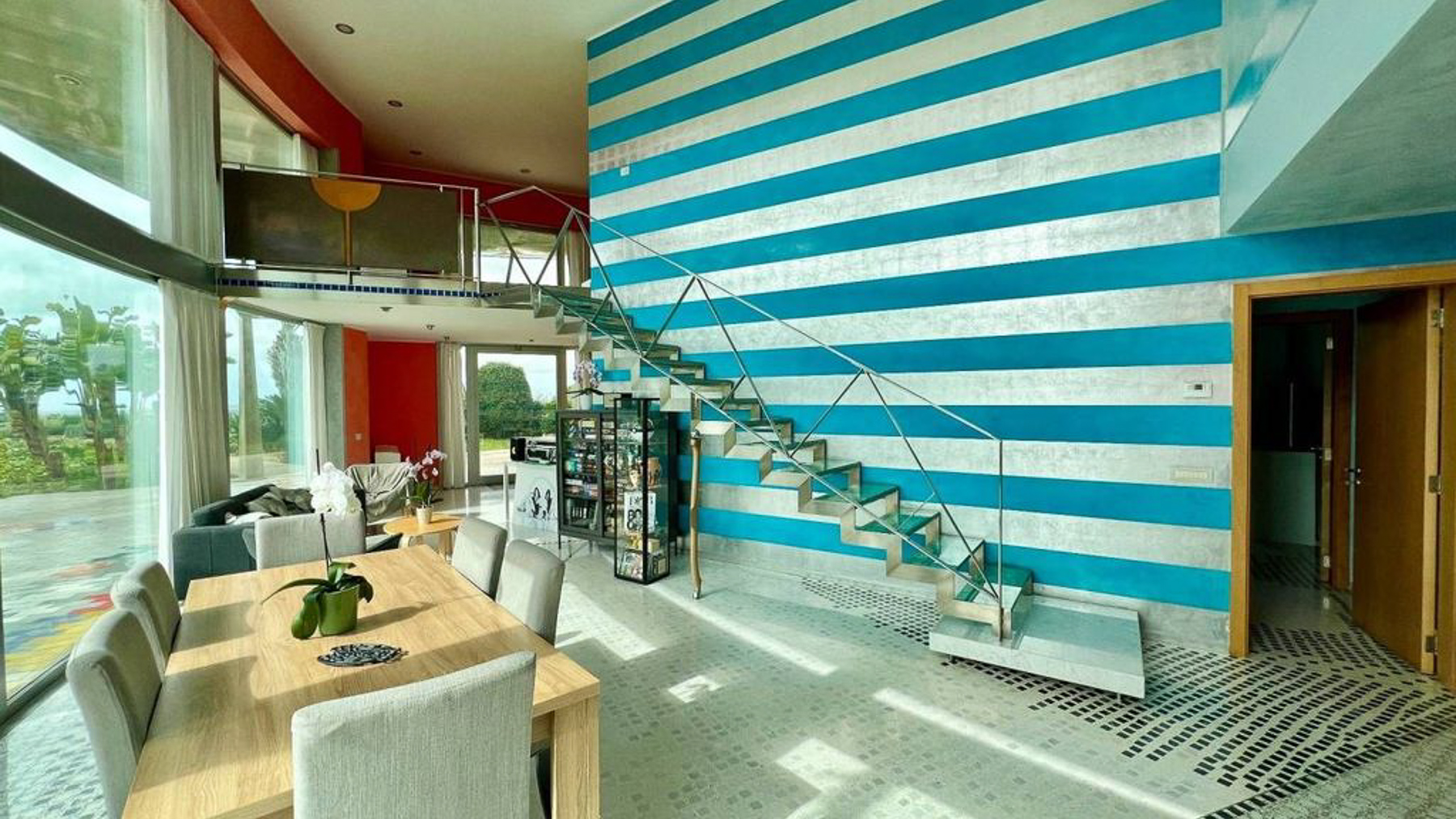 In the heart of Matino, Lecce, where the vibrant cityscape meets serene natural surroundings, lies a modern masterpiece waiting to be discovered. This exquisite property invites you to step into a world where luxury and contemporary style blend seamlessly. Imagine waking up to the soft glow of morning light streaming through expansive windows, filling your space with warmth and tranquility. Spanning an impressive 365 square meters, this residence boasts five spacious rooms and three elegantly designed bathrooms. The interior captivates with its bold blue and gray striped walls, a striking suspended glass staircase, and a dining area that exudes sophistication. Outside, a private garden and a generous terrace offer a seamless extension of the living space, perfect for entertaining or enjoying peaceful moments of reflection. Living here is an experience like no other. Picture yourself hosting intimate gatherings around a wooden dining table, surrounded by loved ones in a space filled with light and life. Step onto the terrace and feel the gentle breeze while you take in the lush green views, creating memories that will last a lifetime. This property is a testament to luxury and style, offering a unique opportunity to own a piece of modern elegance in Matino. It stands as a beacon of refined living, promising a lifestyle of comfort and exclusivity in the heart of the city.