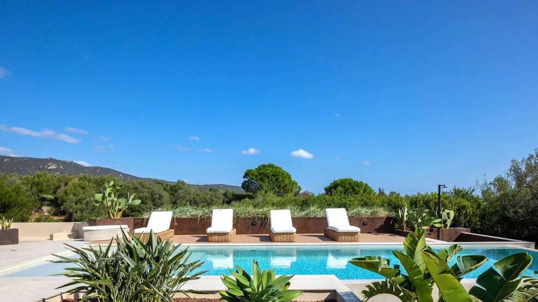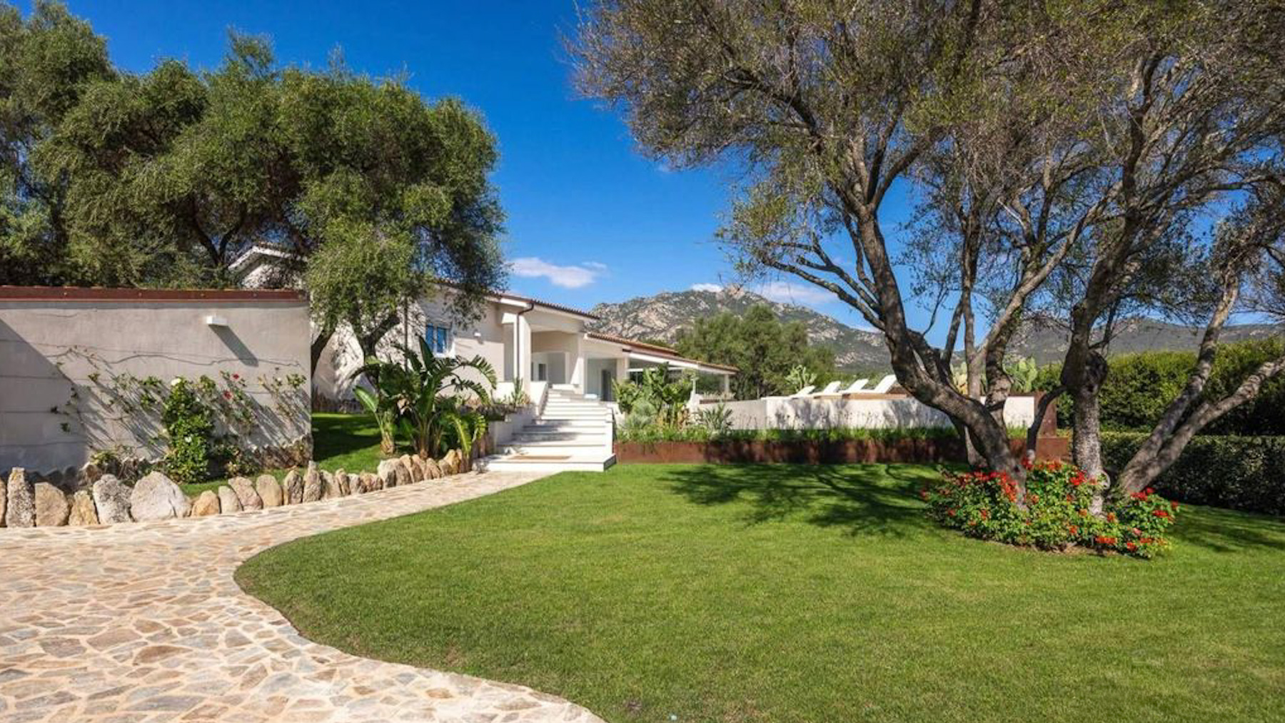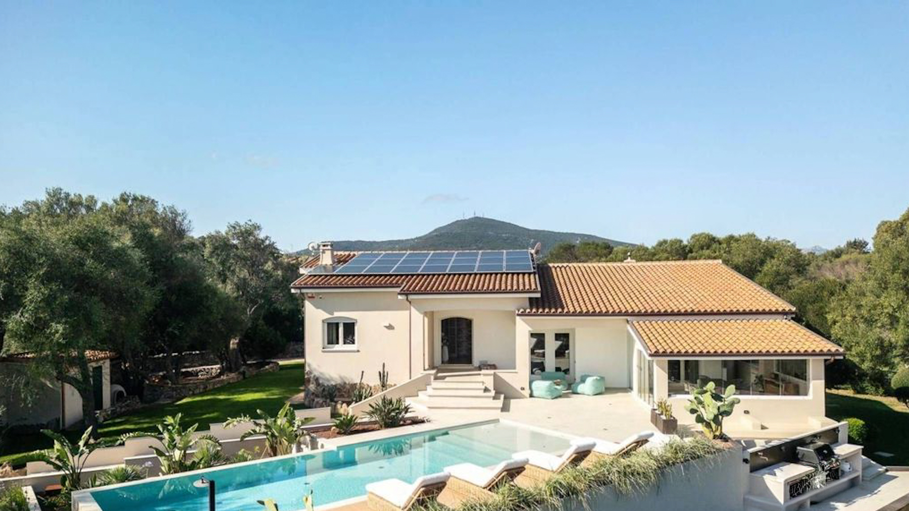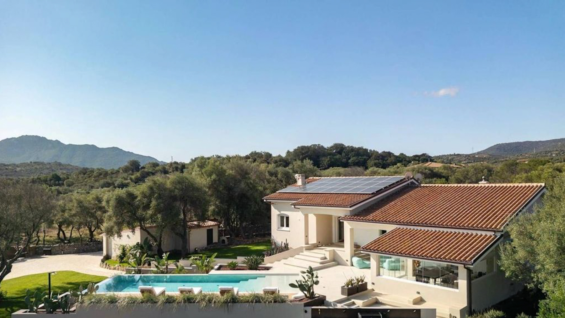 Set amidst a stunning landscape, this modern abode offers a sanctuary of peace and sophistication. The gentle rustle of leaves and the soft splash of water from the nearby pool create a symphony of serenity. Imagine waking up to the sight of rolling hills and clear blue skies, with the scent of fresh greenery enveloping your senses. Spanning 215 square meters, this exquisite property in Olbia, Provincia della Gallura Nord-Est Sardegna, boasts five spacious rooms and two elegant bathrooms. Designed for luxury living, the home features a private garden and a sparkling pool, perfect for relaxation or entertaining guests. Solar panels on the roof highlight the property's commitment to sustainability. The stone pathway leading to the entrance adds a touch of timeless charm, while the picturesque mountain backdrop completes this idyllic setting. Living here means embracing a lifestyle of tranquility and elegance. Picture yourself lounging by the pool, surrounded by lush greenery, or enjoying a leisurely stroll through the vibrant countryside. This property offers an escape from the everyday hustle and bustle, allowing you to savor life's simple pleasures in a serene environment. This exceptional home combines modern luxury with nature's beauty—a rare find in the prestigious real estate market. It’s not just a house; it’s a dream waiting to be lived.