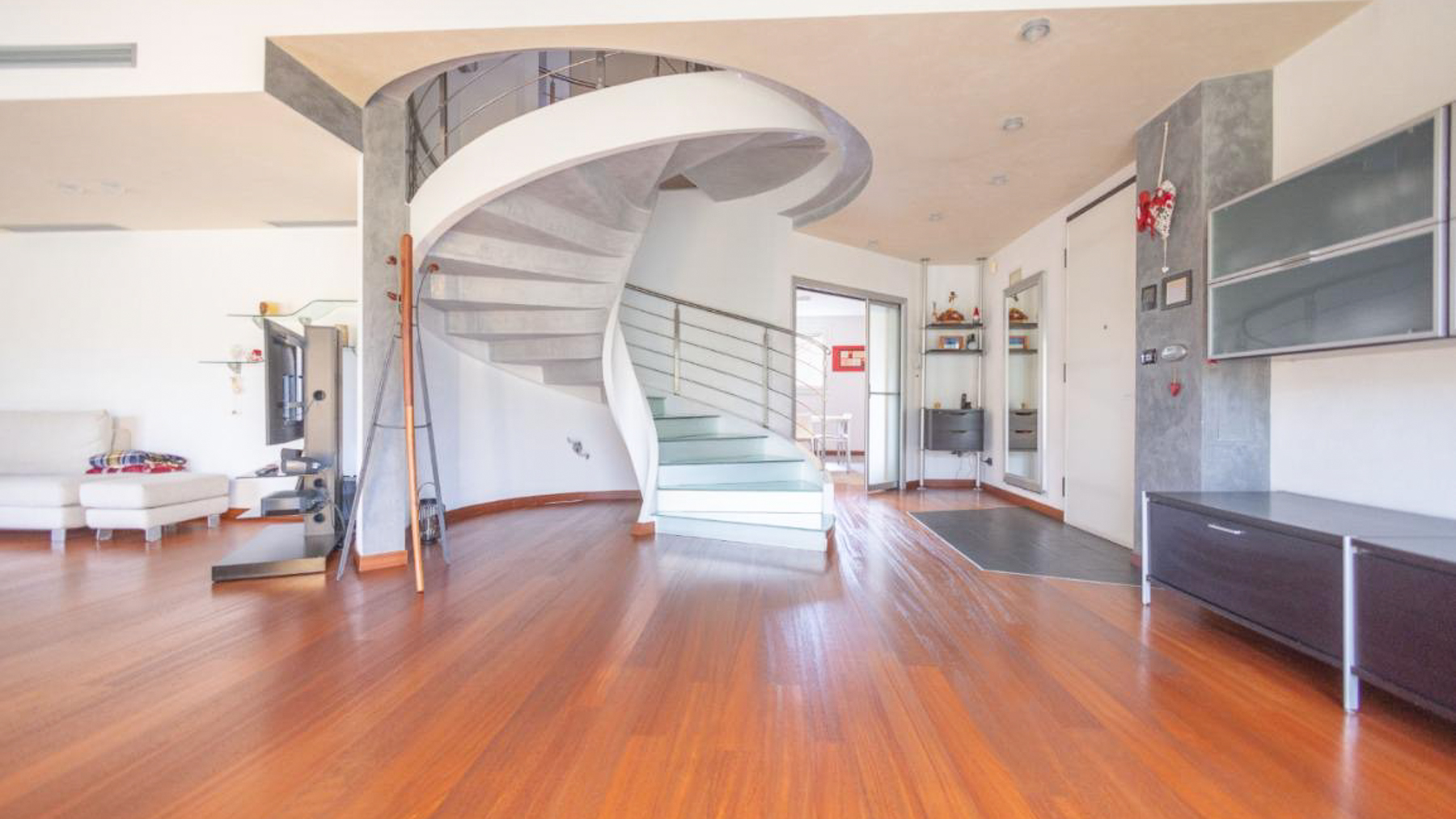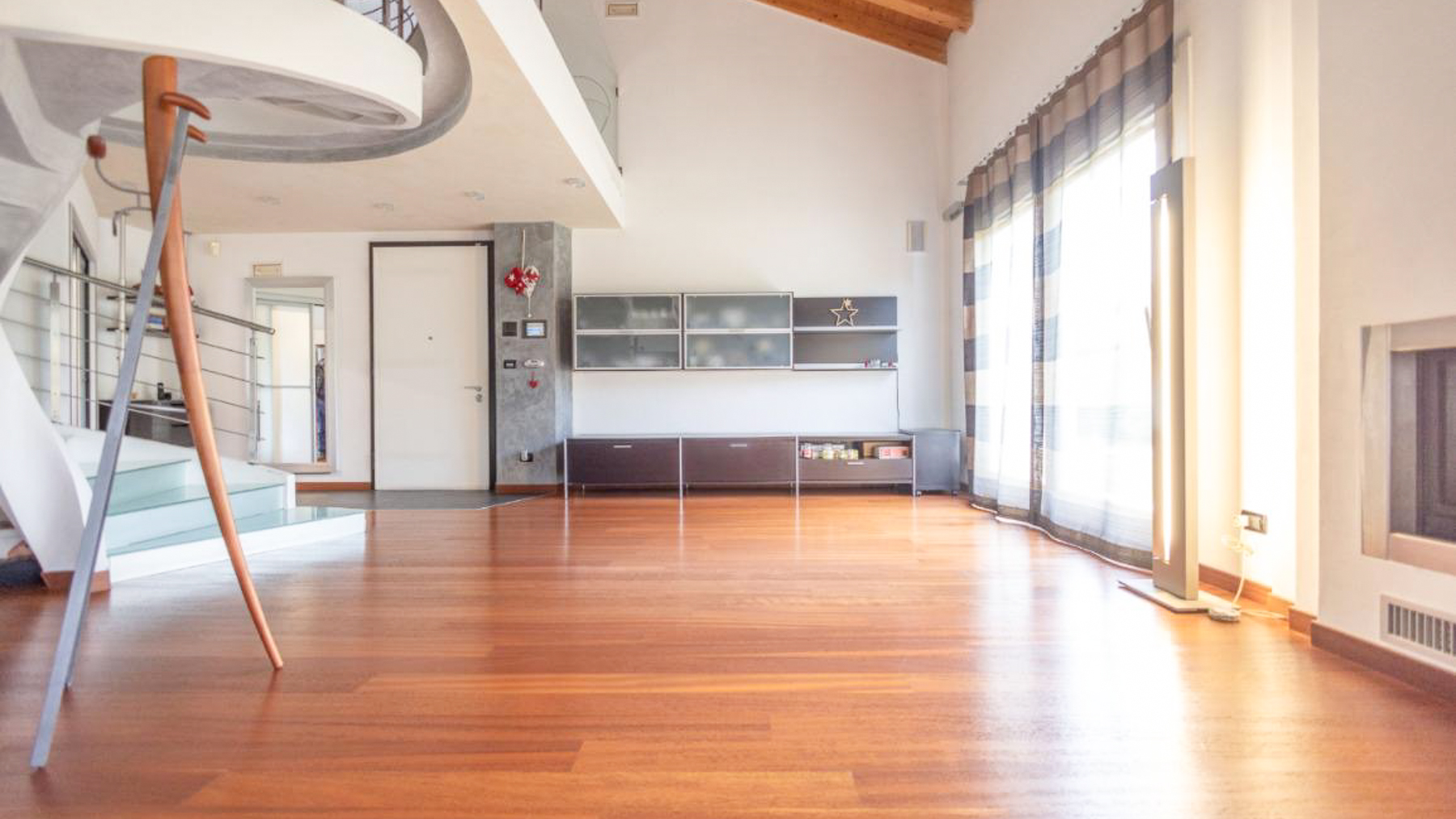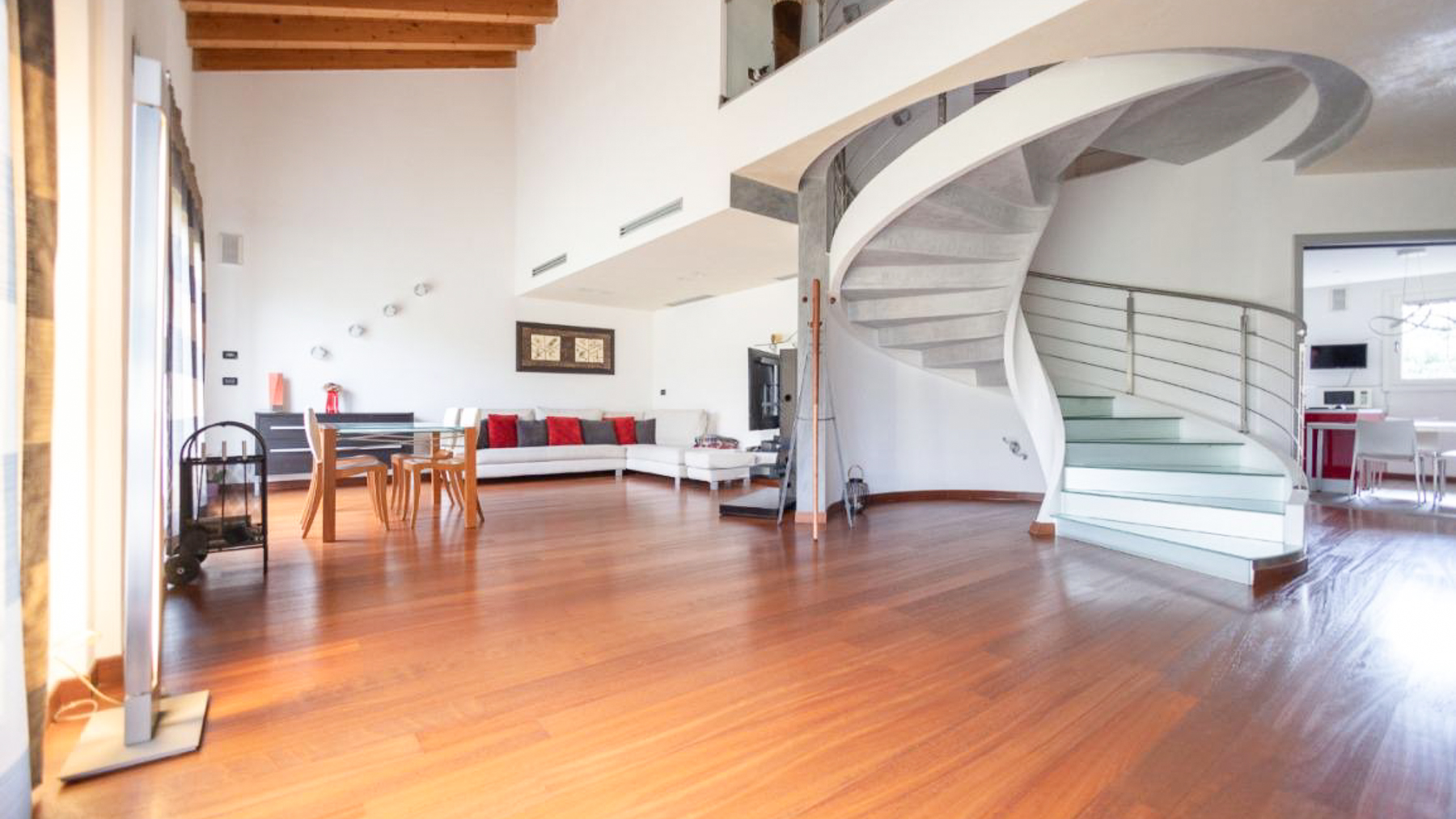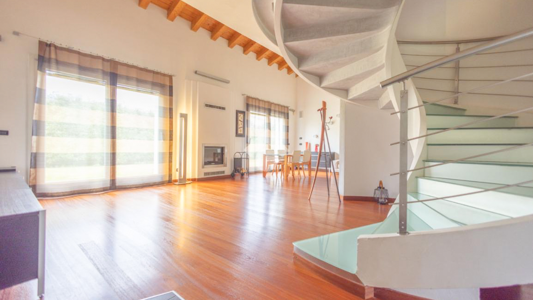 In the charming locale of Oriago, Venezia, a sophisticated retreat awaits. Bathed in natural light from expansive windows, this contemporary residence is a symphony of elegance and modernity. The distinctive spiral staircase and artistic decor create an inviting ambiance, while the gentle rustle of drapes brings a serene rhythm to this urban sanctuary. Spanning 271 square meters, this exquisite property features five spacious rooms and two luxurious bathrooms, perfectly blending style and functionality. The open-concept living area, with its rich wooden flooring and vibrant sectional sofa, seamlessly flows into a sleek, modern kitchen adorned with striking red cabinetry. Outside, a private garden offers a tranquil escape, ideal for relaxation and entertaining. Situated in the heart of the city, this home embodies a lifestyle of sophistication and convenience. Imagine savoring your morning coffee in the sun-drenched living room or hosting memorable gatherings in the lush garden. This is a place where every day feels like a serene getaway, surrounded by beauty and comfort. The vibrant energy of city life is at your doorstep, yet tranquility and privacy are always within reach. This residence is a testament to refined living, an exceptional find in the luxury real estate market. It promises an unparalleled lifestyle, where elegance meets contemporary charm in an enchanting setting.