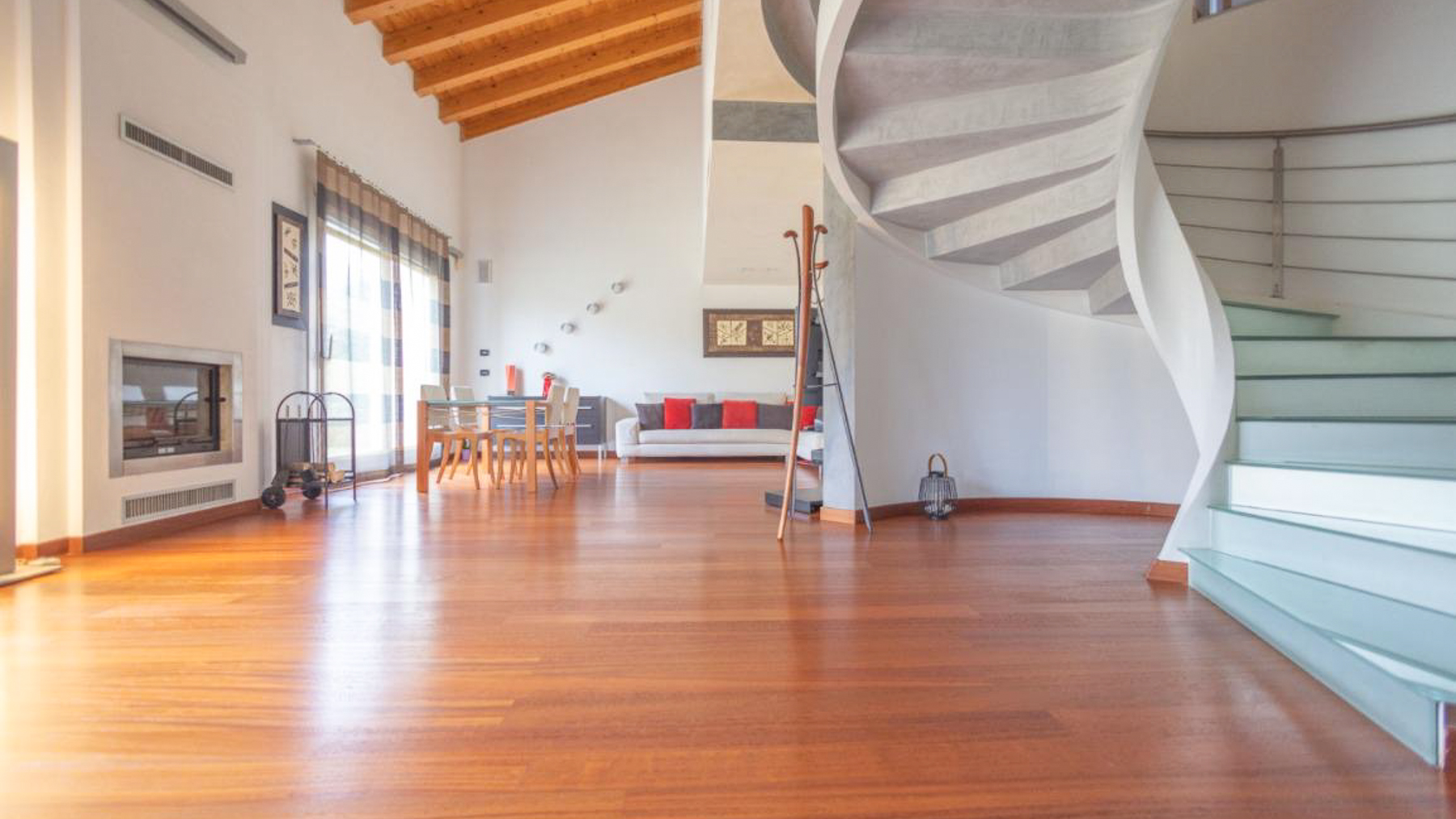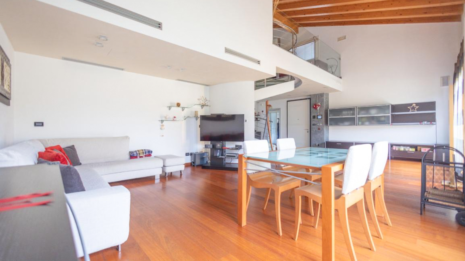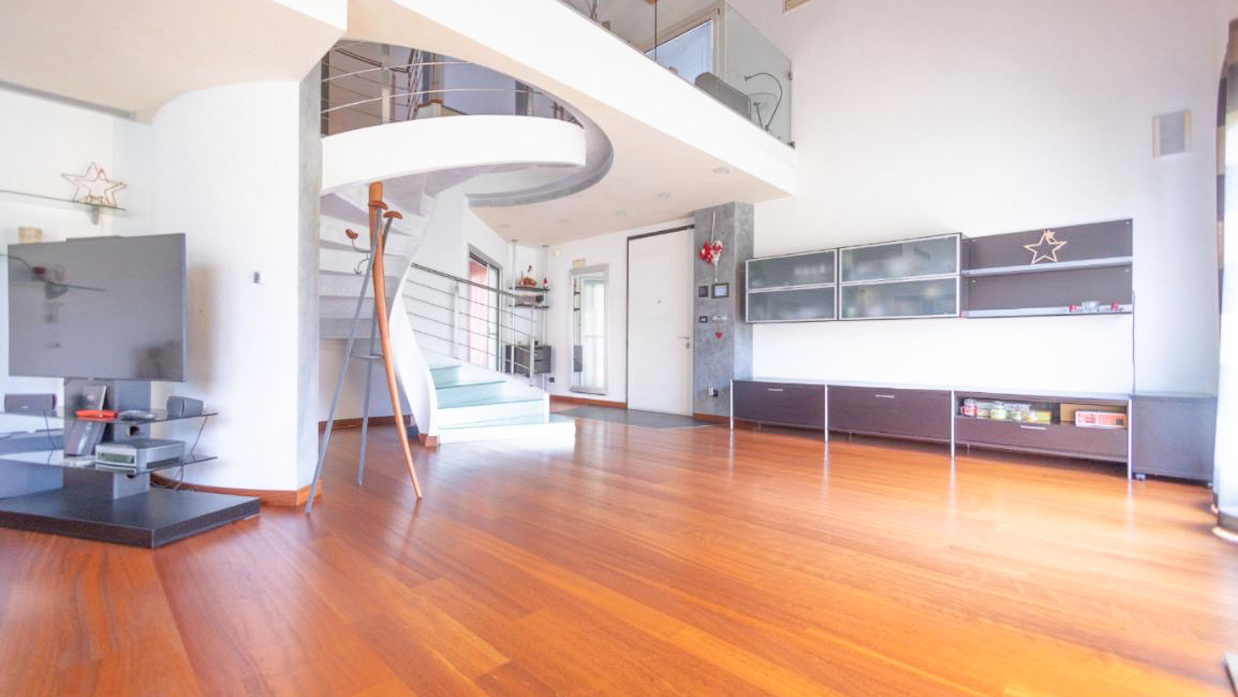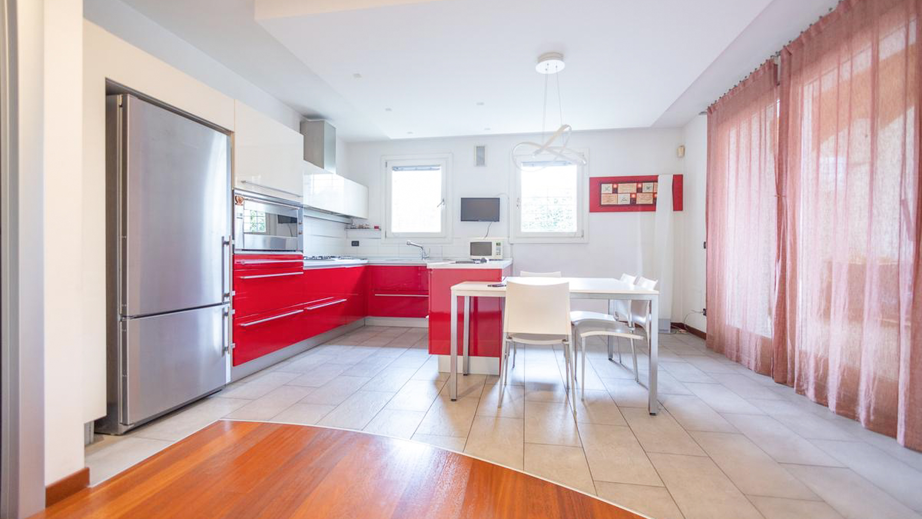 In the charming locale of Oriago, Venezia, a sophisticated retreat awaits. Bathed in natural light from expansive windows, this contemporary residence is a symphony of elegance and modernity. The distinctive spiral staircase and artistic decor create an inviting ambiance, while the gentle rustle of drapes brings a serene rhythm to this urban sanctuary. Spanning 271 square meters, this exquisite property features five spacious rooms and two luxurious bathrooms, perfectly blending style and functionality. The open-concept living area, with its rich wooden flooring and vibrant sectional sofa, seamlessly flows into a sleek, modern kitchen adorned with striking red cabinetry. Outside, a private garden offers a tranquil escape, ideal for relaxation and entertaining. Situated in the heart of the city, this home embodies a lifestyle of sophistication and convenience. Imagine savoring your morning coffee in the sun-drenched living room or hosting memorable gatherings in the lush garden. This is a place where every day feels like a serene getaway, surrounded by beauty and comfort. The vibrant energy of city life is at your doorstep, yet tranquility and privacy are always within reach. This residence is a testament to refined living, an exceptional find in the luxury real estate market. It promises an unparalleled lifestyle, where elegance meets contemporary charm in an enchanting setting.