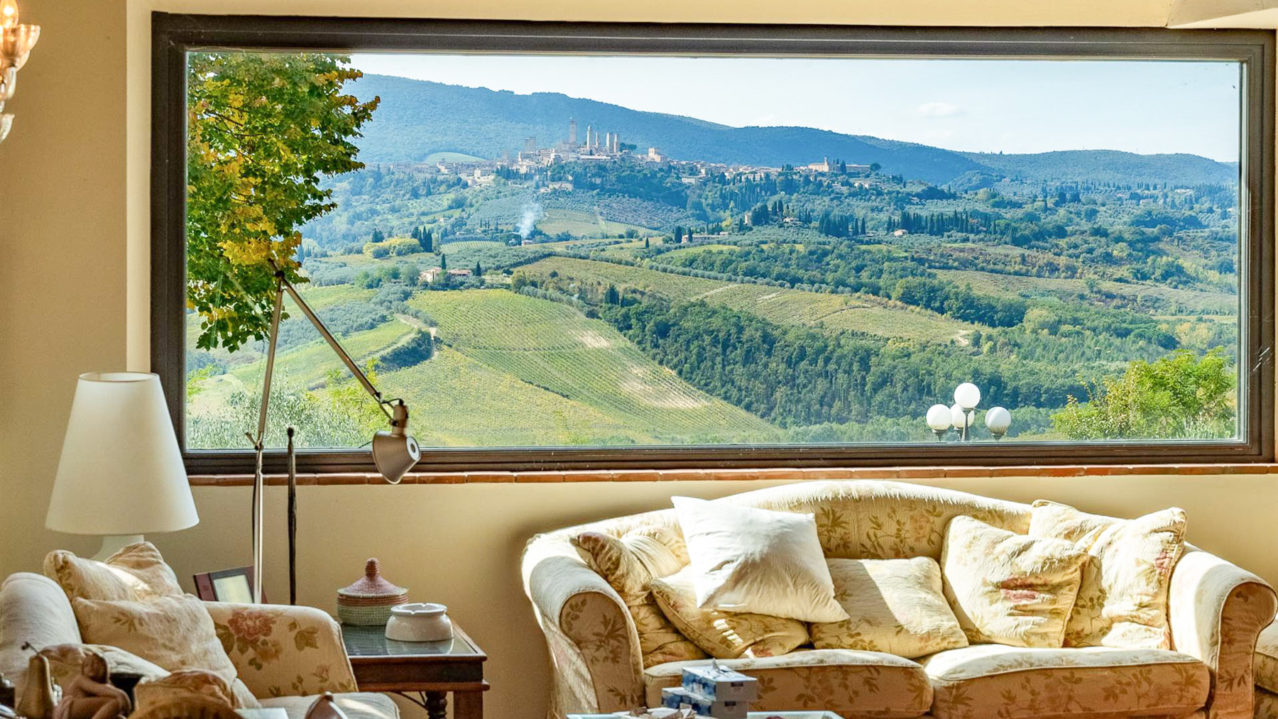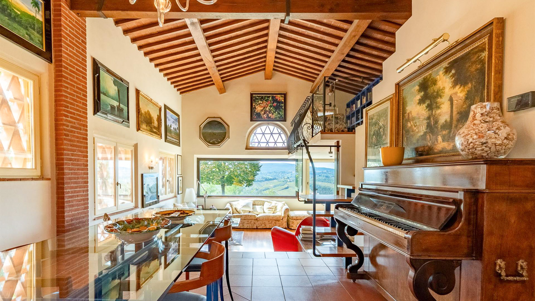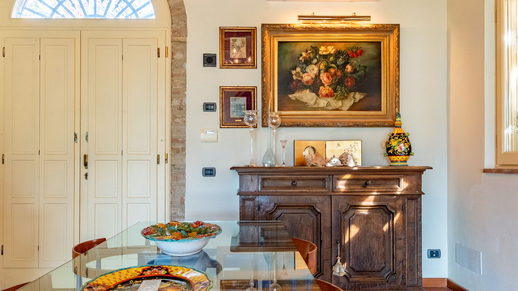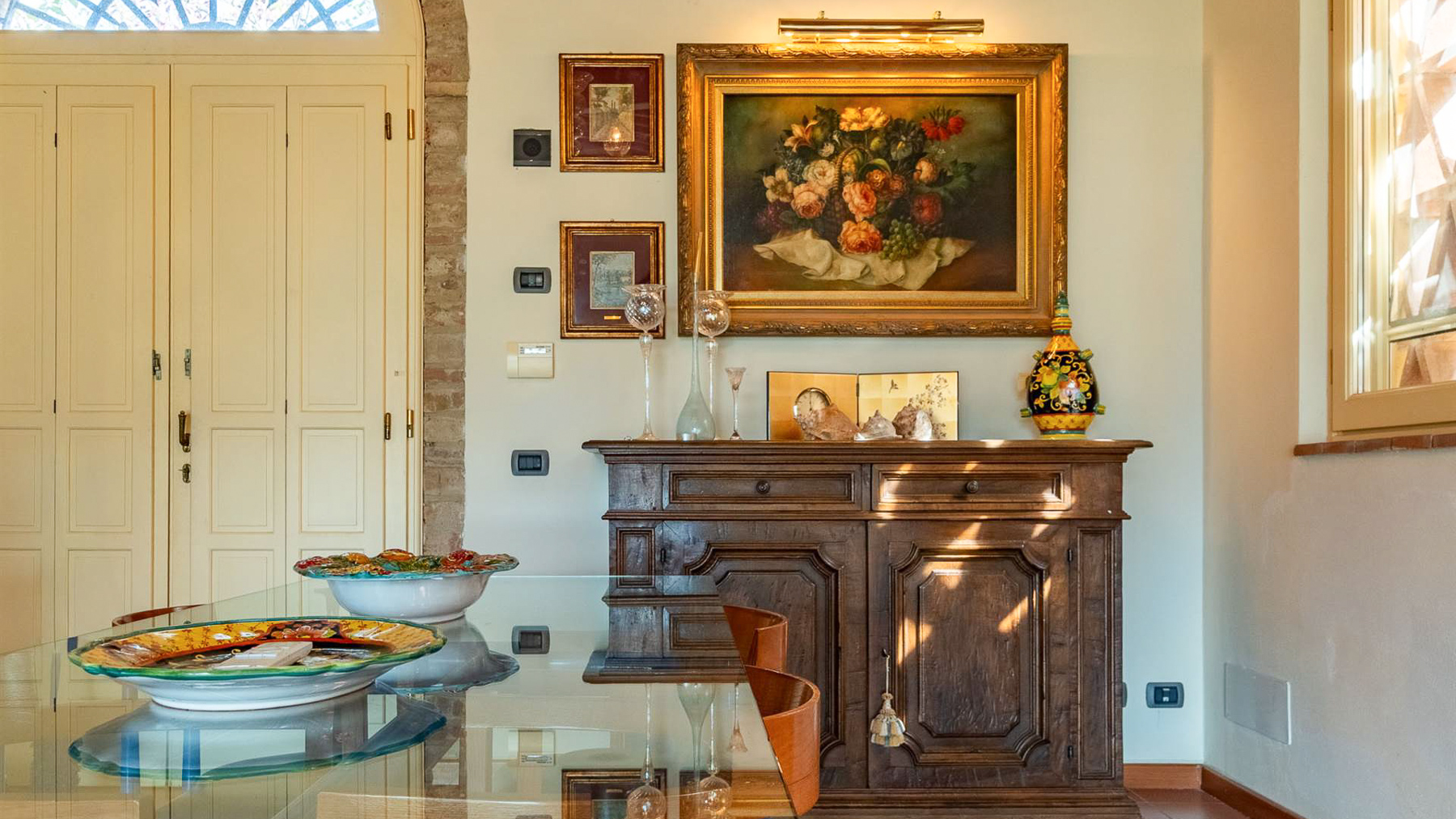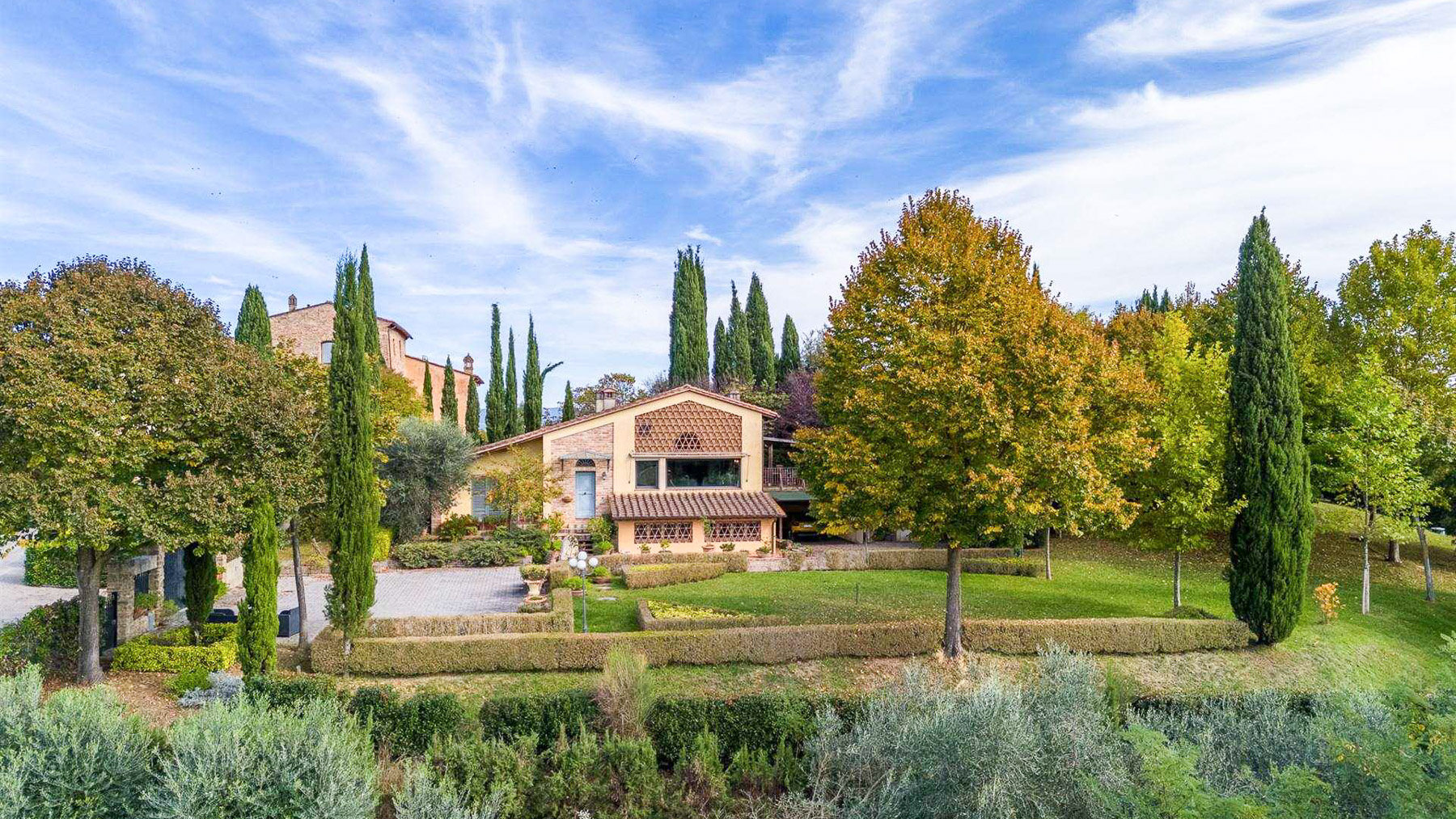 Tucked away amidst the enchanting landscapes of San Gimignano, Siena, this exquisite property offers a serene retreat that captivates the senses. Imagine waking up to the gentle rustling of leaves and the sight of golden autumn hues against a backdrop of lush greenery. The partly cloudy sky adds a touch of drama to this picturesque setting, where tranquility and elegance blend seamlessly. Spanning 413 square meters, this distinguished residence features five spacious rooms and three luxurious bathrooms, offering ample space for relaxation and entertainment. The stylish architecture combines brick and stone, complemented by tall cypress trees and a private garden that promises peace and privacy. The cozy interiors are adorned with a wooden sideboard and a striking painting of flowers, all bathed in natural light, creating a warm and inviting atmosphere perfect for family gatherings or quiet reflection. Living here means embracing a lifestyle of rural sophistication, where each day brings new opportunities for joy and relaxation. Picture leisurely afternoons spent in the garden, the air filled with the scent of blooming flowers and the sound of birds chirping. The home's design encourages a harmonious connection with nature, offering a sanctuary to escape the hustle and bustle of everyday life. This property embodies a rare blend of charm and modern luxury, offering a unique opportunity to own a piece of paradise in the heart of Tuscany's rolling hills. It is truly a jewel in the luxury real estate market, promising an unparalleled living experience.