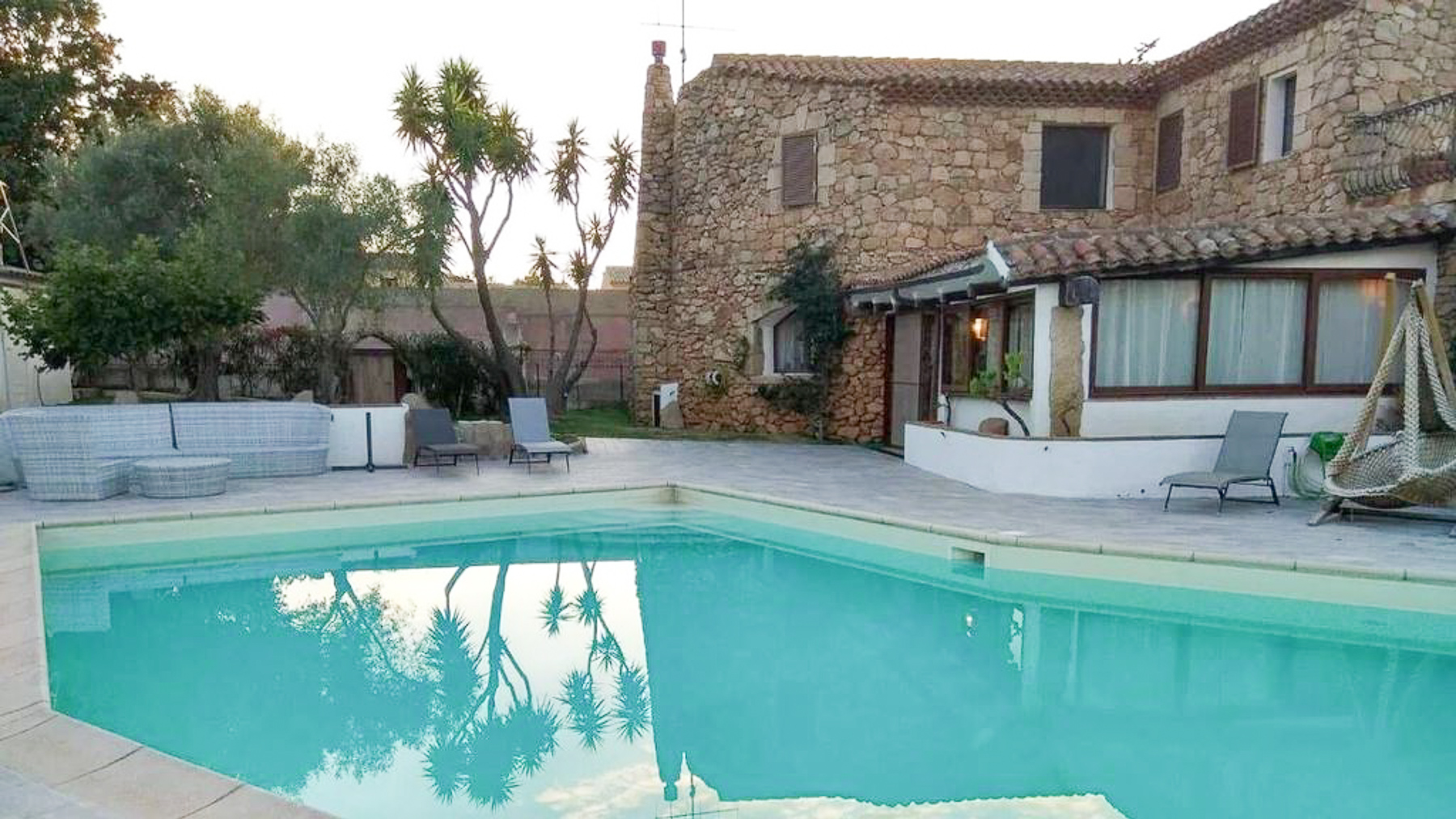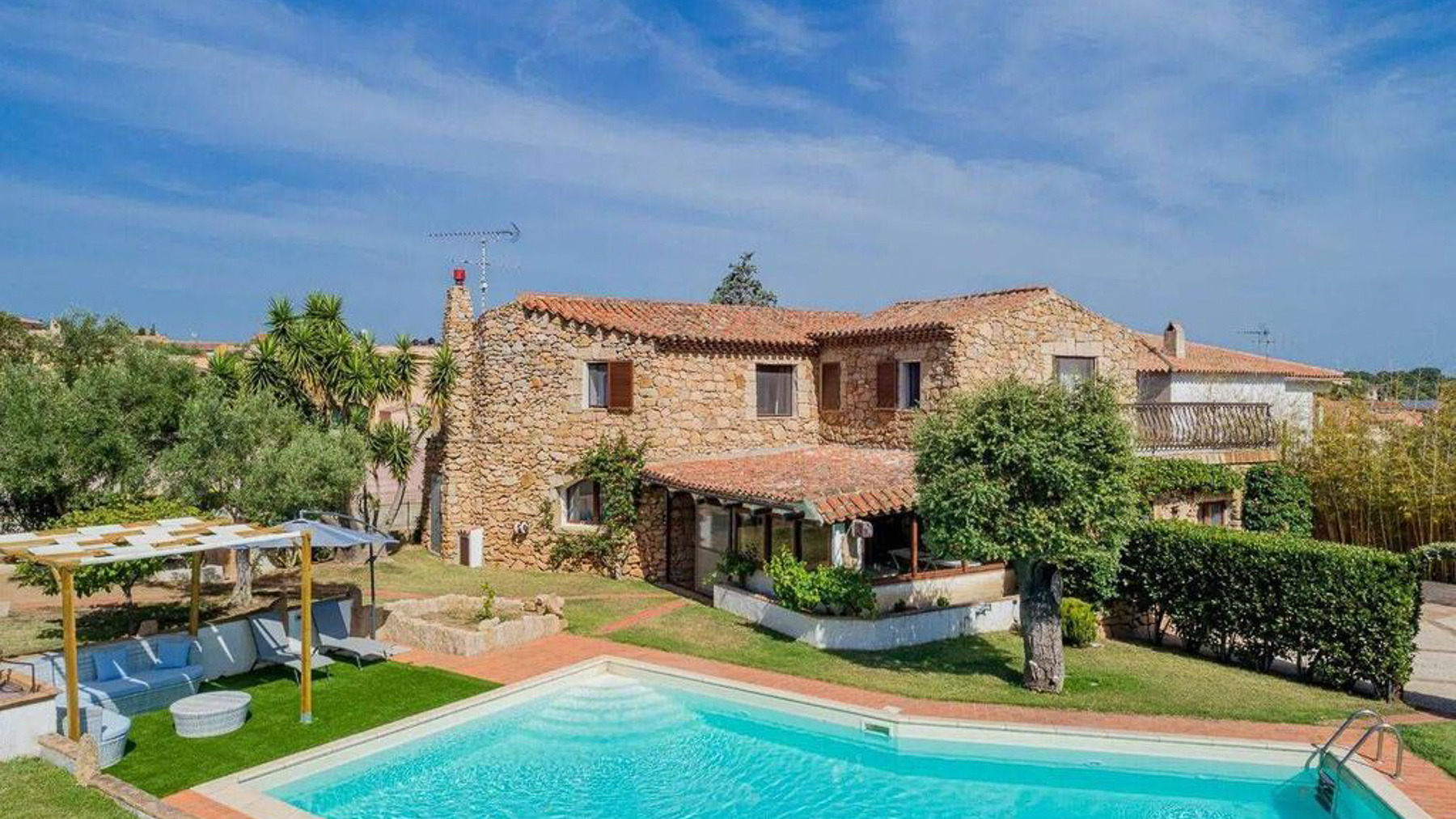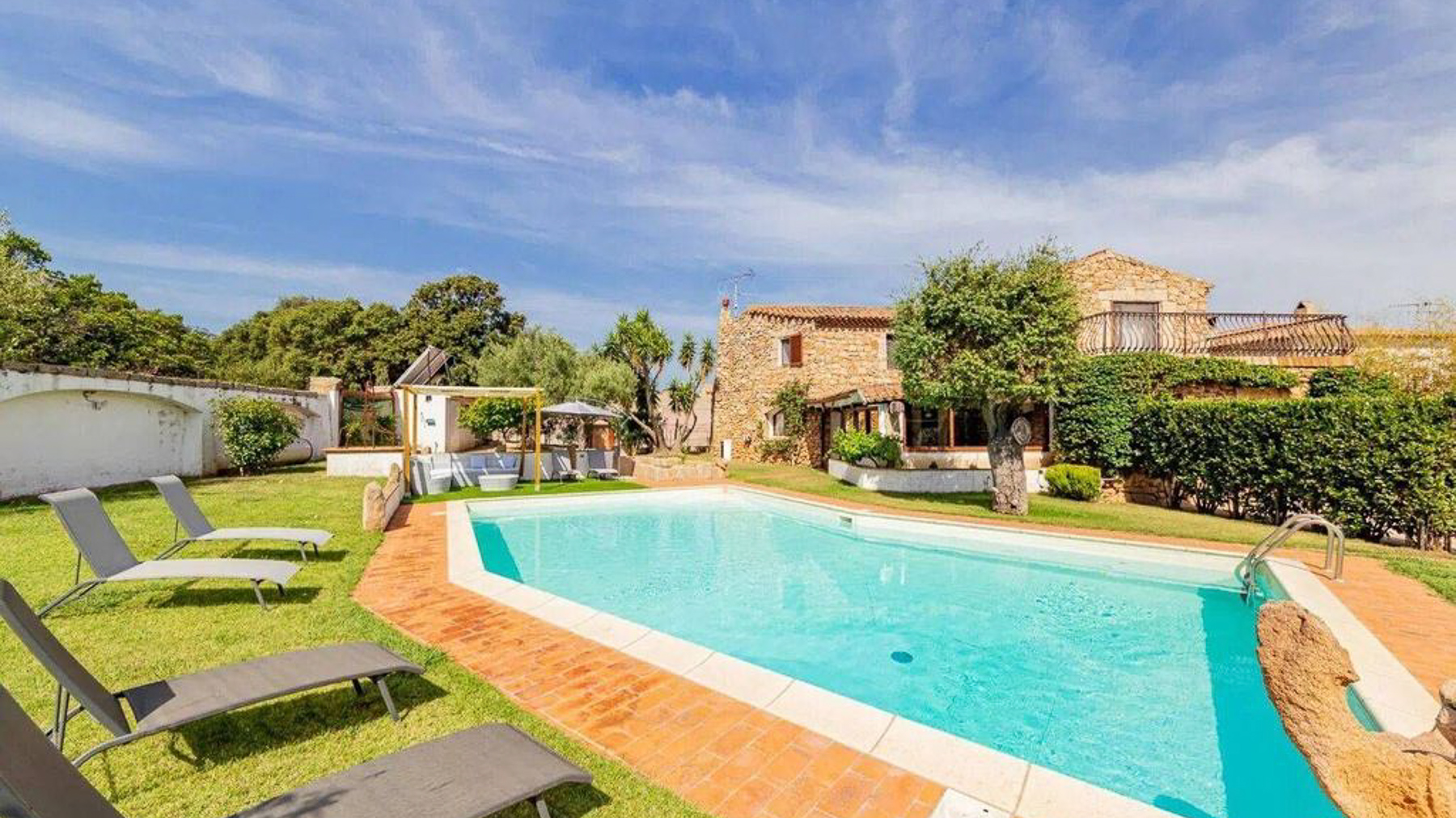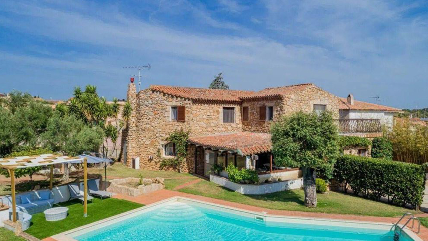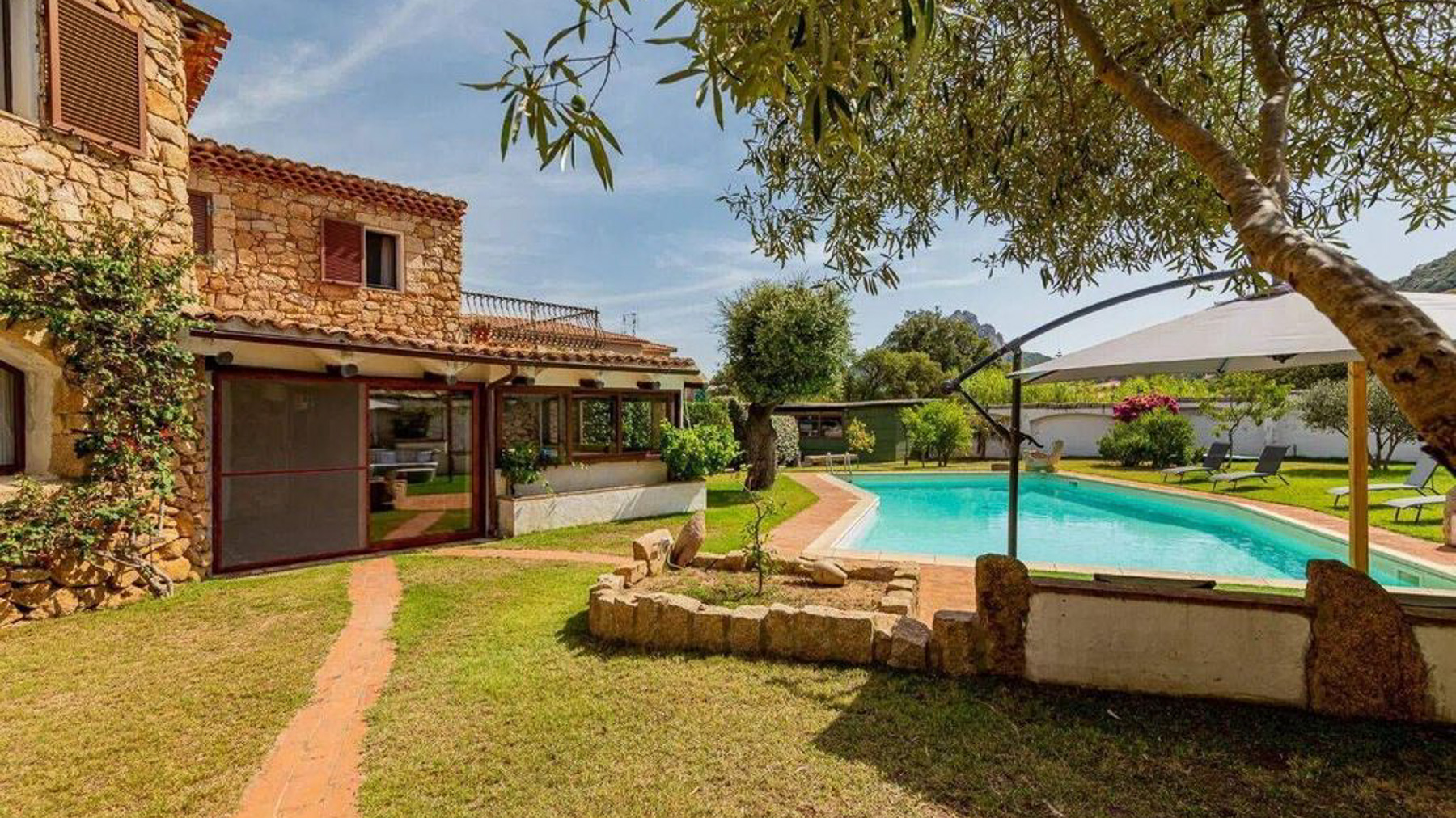 Imagine a retreat where the gentle rustle of leaves and the soft glow of sunlight dancing on water create an idyllic symphony. This exquisite stone villa, set amidst lush greenery, invites you to experience the ultimate sanctuary. Picture yourself in a serene paradise where the air is filled with the scent of blooming flowers and the warmth of the sun. This stunning residence spans 273 square meters, offering five spacious rooms and three elegant bathrooms, designed to cater to your every need. Located in the charming San Pantaleo, Olbia - Tempio, this home embodies the essence of countryside living. Its distinctive features, including a private swimming pool and a picturesque terrace, enhance its allure. The rustic charm of the stone house, complemented by a terracotta roof and surrounded by verdant landscapes, creates a perfect harmony between nature and luxury. Experience a lifestyle defined by tranquil mornings by the pool, with the turquoise waters reflecting the clear blue sky. Envision afternoons spent lounging under the canopy, where time slows down and relaxation becomes an art. As the day draws to a close, gather with loved ones on the terrace to savor the breathtaking views and the gentle caress of the evening breeze. This property is a masterpiece of refined elegance and comfort, offering a rare opportunity in the luxury real estate market. It is a sanctuary where timeless beauty meets modern indulgence, promising an unparalleled living experience.