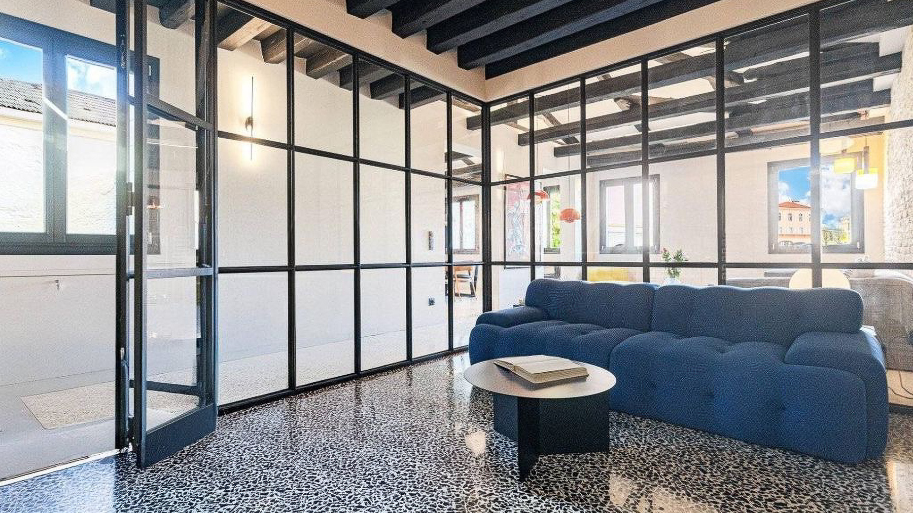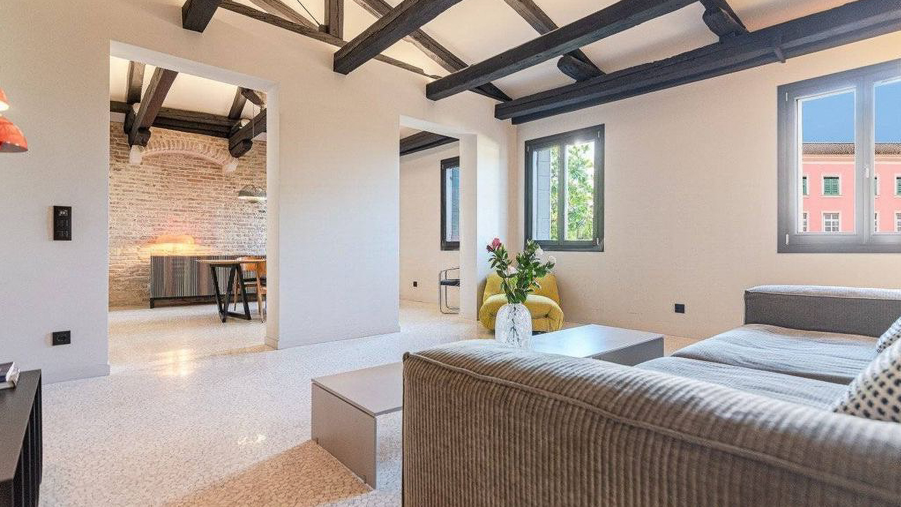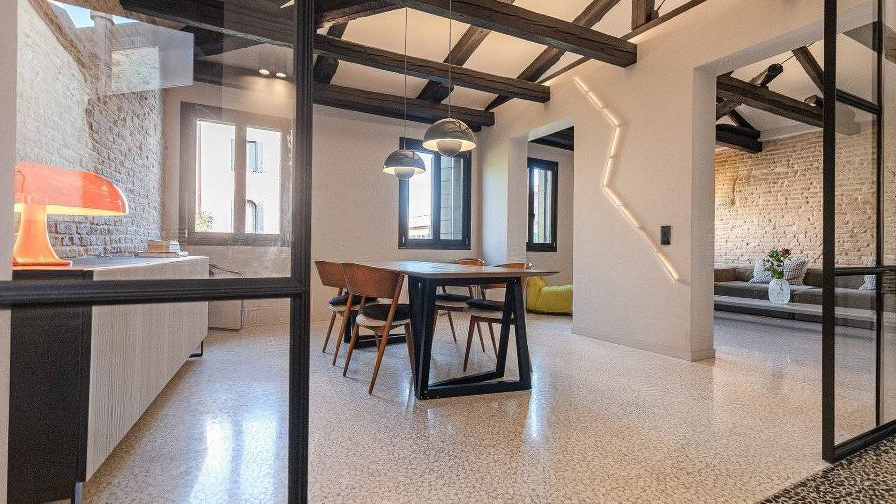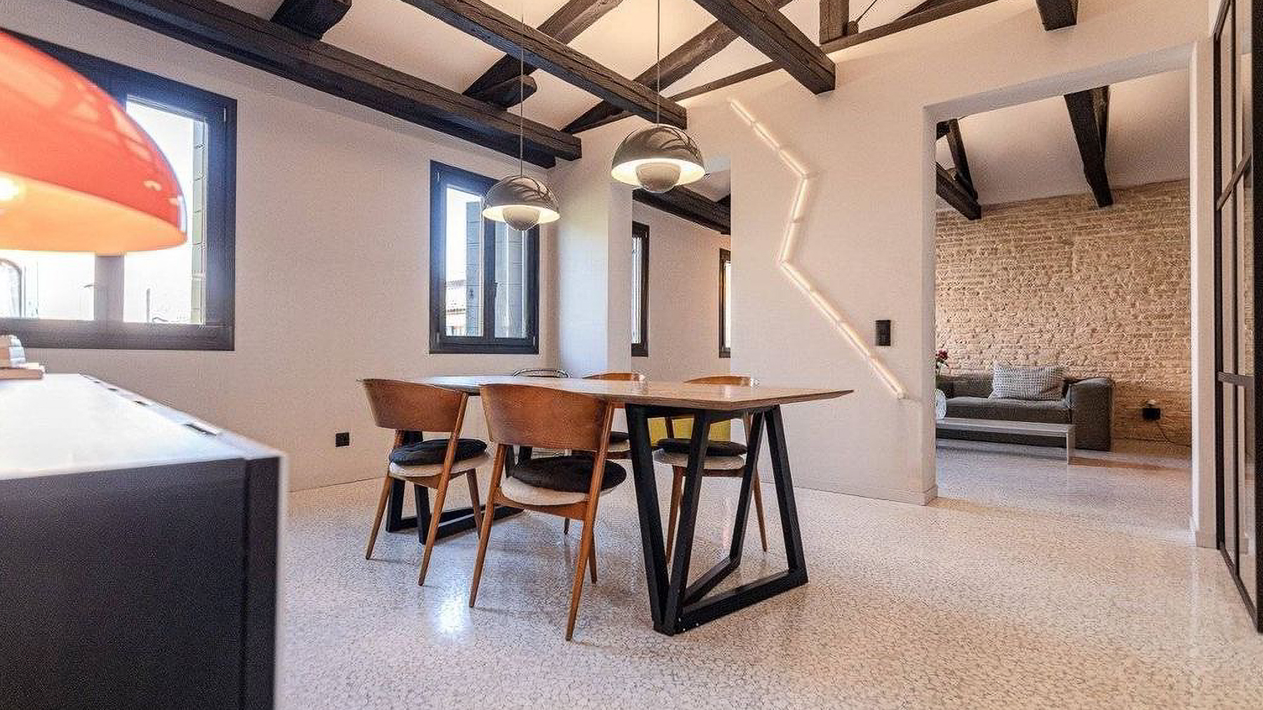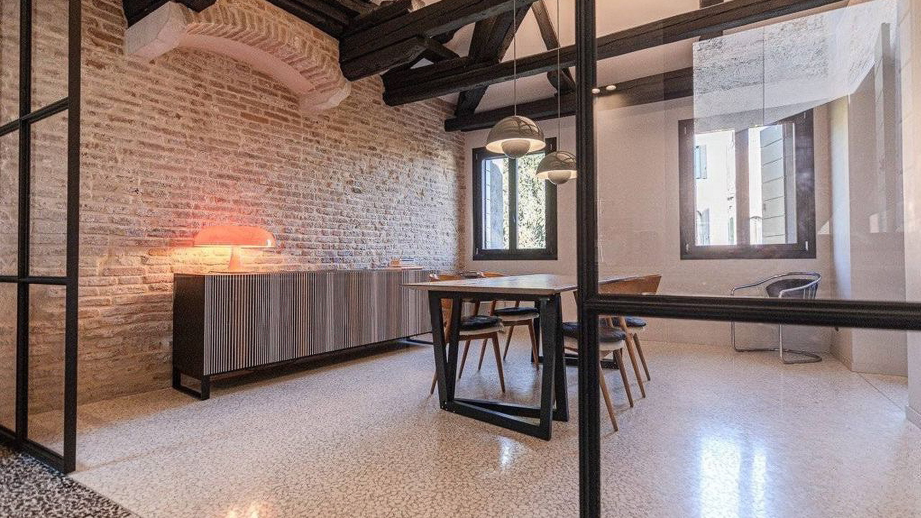 Step into a world where contemporary elegance meets the timeless charm of Italian design. Bathed in natural light, this exquisite property in the heart of Venice invites you to experience a symphony of style and comfort. Imagine the gentle glow of pendant lights illuminating a sumptuous dining area, while the soft rustle of leaves and the scent of freshly brewed coffee envelop your senses. Spanning an impressive 185 square meters, this luxurious residence offers a harmonious blend of modernity and tradition. With five spacious rooms and two beautifully appointed bathrooms, the home is a testament to refined living. The centerpiece is a stunning dining area with a wooden table, unique black base, and cushioned chairs, set against a backdrop of large windows and stylish exposed beams. The smooth white and exposed stone walls add a touch of rustic sophistication, completing this urban sanctuary in the vibrant city of Venice. Living here means embracing a lifestyle of elegance and ease. Picture yourself savoring leisurely breakfasts bathed in morning light, or hosting intimate dinner parties in a space that delights and inspires. The seamless integration of indoor and outdoor elements fosters a serene atmosphere, perfect for unwinding after a day exploring the rich cultural tapestry of Venice. This property is a rare jewel in the luxury real estate market, offering an unparalleled blend of charm and modern comfort. It is an invitation to indulge in the art of living well, in one of the world's most enchanting cities.