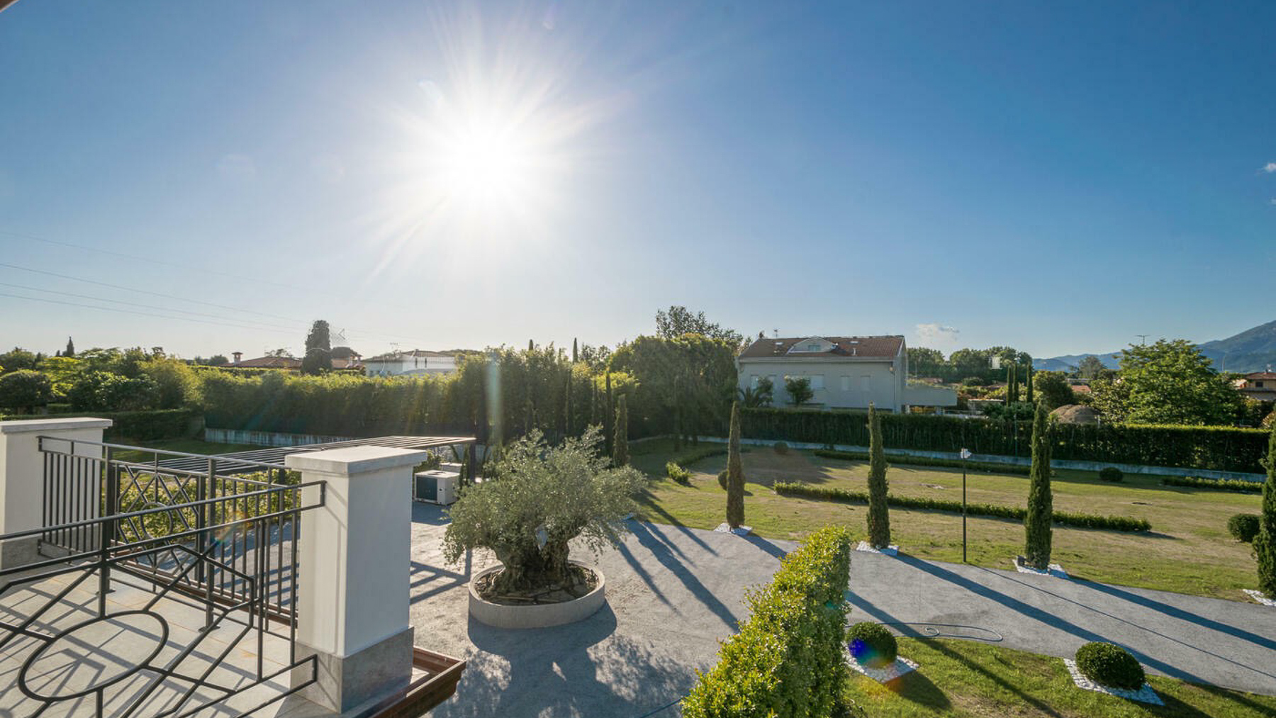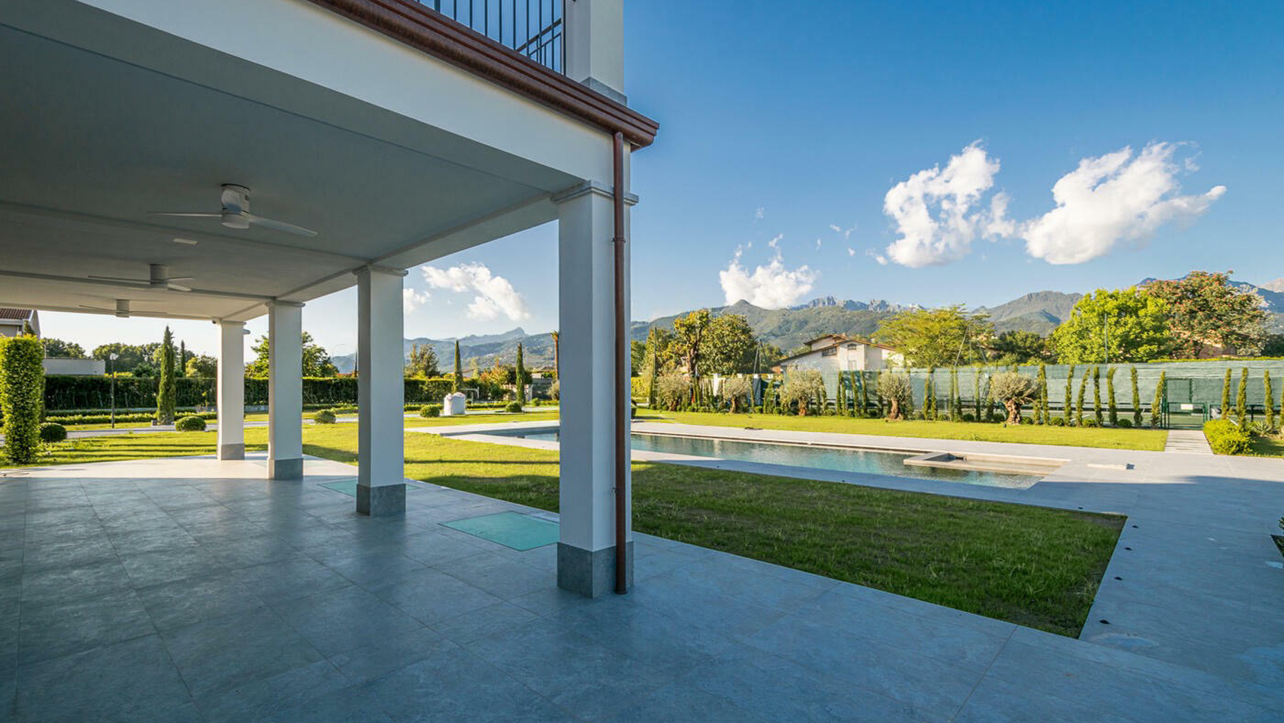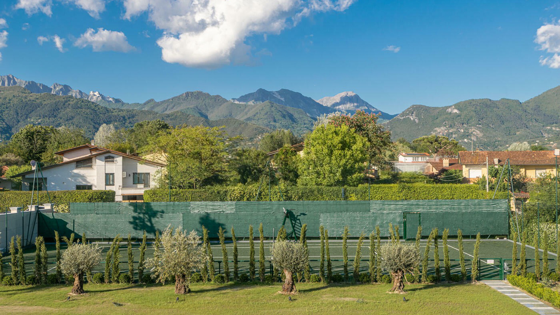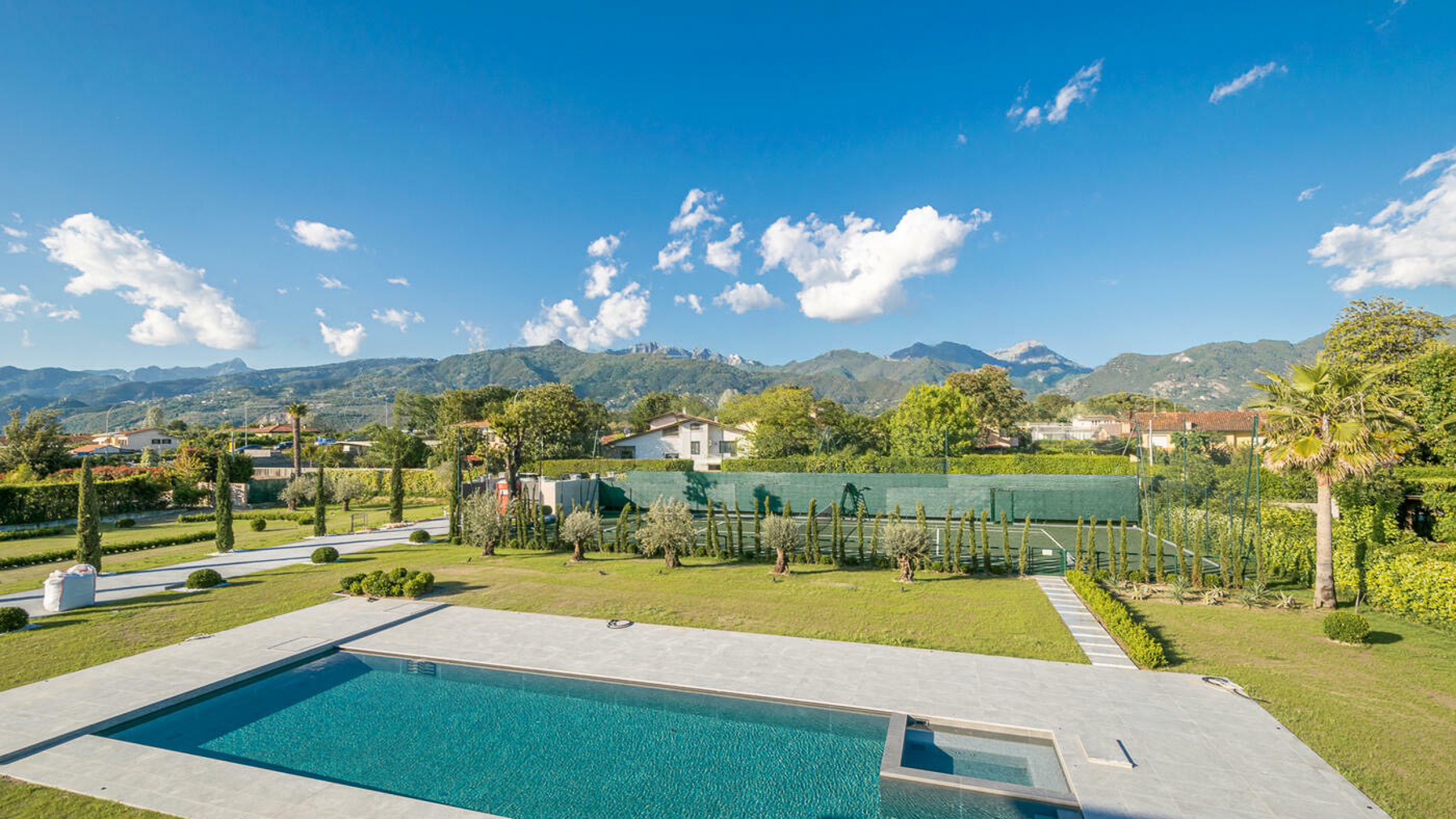Enveloped within a verdant 4,100 sqm private park, Villa Cicala is a sanctuary of elegance and tranquility, offering breathtaking vistas of the Apuan Alps. Just 1.8 km from the sparkling sea, this exquisite villa in Forte dei Marmi transports you to a world of luxury and serenity, where the rustling of olive leaves and the sweet scent of jasmine fill the air. Spanning 540 sqm, the villa features 14 rooms and 10 bathrooms, harmoniously laid out across three levels connected by an elevator. The ground floor opens up to a magnificent 19.5 x 5-meter saltwater pool, while the synthetic grass tennis court beckons for a spirited match under the sun. The property's sophisticated design includes a covered garage with a rooftop photovoltaic system, capable of accommodating eight vehicles. Located in the prestigious area of Forte dei Marmi, Lucca, this residence embodies the quintessential coastal lifestyle. Imagine basking in the golden afternoon sun by the pool, or savoring a quiet morning coffee on the panoramic terrace, as the majestic Apuan Alps stand watch in the distance. With state-of-the-art home automation systems and luxurious finishes, life here is an effortless blend of modern convenience and timeless elegance. This villa is not just a home