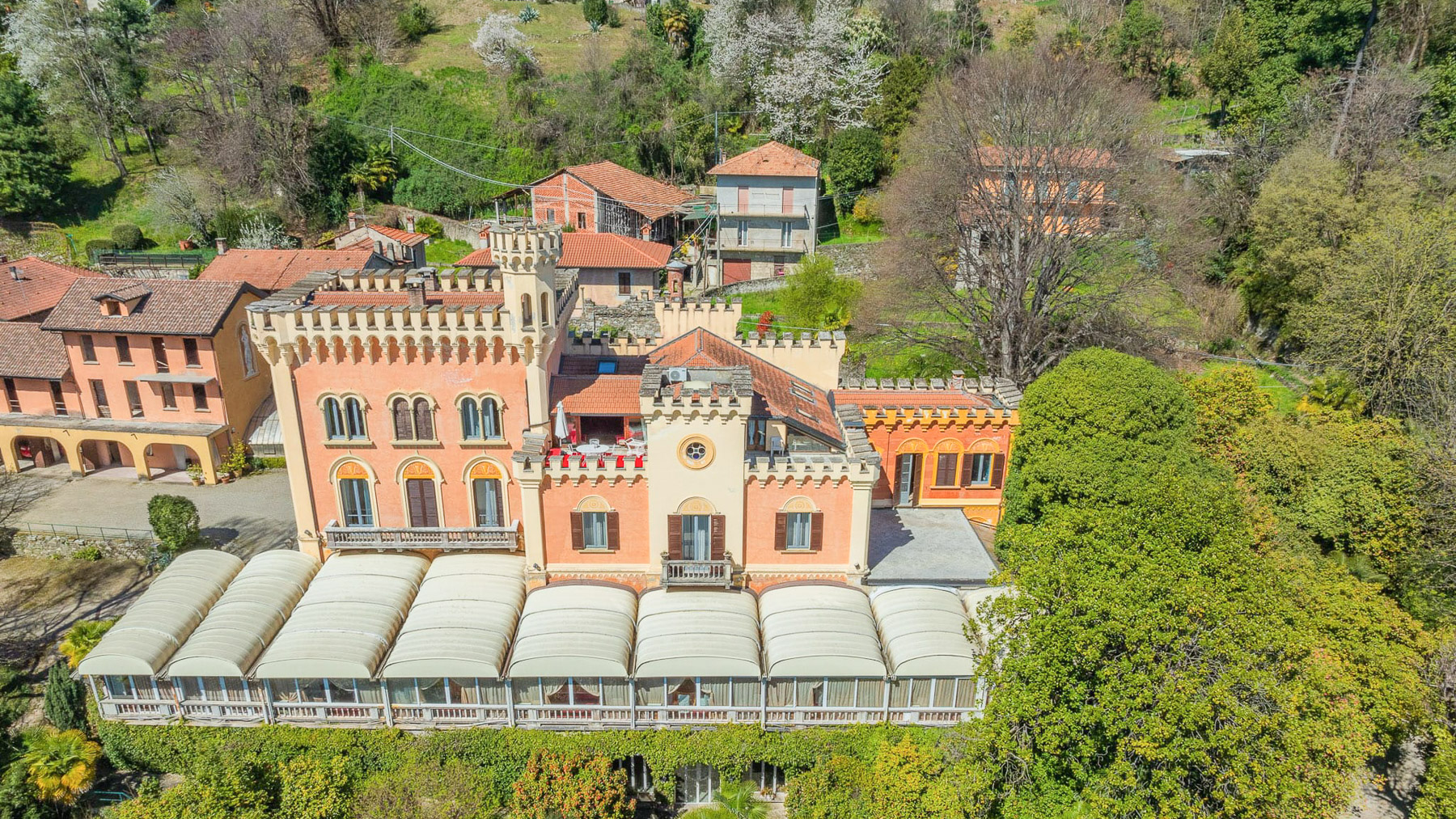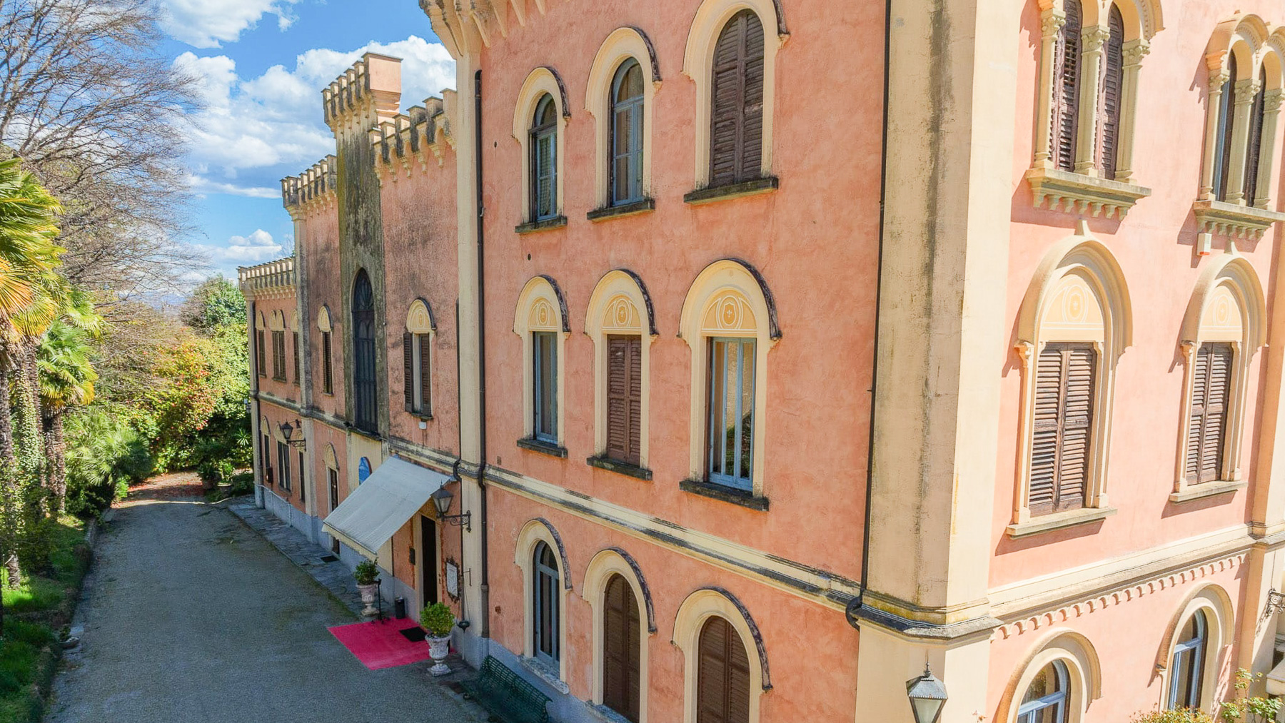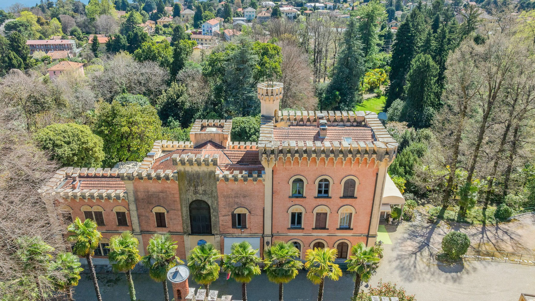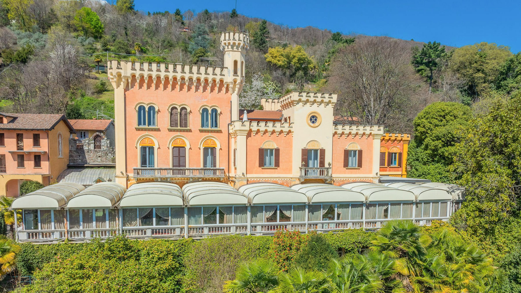 Perched on a serene hillside, this exceptional estate beckons with its whimsical charm and breathtaking vistas. The vibrant hues of the architecture contrast beautifully with the lush greenery that surrounds it, creating an enchanting atmosphere where the gentle rustle of leaves and the whisper of the wind invite you to unwind and savor the tranquility. Spanning an impressive 1300 square meters, this magnificent property boasts 22 elegantly appointed rooms and eight luxurious bathrooms. Its castle-like design, complete with towers and ornate details, offers a sense of grandeur and history. The symmetrical facade, adorned with multiple windows and charming shutters, adds to its allure. Surrounded by a private garden featuring palm trees and vibrant shrubs, the estate offers a picturesque retreat within the prestigious Lesa, Provincia di Novara. This haven is perfectly situated for those who appreciate the refined lifestyle of the Laghi region. Living here is an experience like no other. Picture yourself strolling through the meticulously landscaped gardens, where every corner reveals a new delight. The glass-enclosed spaces invite natural light to dance across the interiors, creating a warm and inviting ambiance