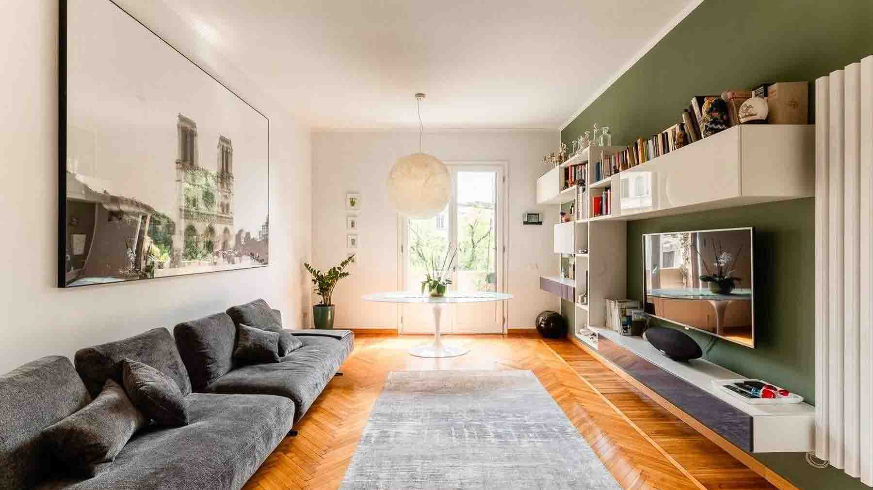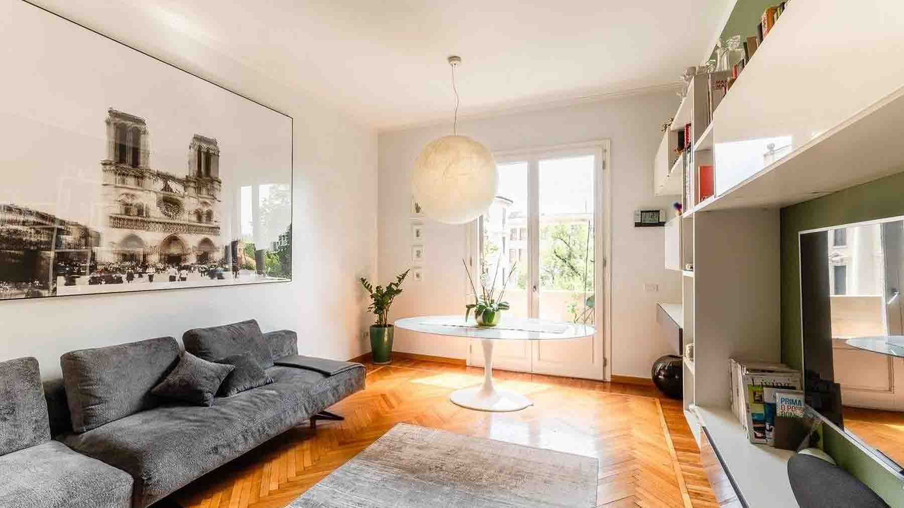 Tucked away in the vibrant heart of Milano, this exquisite residence offers an oasis of contemporary elegance amidst the city's dynamic pulse. Bathed in natural light, the home's open design invites the ambiance of a sunlit morning into every corner, where the gentle rustle of leaves from indoor plants adds a serene touch to the modern allure. Spanning an impressive 115 square meters, this stunning property features three well-appointed rooms and two luxurious bathrooms. The interior boasts a seamless blend of sleek design elements, with a spacious gray sectional sofa and a round white dining table enhancing its minimalist aesthetic. The carefully curated decor, including a large framed photograph and bookshelves adorned with decorative items, complements the neutral tones and the hint of green that graces one wall. The herringbone-patterned wooden flooring underfoot and the spherical light fixture overhead accentuate the room’s contemporary charm. Living in this residence means indulging in the quintessential Milano lifestyle. Picture yourself savoring a morning coffee in the light-filled living room, where the cityscape art evokes the bustling energy of Milano. Evenings are perfect for unwinding in the comfort of your stylish sanctuary, with the city's vibrant offerings just a stone's throw away. This property is a testament to sophisticated urban living, offering an unparalleled blend of modern design and timeless comfort. It's a rare find in the luxury real estate market, promising not just a home, but an elevated lifestyle experience.