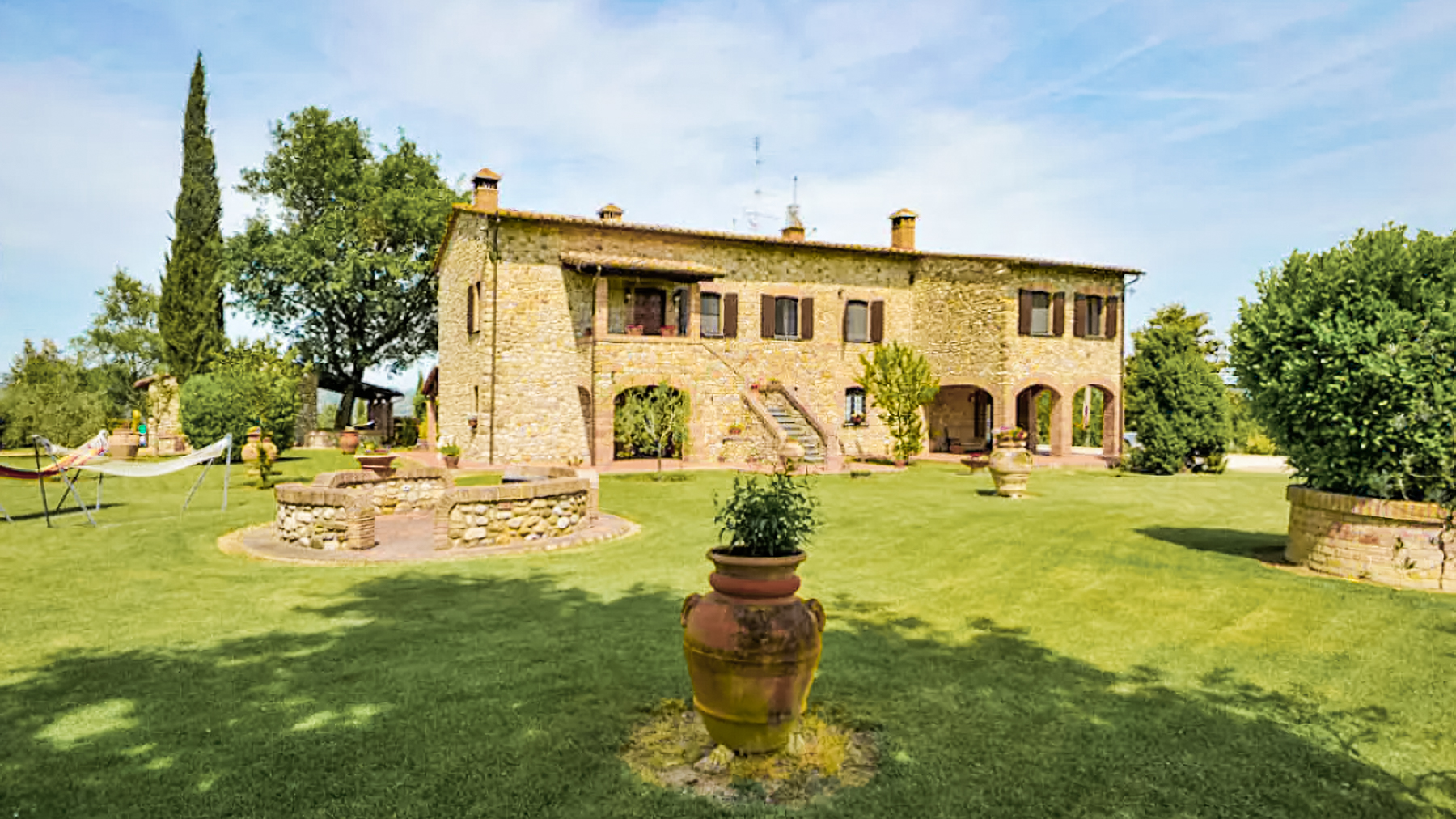 Amidst the serene embrace of the countryside, this enchanting stone farmhouse emerges as a timeless retreat where nature and elegance converge. Imagine the gentle rustle of leaves and the warm glow of sunlight illuminating the rustic facade, inviting you into a world of peace and sophistication. Spanning an impressive 550 square meters, this exquisite property boasts 16 spacious rooms and 6 luxurious bathrooms, providing ample space for family gatherings and elegant entertaining. The home's rustic charm is highlighted by its stone and brick architecture, complete with wooden shutters and a picturesque staircase leading to a private second level. Surrounded by a beautifully maintained garden, the property offers a private oasis with circular stone features, vibrant flowers, and inviting hammocks, perfect for leisurely afternoons. Located in the idyllic Fabro, Provincia di Terni, this residence embodies the essence of countryside living with unparalleled tranquility. Imagine mornings spent sipping espresso on the balcony as the sun rises above the lush landscape, or evenings unwinding in the garden, surrounded by the soft hum of nature. This home offers a lifestyle rich in peace and pleasure, where every moment is an invitation to indulge in the simple joys of rural life. This extraordinary farmhouse is a testament to timeless charm and refined living—a unique opportunity to own a piece of the Italian countryside that promises both luxury and serenity.