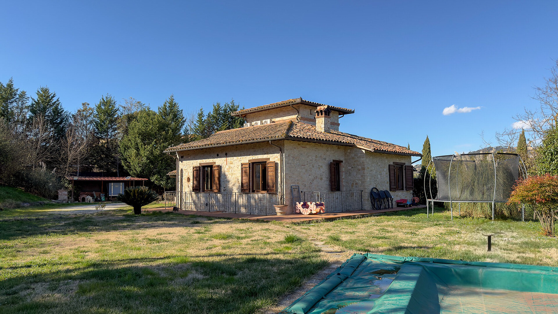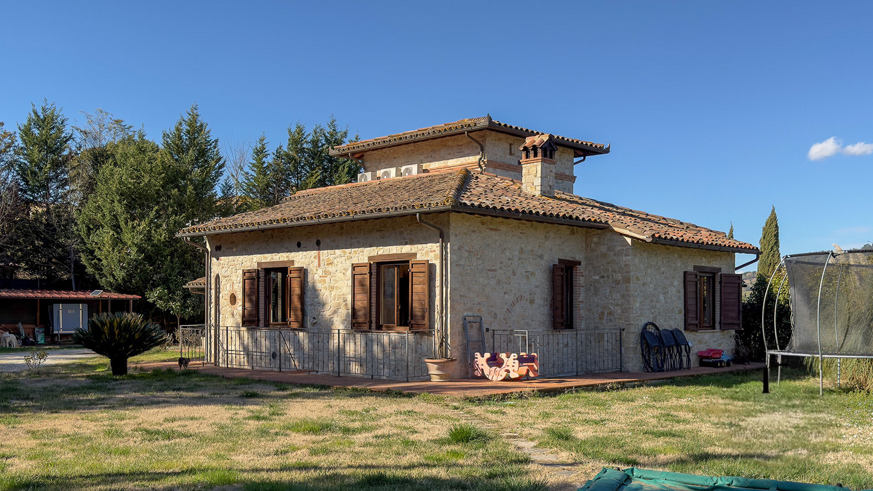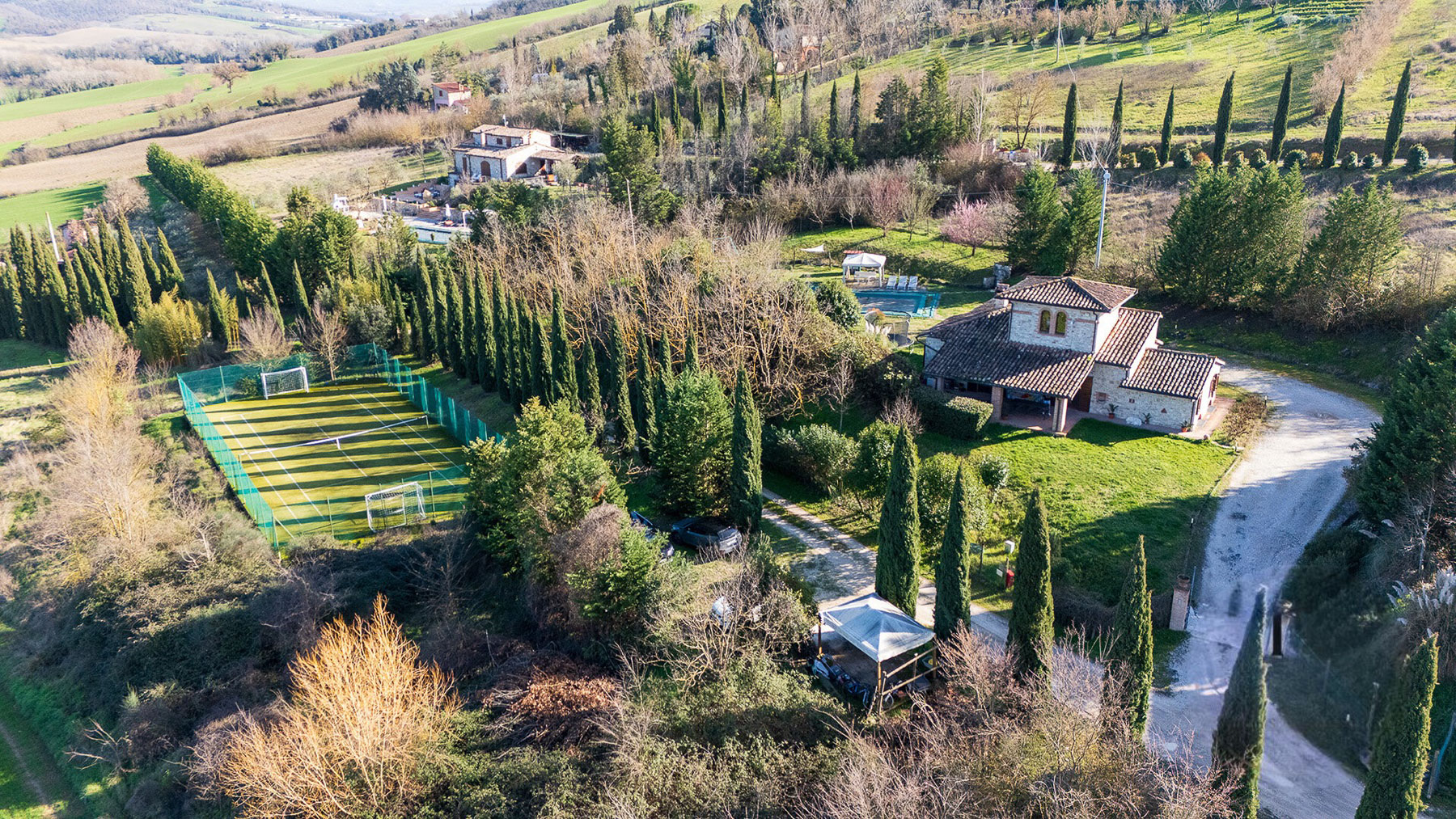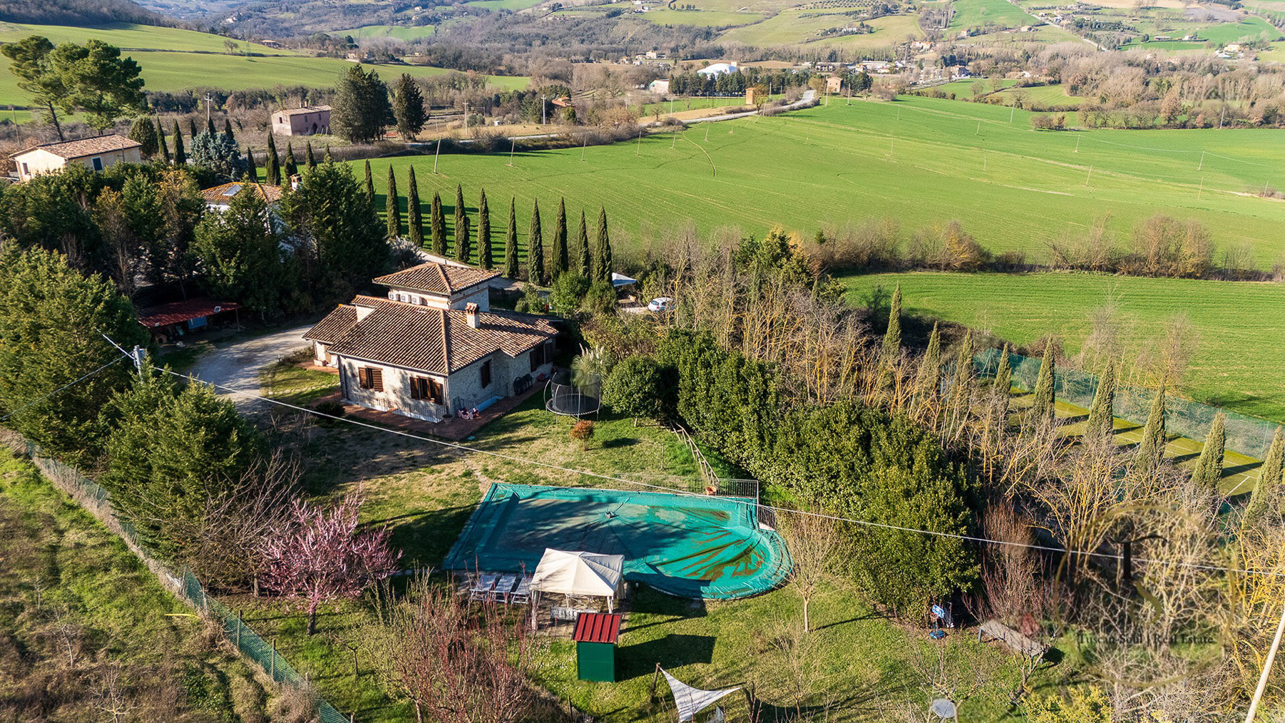 Enveloped in the serenity of the countryside, this exquisite property in Todi, Perugia offers a sanctuary of peace and luxury. Surrounded by lush greenery and open fields, the gentle rustle of leaves and the soft chirping of birds create a harmonious symphony that captivates your senses. The vibrant landscape, dotted with trees and gardens, sets the stage for a life of tranquility and splendor. Spanning 330 square meters, this elegant residence boasts 12 spacious rooms and 3 luxurious bathrooms, providing ample space for relaxation and entertainment. The home features a charming tiled roof and is complemented by a magnificent private garden and a secluded pool, perfect for leisurely swims amidst nature’s embrace. With its well-maintained soccer field and covered swimming pool, the property offers a plethora of outdoor activities. A gravel path leads to the house, where comfort and style converge seamlessly in this countryside retreat. Living here is an invitation to a life enriched by the simple pleasures of rural living. Picture yourself unwinding on the lawn chairs under the gazebo, with the evening sun casting a golden glow over the landscape. Children play joyfully on the trampoline, while the scent of fresh grass and blooming flowers fills the air. This is a place where memories are made, and cherished moments are shared with loved ones. A true embodiment of elegance and comfort, this property stands as a testament to luxurious living in a serene rural setting. It’s not just a home; it’s an experience of refined country living, offering an unparalleled retreat in the heart of nature.