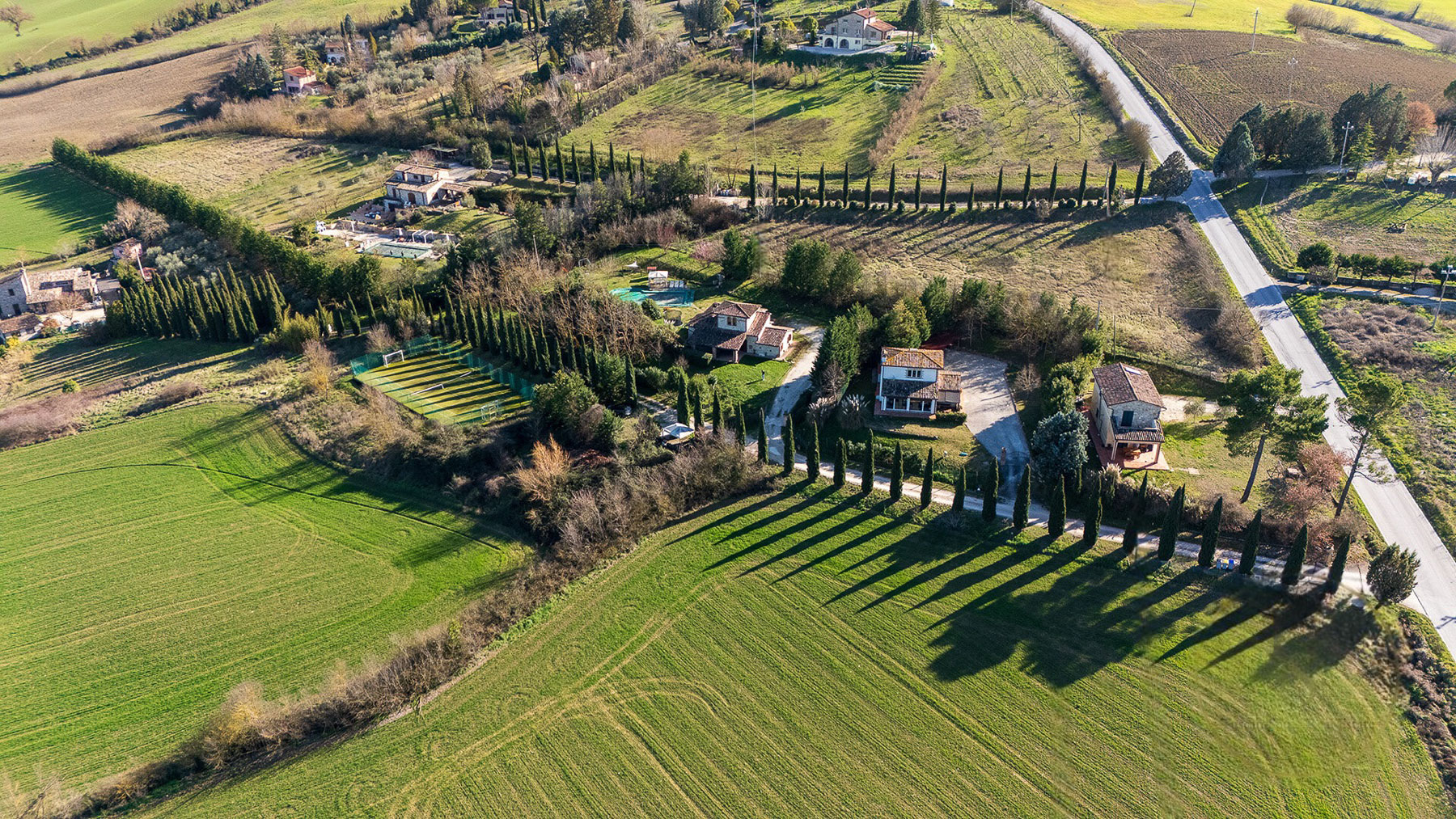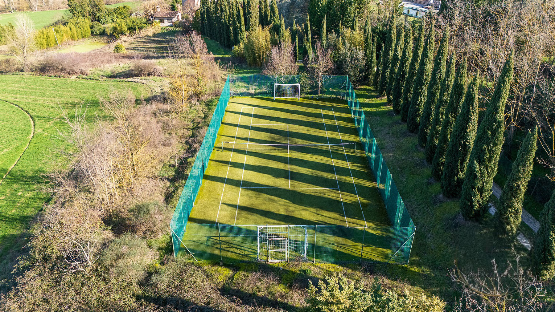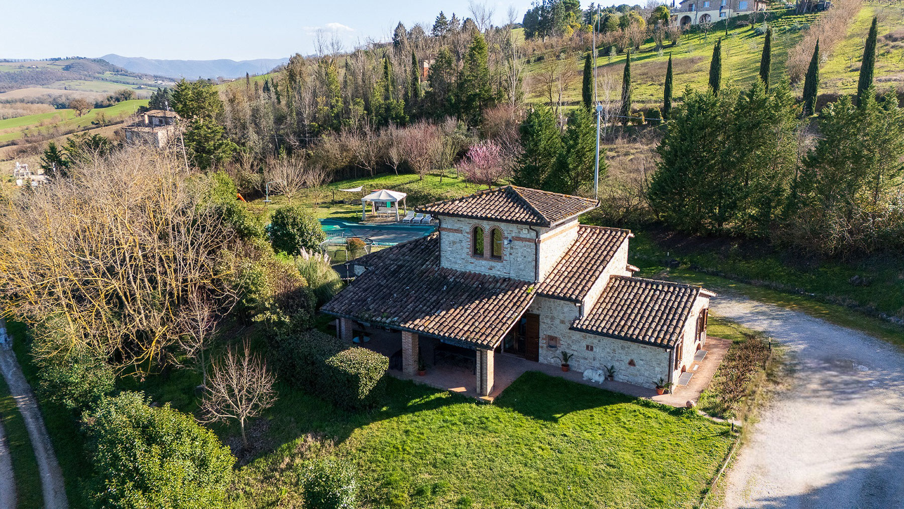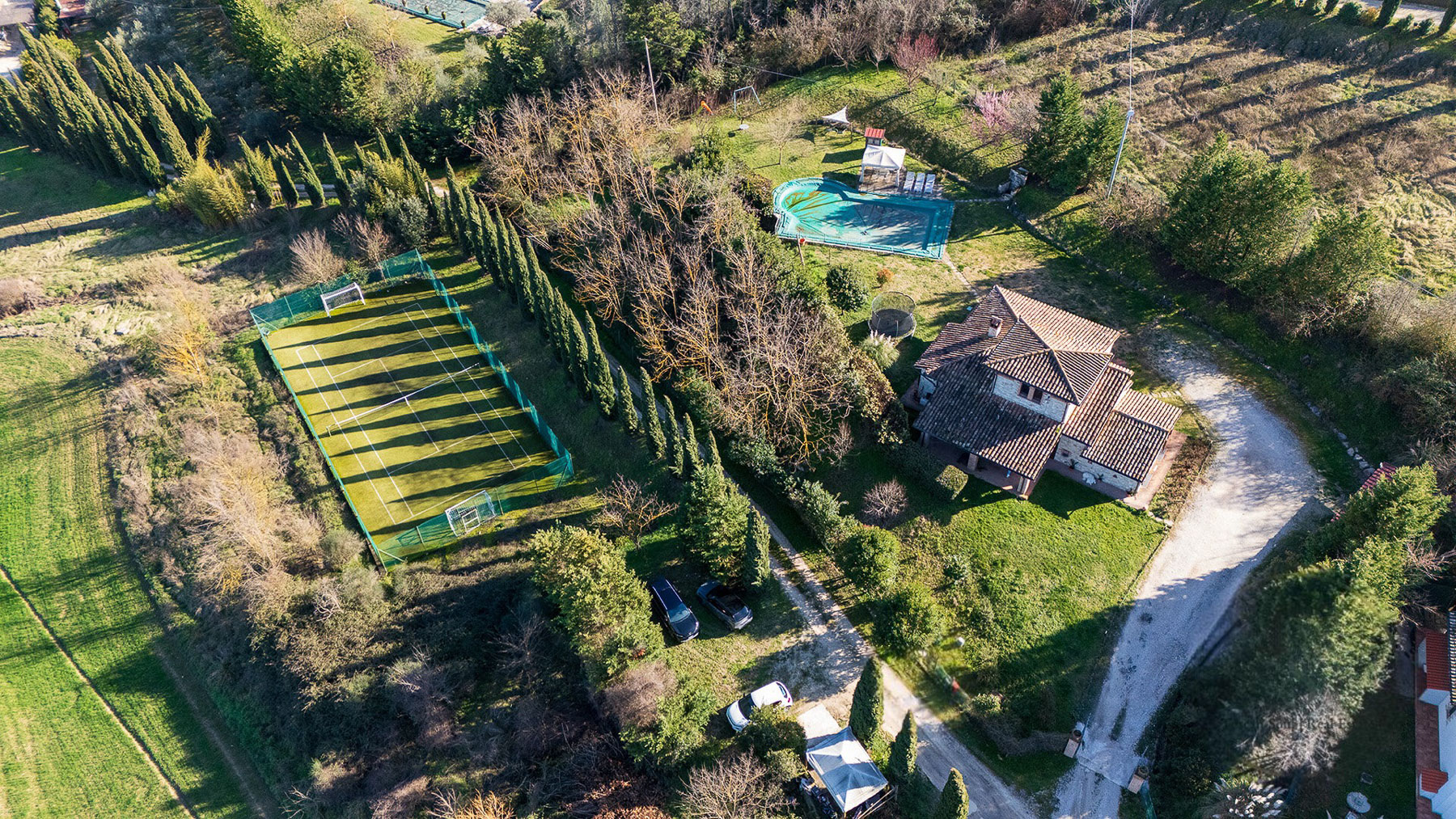 Enveloped in the serenity of the countryside, this exquisite property in Todi, Perugia offers a sanctuary of peace and luxury. Surrounded by lush greenery and open fields, the gentle rustle of leaves and the soft chirping of birds create a harmonious symphony that captivates your senses. The vibrant landscape, dotted with trees and gardens, sets the stage for a life of tranquility and splendor. Spanning 330 square meters, this elegant residence boasts 12 spacious rooms and 3 luxurious bathrooms, providing ample space for relaxation and entertainment. The home features a charming tiled roof and is complemented by a magnificent private garden and a secluded pool, perfect for leisurely swims amidst nature’s embrace. With its well-maintained soccer field and covered swimming pool, the property offers a plethora of outdoor activities. A gravel path leads to the house, where comfort and style converge seamlessly in this countryside retreat. Living here is an invitation to a life enriched by the simple pleasures of rural living. Picture yourself unwinding on the lawn chairs under the gazebo, with the evening sun casting a golden glow over the landscape. Children play joyfully on the trampoline, while the scent of fresh grass and blooming flowers fills the air. This is a place where memories are made, and cherished moments are shared with loved ones. A true embodiment of elegance and comfort, this property stands as a testament to luxurious living in a serene rural setting. It’s not just a home; it’s an experience of refined country living, offering an unparalleled retreat in the heart of nature.