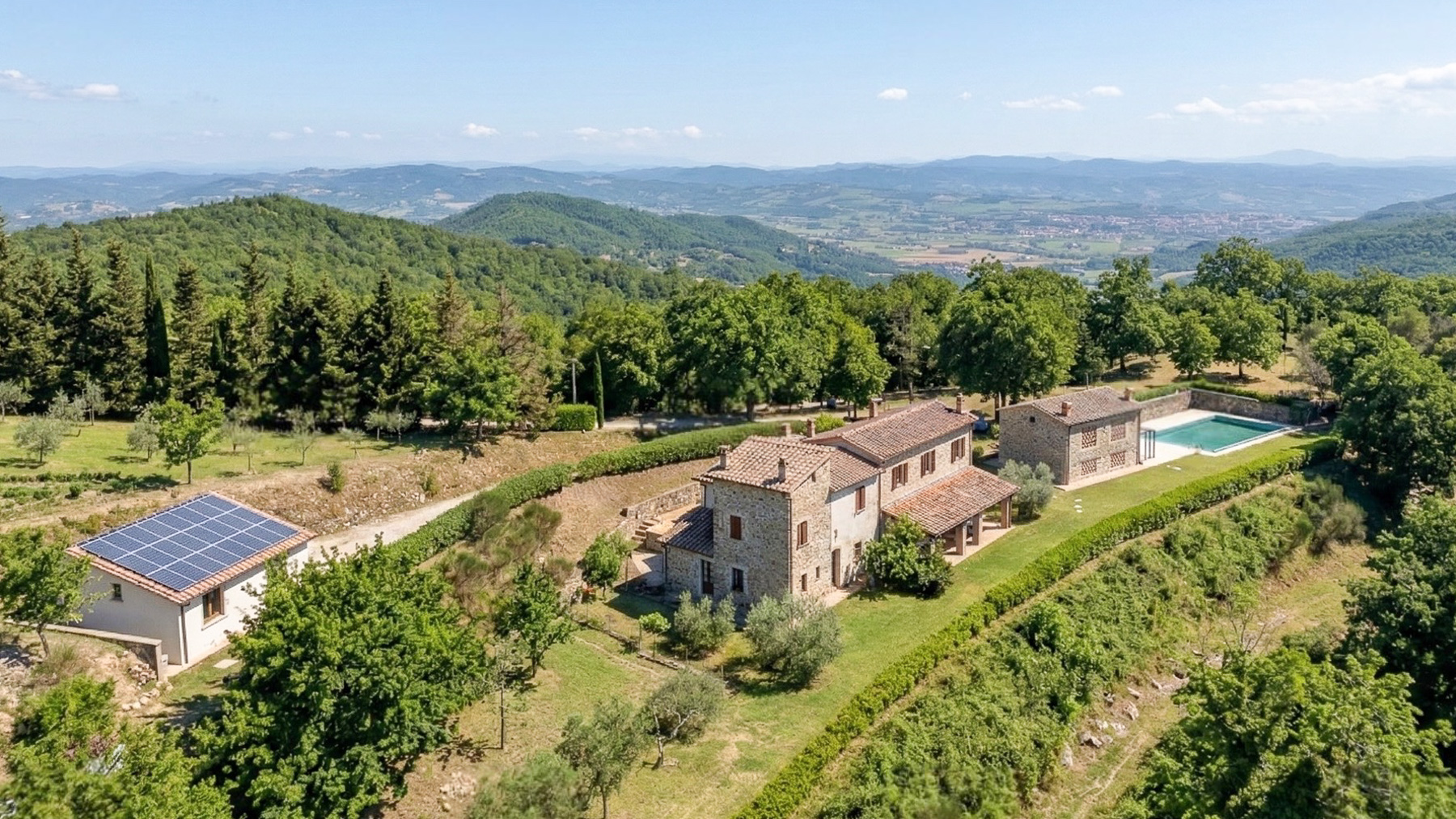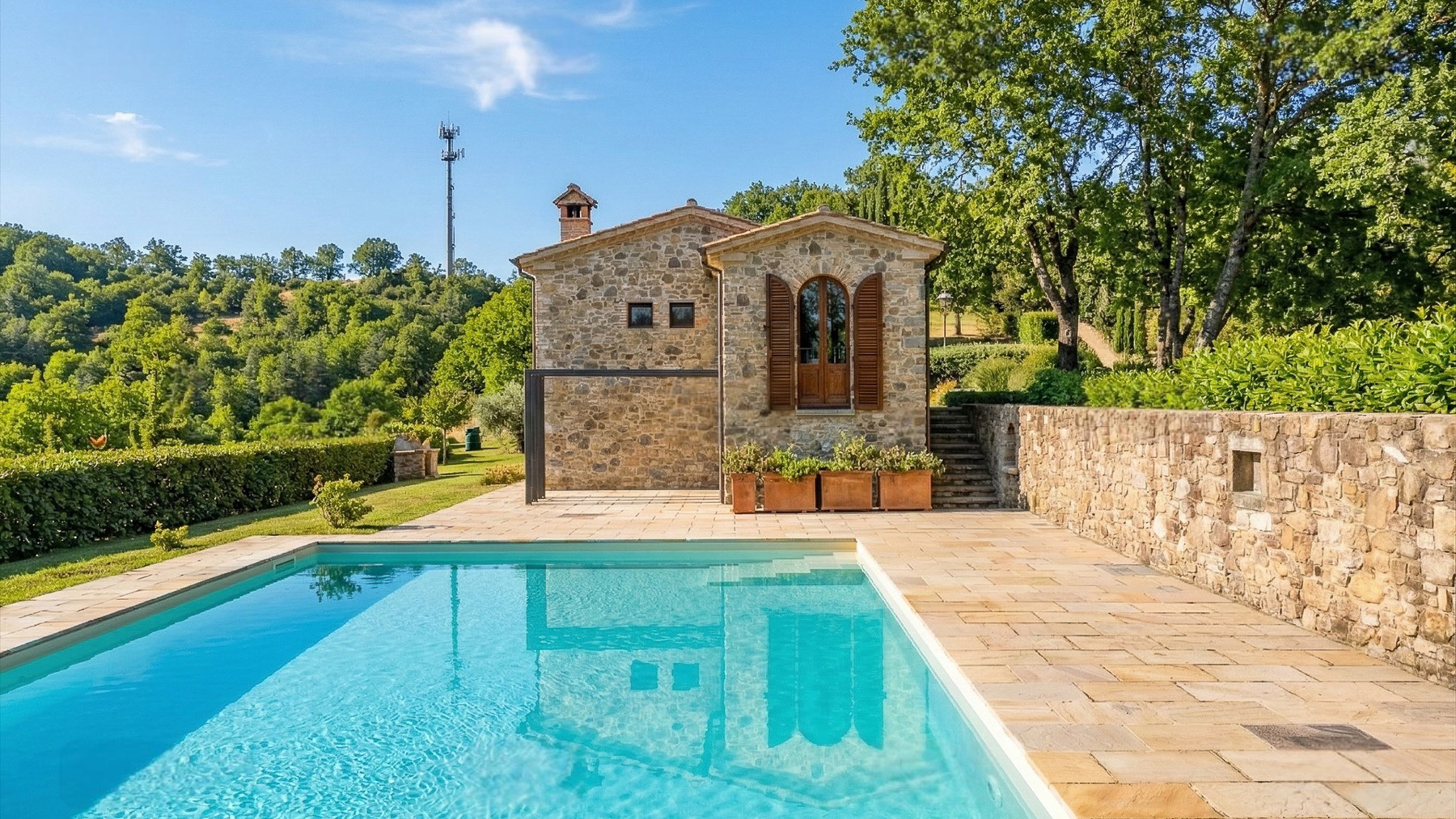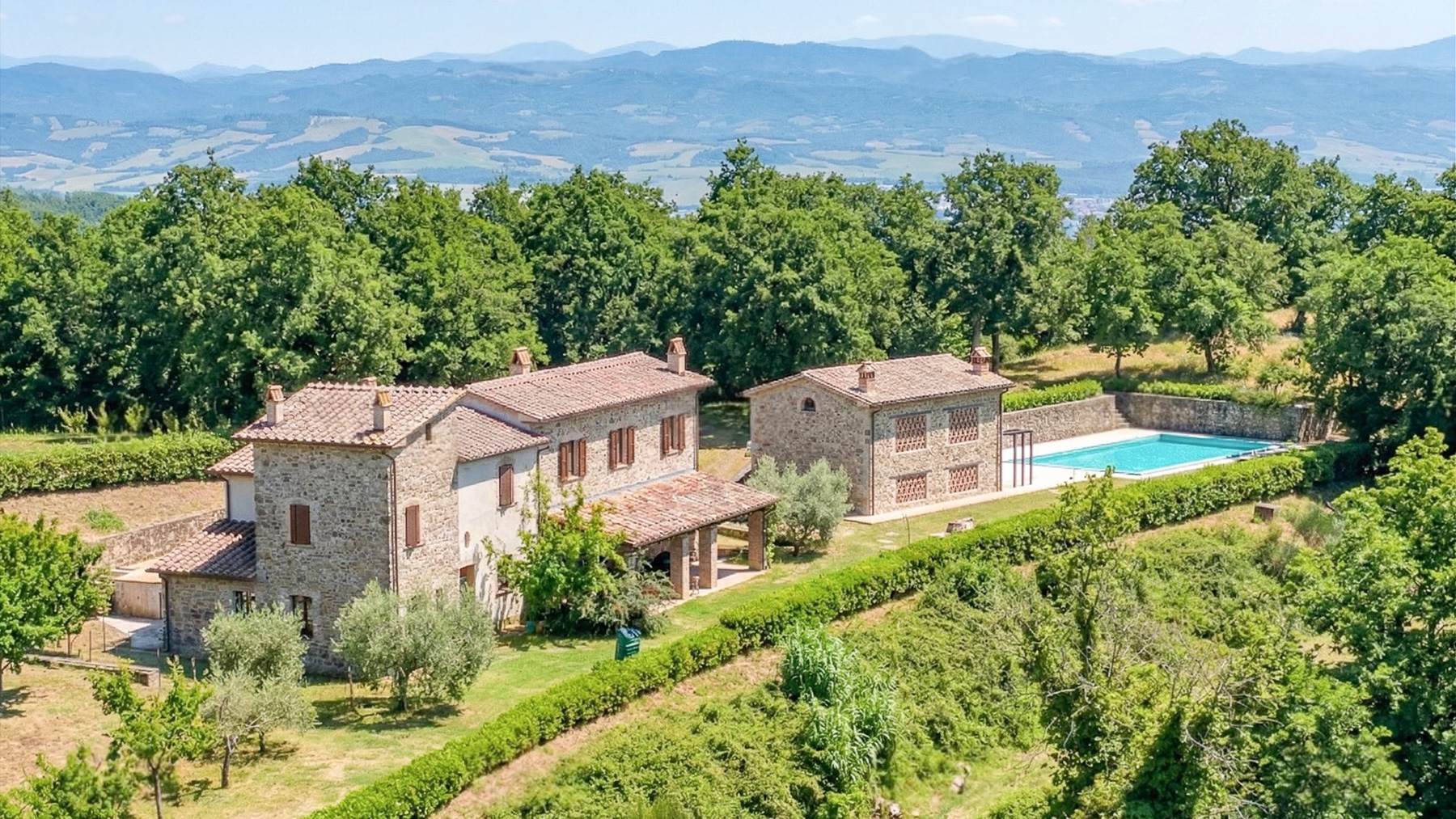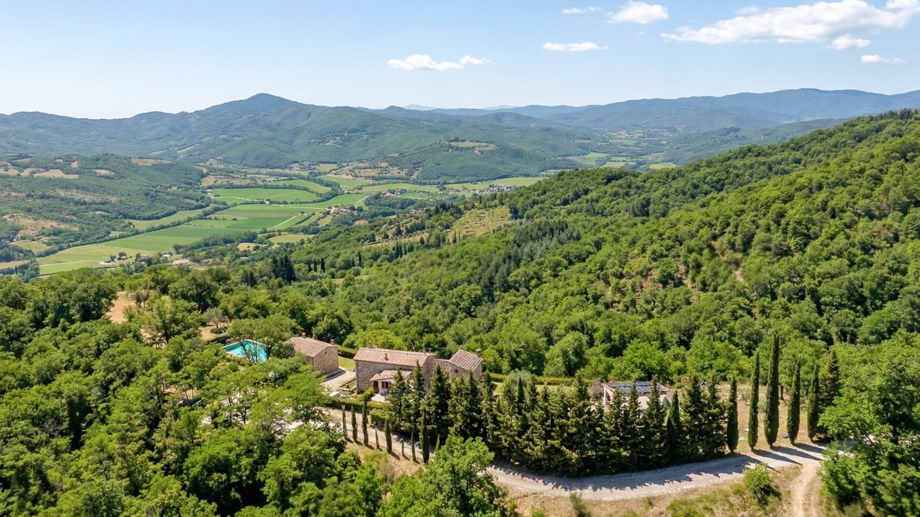 Perched gracefully on a hillside, this exquisite estate is a sanctuary of peace and luxury, enveloped by lush greenery that whispers tranquility. The clear blue sky above complements the rolling hills and verdant landscape, creating a serene panorama that captivates the senses. Spanning 375 square meters, this magnificent property boasts 12 spacious rooms and 7 elegant bathrooms, offering ample space for relaxation and entertainment. The residence features a private garden and a stunning swimming pool, perfect for unwinding in the embrace of nature. Located in the idyllic setting of Umbertide, Perugia, this countryside retreat blends rustic charm with modern sophistication, promising an unparalleled lifestyle. Imagine waking up to the gentle sounds of the countryside, with sunlight streaming through large windows, illuminating the warm, inviting interiors. Evenings can be spent savoring wine by the pool or exploring the nearby historic towns, enriching your daily life with culture and beauty. This property is a masterpiece of elegance and comfort, offering a rare blend of privacy and luxury—a true treasure in the heart of Italy's enchanting landscape.