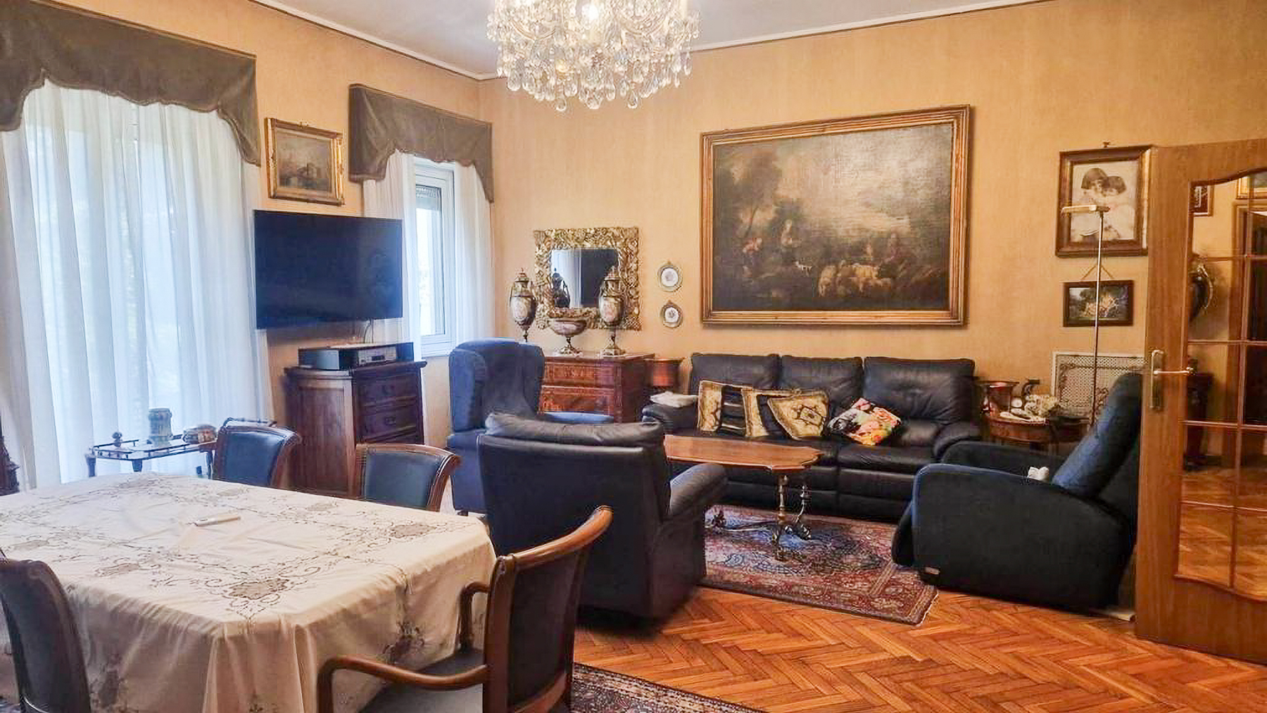 In the heart of Milan, where history and modernity intertwine, lies an exquisite residence that promises a world of elegance and sophistication. Imagine stepping into a space that welcomes you with the gentle glow of sunlight filtering through large windows, casting a warm embrace over the classic interiors. The scent of polished wood and the soft rustle of white curtains create a serene backdrop to your daily life. Spanning 187 square meters, this remarkable property boasts five spacious rooms and two luxurious bathrooms. The living and dining areas are a testament to refined taste, featuring a table adorned with a delicate tablecloth, surrounded by intricately carved wooden chairs. A vintage chandelier casts an opulent glow over the room, harmonizing with the large cabinet that proudly displays exquisite artifacts. The elegance extends to the exterior with its classical architecture, where ornate balconies and doorways echo the grandeur of Milan's past, while modern urban views add a contemporary contrast. Living here is an experience like no other. Picture yourself in a tranquil retreat amidst the city's vibrant pulse. Each morning, the natural light that bathes your home invigorates your senses, while evenings are reserved for quiet reflections, surrounded by timeless beauty. The charm of the city and the comfort of your abode create a perfect balance, offering a lifestyle of unparalleled luxury. This residence is more than a home; it is a statement of prestige and a testament to timeless elegance—a rare gem in Milan's luxury real estate market. Embrace the opportunity to own a piece of this enchanting city.