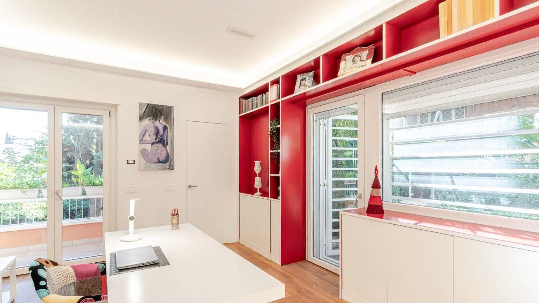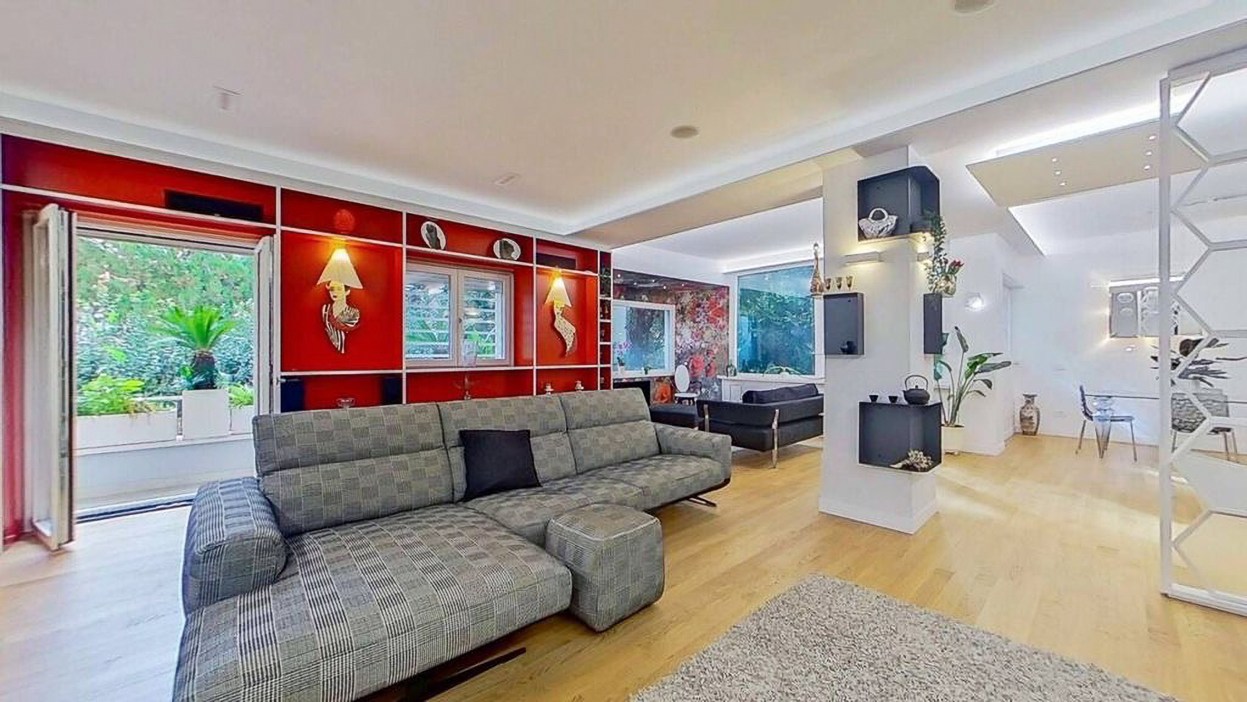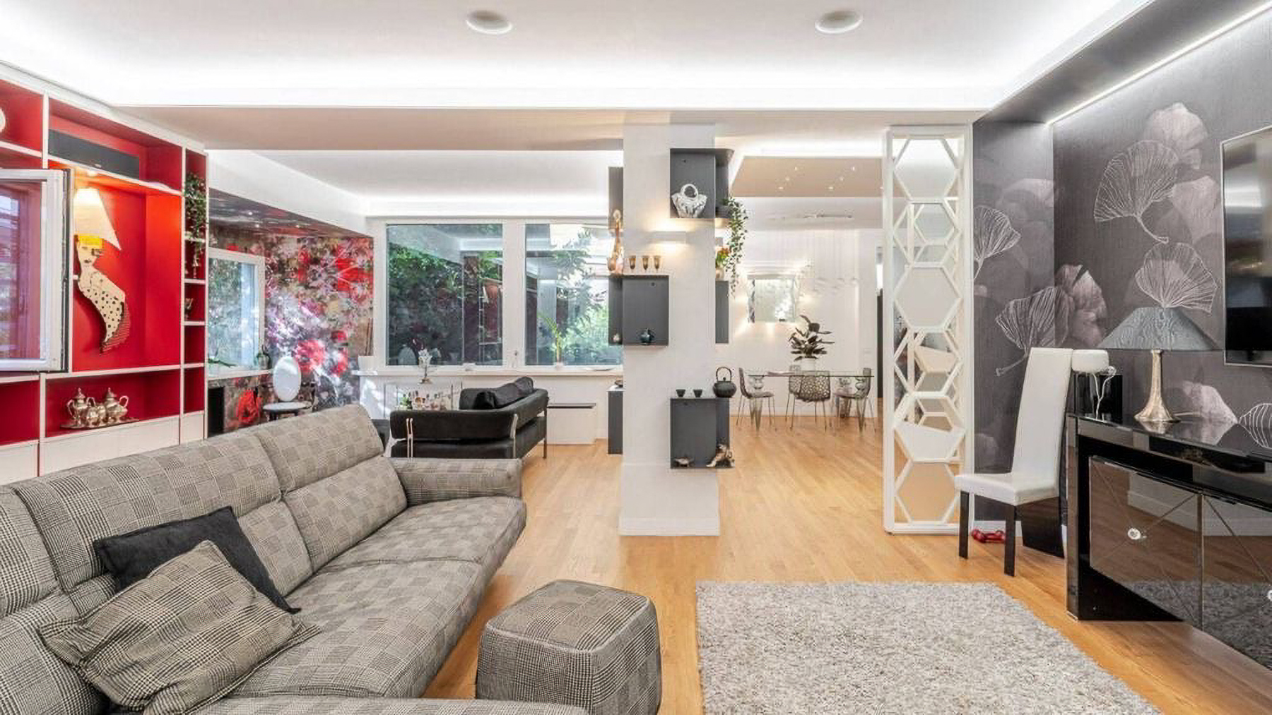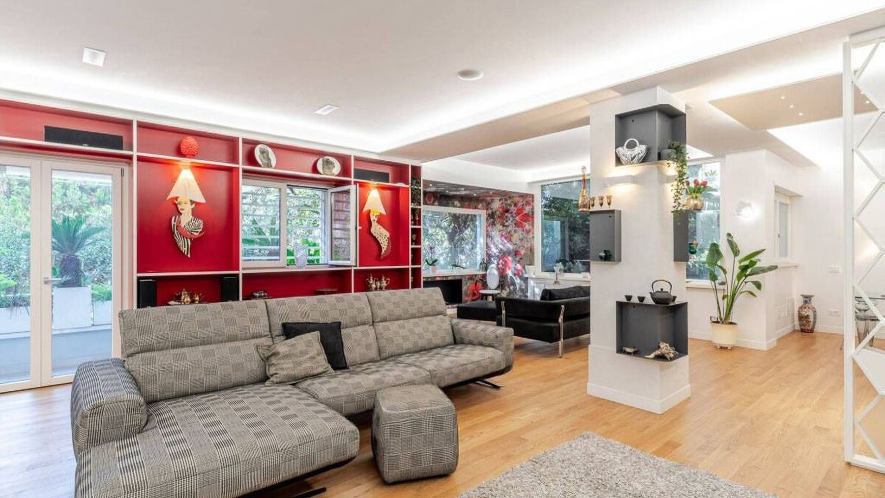 Envision a contemporary sanctuary where modern design meets serene surroundings. Bathed in natural light, this exquisite living space invites you into a world of elegance with large windows offering verdant views. The gentle hum of the city outside enhances the peaceful ambiance, creating an inviting retreat in the heart of bustling Rome. This stunning 171 square meter property boasts five spacious rooms and three luxurious bathrooms, seamlessly blending style and comfort. The open layout connects the chic living area with a sophisticated dining space, perfect for entertaining. Distinctive features such as a generous terrace offer the ideal spot for morning coffees or evening gatherings. Located in the vibrant city of Rome, this home epitomizes urban living with a touch of tranquility. Experience the joy of city life from the comfort of your own private oasis. Picture yourself unwinding on the checkered sectional sofa, surrounded by artistic décor and subtle lighting that creates a cozy yet vibrant environment. The terrace beckons for alfresco dining, where you can savor a meal under the stars, immersed in the city's charm. This exclusive residence is a testament to refined living, offering a rare blend of contemporary design and artistic flair. A true masterpiece in the luxury real estate market, it promises an unparalleled lifestyle in one of the world's most iconic cities.