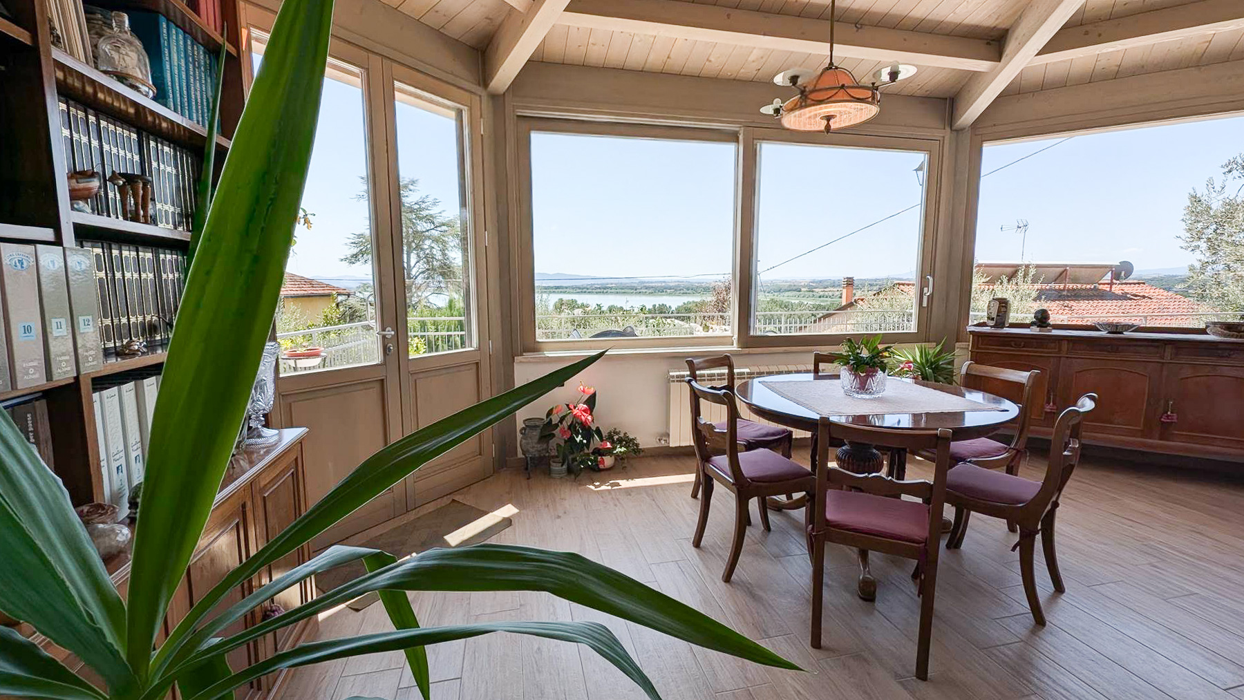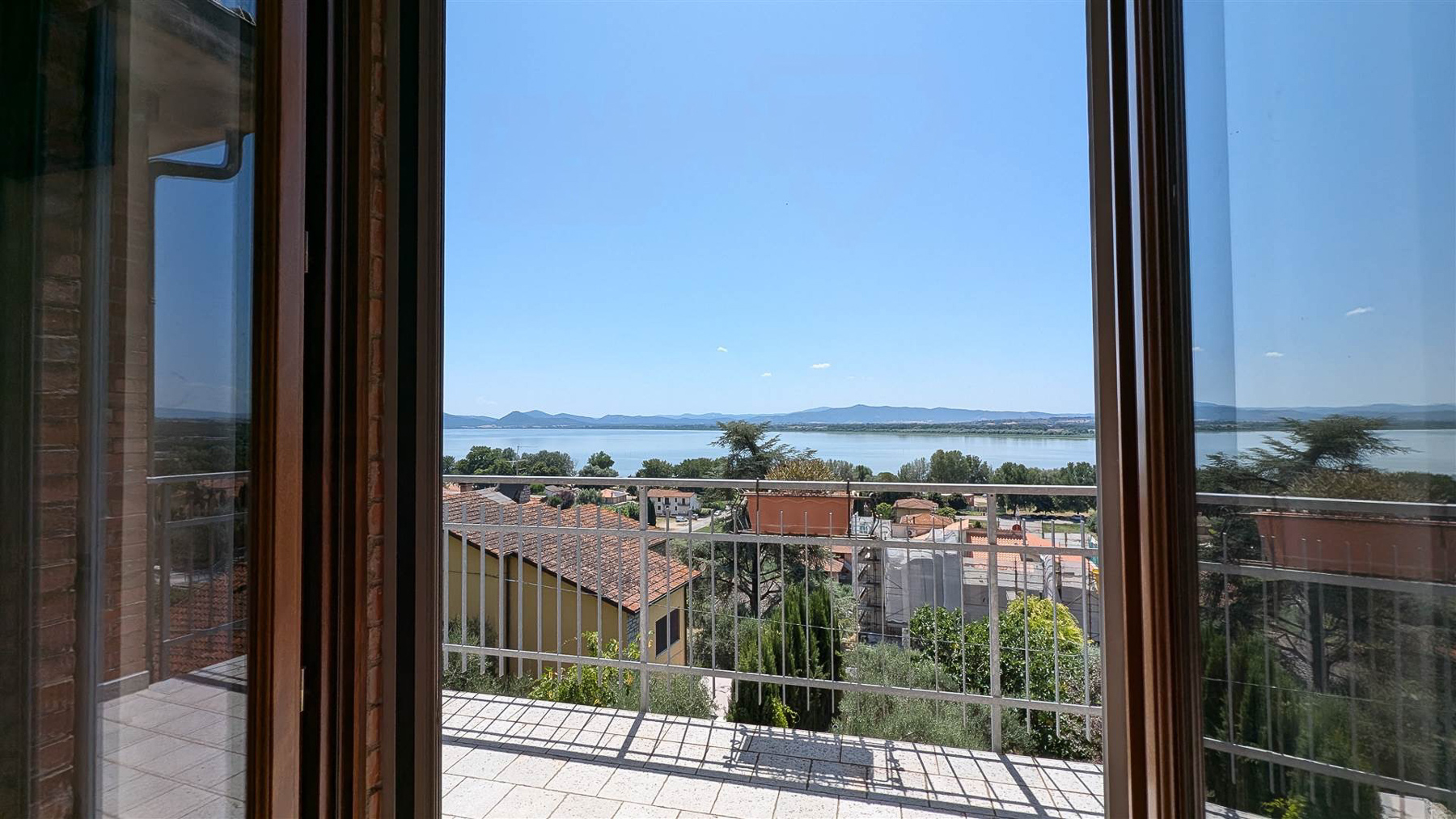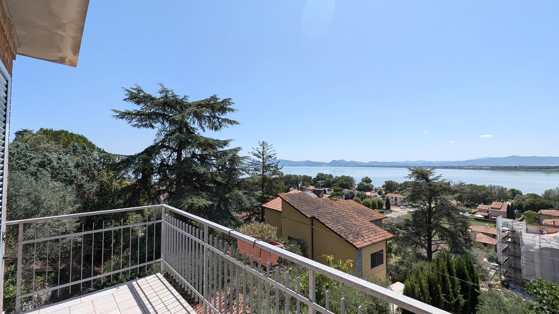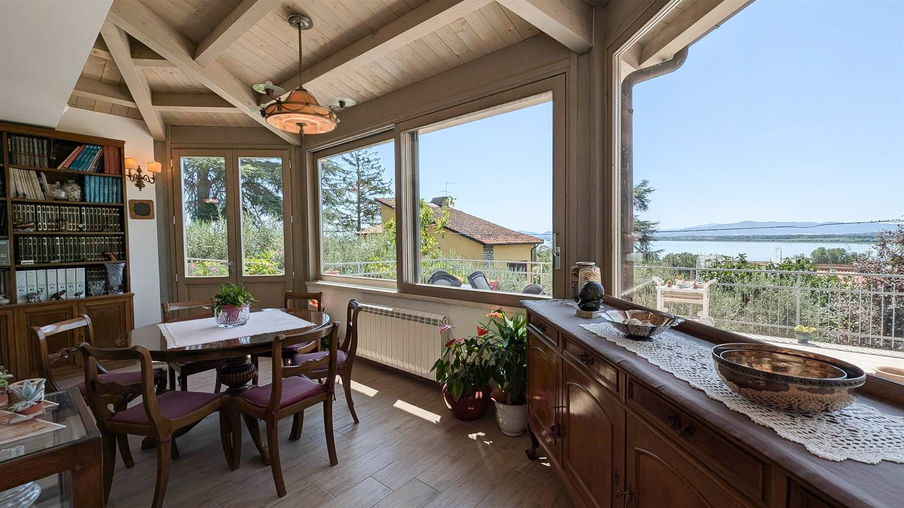 Perched on the edge of Lake Trasimeno, this independent villa offers a serene escape where the gentle breeze carries the scent of olive trees, and the sun's rays dance across the water. Located just a short stroll from the historic center, this property embraces the charm and tranquility of its picturesque surroundings. Spanning approximately 232 sqm across three levels, this villa boasts seven rooms and three bathrooms. The ground floor features a delightful veranda dining area, a spacious kitchen, and a living room that opens onto a stunning 100 sqm panoramic terrace. On the first floor, two double bedrooms with study spaces and a bathroom with a jacuzzi provide comfort and privacy. The second floor's large living room, complete with a fireplace, offers breathtaking views, while an additional bedroom and bathroom ensure ample space for relaxation. With terraces overlooking the lake and a beautifully terraced 500 sqm garden, this property is a true gem in Castiglione del Lago, Provincia di Perugia. Living here means enjoying leisurely afternoons in the verdant garden, surrounded by the whispers of olive leaves. Picture yourself savoring evening meals on the expansive terrace, with the shimmering waters of Lake Trasimeno as your backdrop. This villa is designed for those who cherish both tranquility and elegance. This property is a testament to refined living, where timeless elegance meets contemporary comfort. An exclusive retreat that offers a lifestyle of unparalleled beauty and grace—truly a rare find in the luxury real estate market.