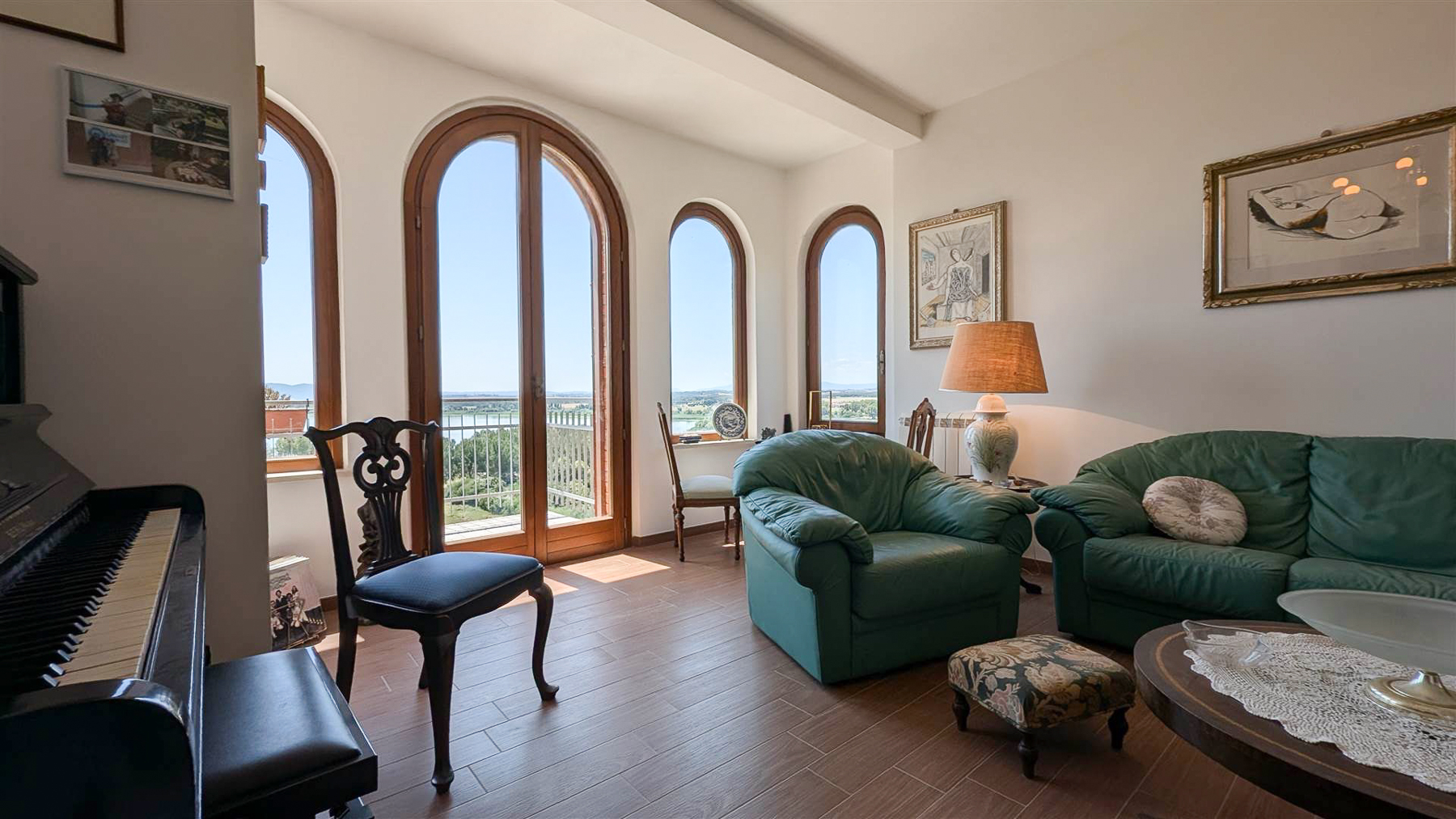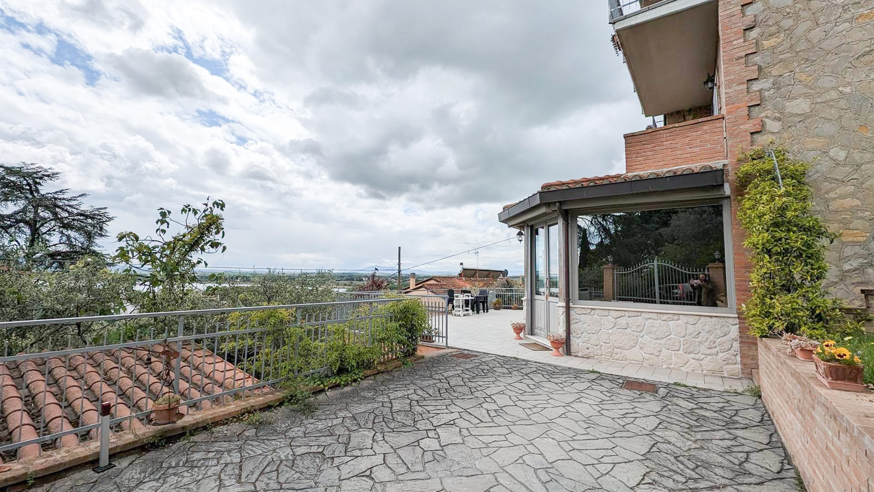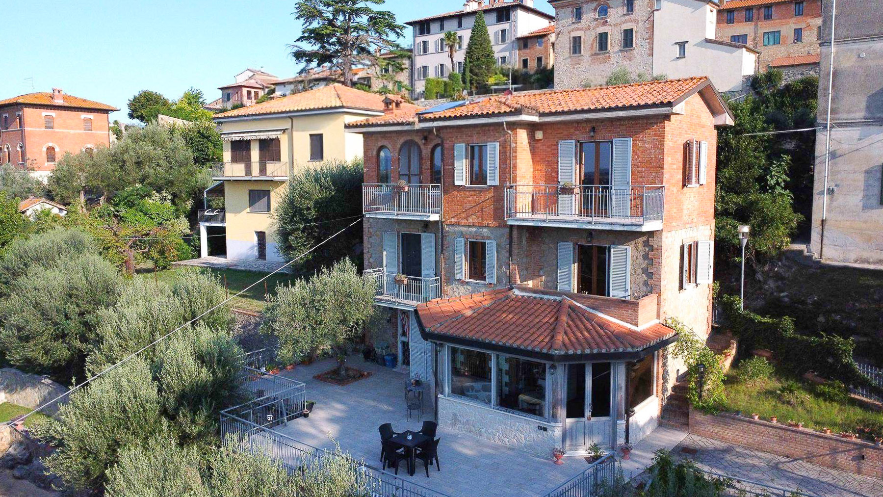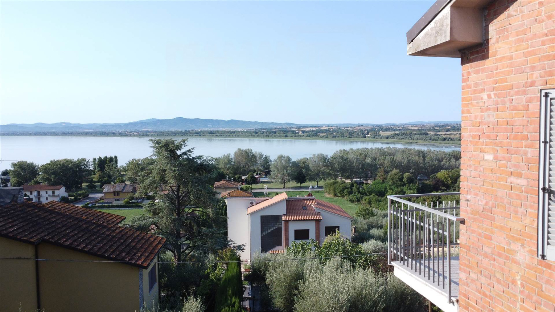 Perched on the edge of Lake Trasimeno, this independent villa offers a serene escape where the gentle breeze carries the scent of olive trees, and the sun's rays dance across the water. Located just a short stroll from the historic center, this property embraces the charm and tranquility of its picturesque surroundings. Spanning approximately 232 sqm across three levels, this villa boasts seven rooms and three bathrooms. The ground floor features a delightful veranda dining area, a spacious kitchen, and a living room that opens onto a stunning 100 sqm panoramic terrace. On the first floor, two double bedrooms with study spaces and a bathroom with a jacuzzi provide comfort and privacy. The second floor's large living room, complete with a fireplace, offers breathtaking views, while an additional bedroom and bathroom ensure ample space for relaxation. With terraces overlooking the lake and a beautifully terraced 500 sqm garden, this property is a true gem in Castiglione del Lago, Provincia di Perugia. Living here means enjoying leisurely afternoons in the verdant garden, surrounded by the whispers of olive leaves. Picture yourself savoring evening meals on the expansive terrace, with the shimmering waters of Lake Trasimeno as your backdrop. This villa is designed for those who cherish both tranquility and elegance. This property is a testament to refined living, where timeless elegance meets contemporary comfort. An exclusive retreat that offers a lifestyle of unparalleled beauty and grace—truly a rare find in the luxury real estate market.