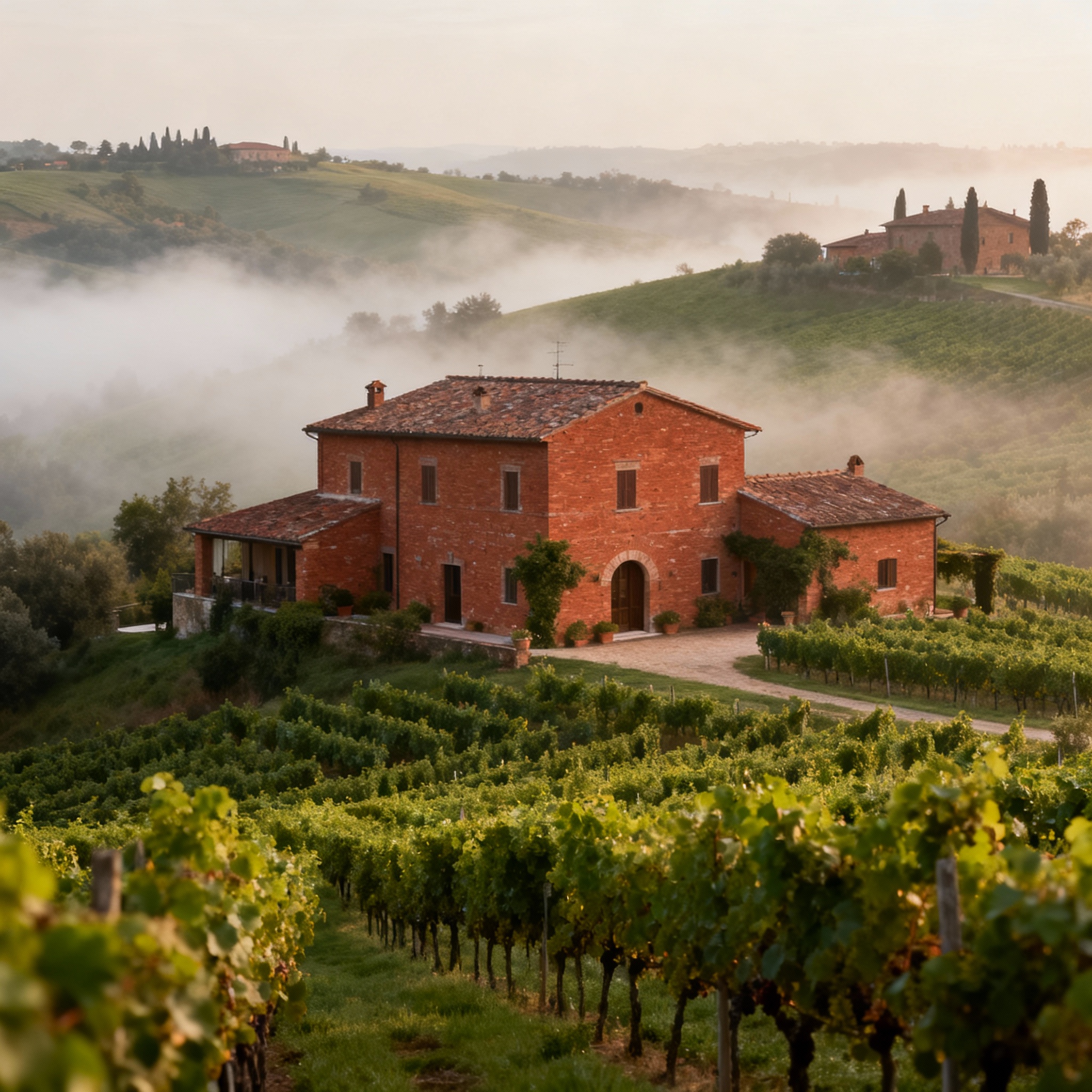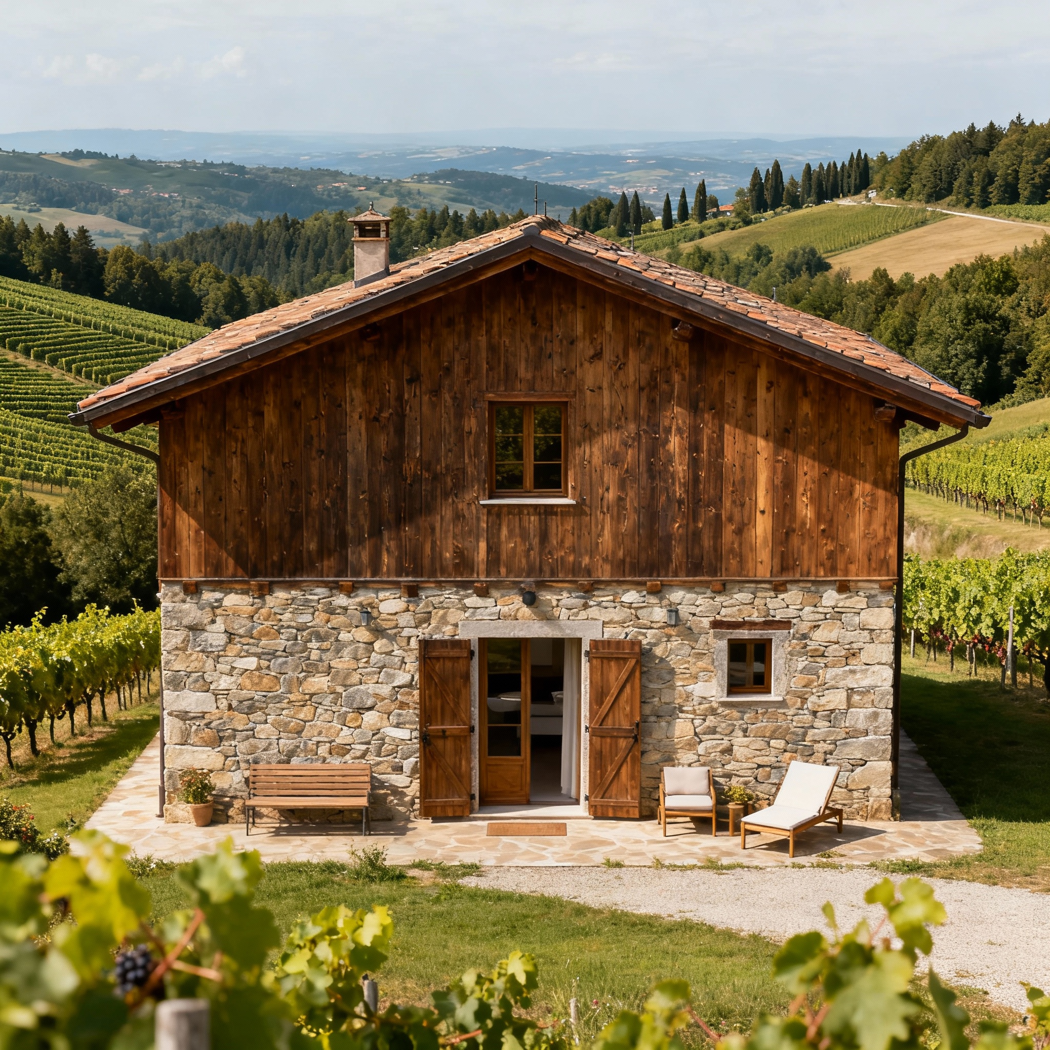 Rustic properties immersed in greenery, nestled among hills and vineyards.