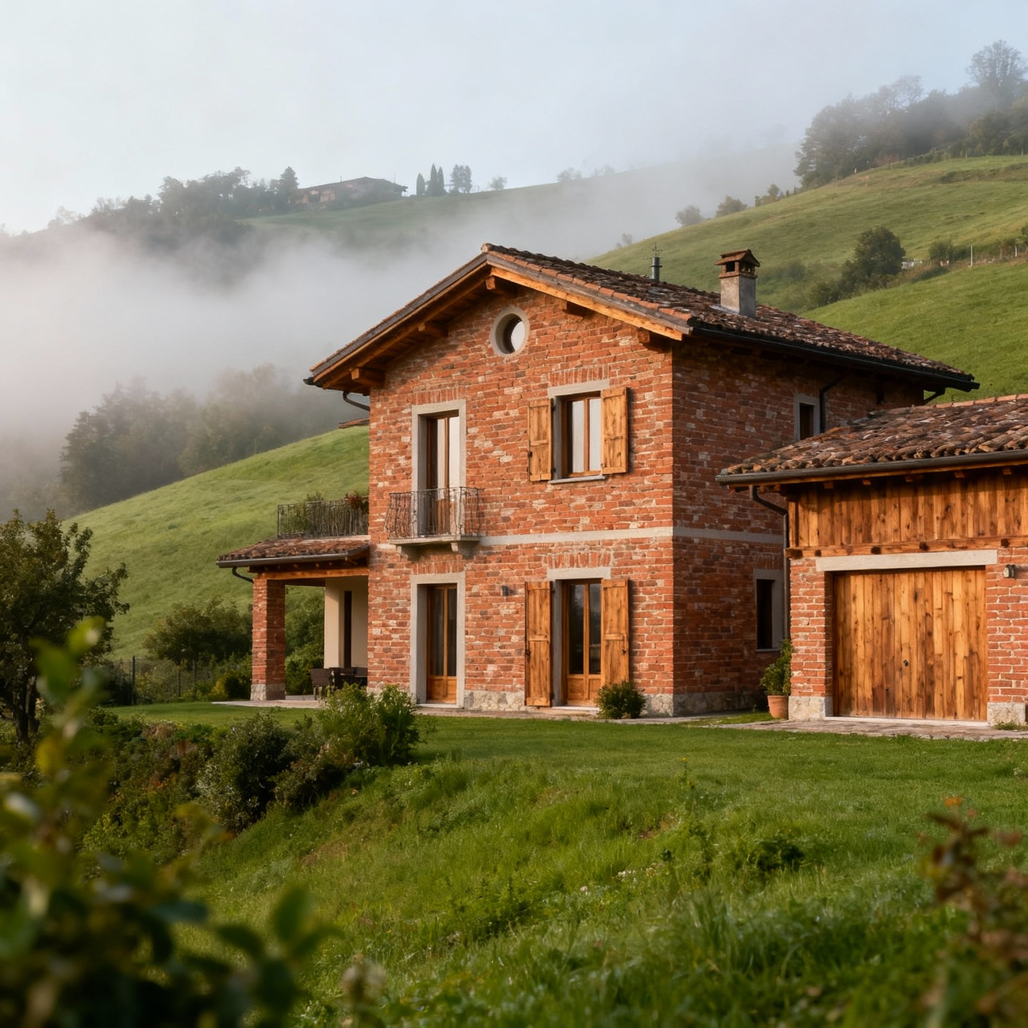 Rustic properties set in the Piedmont countryside, with a view of the hills.