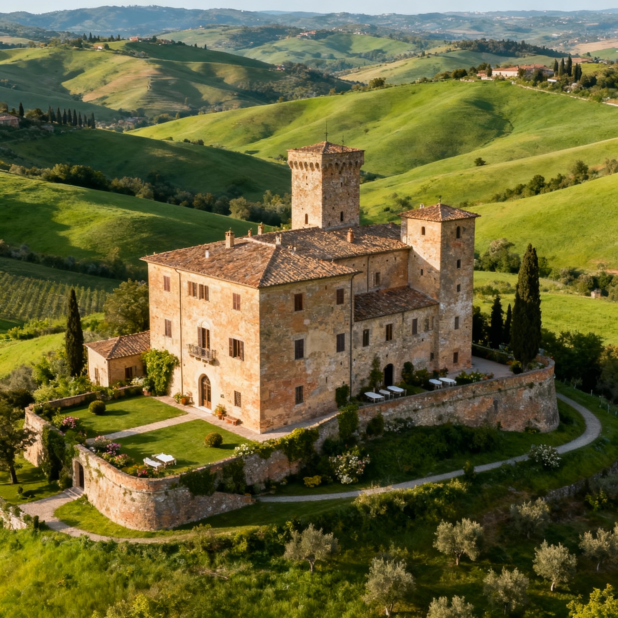 Majestic castles rise among the Tuscan hills, offering a perfect blend of history and luxury. These estates, featuring grand towers and Italian gardens, promise a dream lifestyle in an exclusive and enchanting setting.
