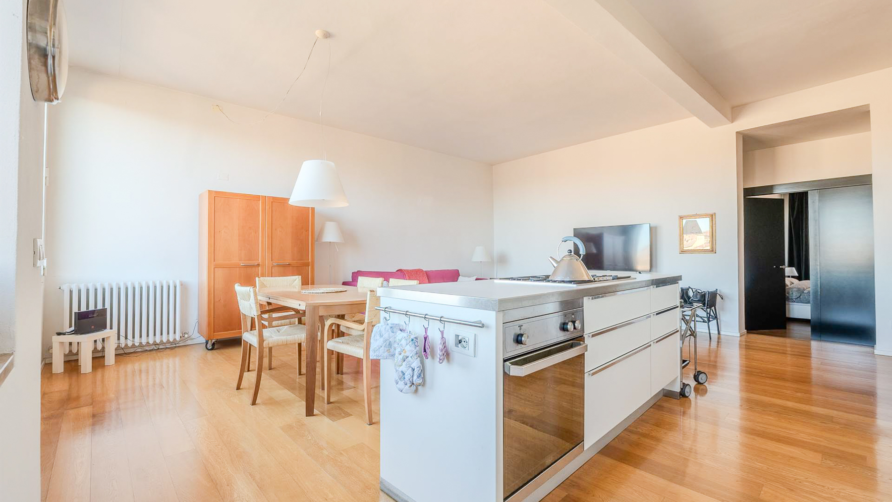 Nel cuore pulsante del centro storico di Siena, questo appartamento panoramico accoglie i suoi ospiti con una vista mozzafiato su San Domenico e i pittoreschi tetti della città. Immagina di inondare la tua casa con la luce del sole che penetra dalle ampie vetrate, mentre respiri l'aria antica e nobile di uno dei quartieri più affascinanti di Siena. Con una superficie di 165 metri quadrati, l’appartamento si sviluppa armoniosamente su sette stanze, offrendo ampi spazi per la vita quotidiana. La zona giorno si distingue per la sua cucina moderna con isola, perfetta per chi ama cucinare e intrattenere, mentre due spaziose camere matrimoniali garantiscono comfort e tranquillità. Un elegante bagno finestrato, con doccia parzialmente in muratura, e un pratico ripostiglio/lavanderia completano il piano principale. Una scala interna conduce alla mansarda, un ambiente versatile con due finestre panoramiche e un ulteriore bagno, ideale per creare una terza camera, uno studio o uno spazio hobby. Vivere in questa proprietà significa immergersi in un'esperienza residenziale unica, dove il fascino storico si fonde con il moderno comfort. Ogni dettaglio è curato per elevare il tuo stile di vita: dai pavimenti in rovere che donano calore agli ambienti, alla mansarda che offre infinite possibilità di personalizzazione. Goditi la serenità di un ambiente elegante, sapientemente ristrutturato. Questa dimora rappresenta un'opportunità irripetibile per chi cerca un equilibrio tra tradizione e modernità nel cuore di Siena. Un rifugio esclusivo, dove ogni giorno è un invito a vivere con stile e raffinatezza.