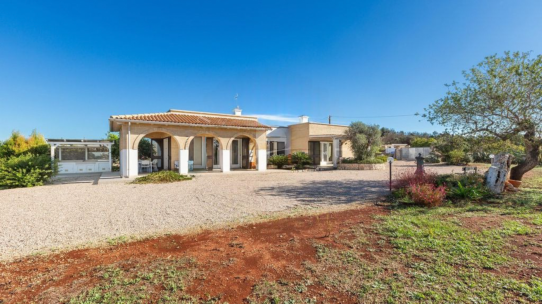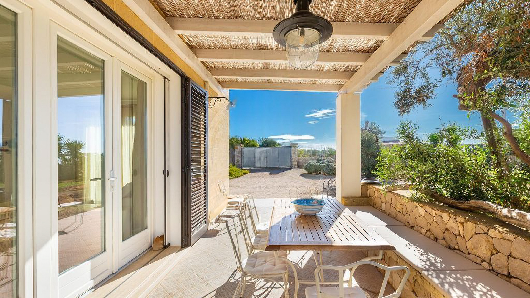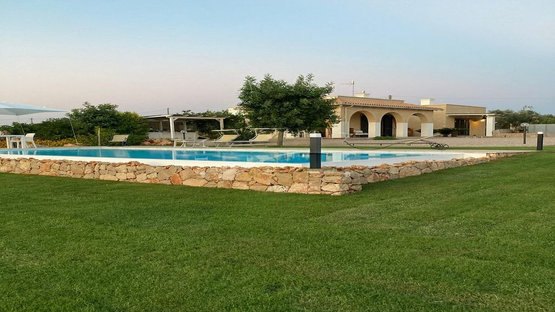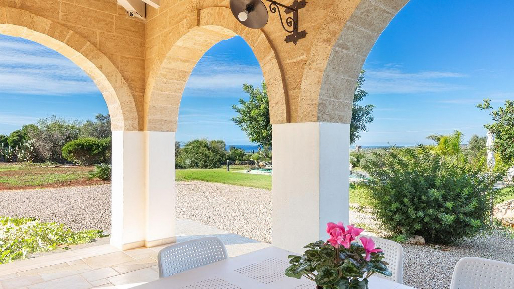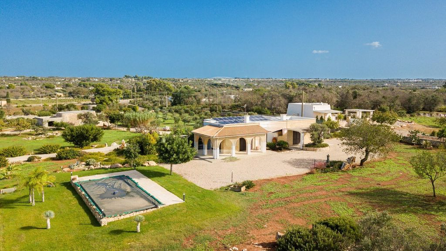 Immersa in un rigoglioso giardino di 11.000 mq completamente recintato da muretti in pietra a secco, questa proprietà ospita anche un Lamione di 55 mq da ristrutturare. La villa, arricchita da rivestimenti in pietra viva tipici del Salento, è magnificamente illuminata dal sole in tutte le stagioni, grazie alle ampie e luminose vetrate che affacciano sul giardino con incantevole vista mare. Interamente sviluppata al piano terra, la villa ospita 3 camere da letto, 2 bagni, 2 ripostigli, un ampio living con zona relax e una grande cucina moderna dotata di isola centrale in marmo. Da qui, la vista corre sulla splendida piscina a sfioro vista mare di 40 mq, che domina questo scenario da favola. Grazie a un progetto appositamente realizzato che ha incluso un uso sapiente di mobili e colori, gli ambienti interni si rispecchiano perfettamente in quelli esterni, creando una perfetta armonia. Esternamente, la proprietà offre ampi spazi attrezzati che consentono di scegliere dove trascorrere momenti di tranquillità, immersi nella quiete del giardino. Tra questi, degni di nota sono le zone delle terrazze: un grande porticato ombreggiato con bamboo e un porticato angolare dotato di tegole, ideali per piacevoli rinfreschi al calar del sole. Il giardino, arricchito da arbusti mediterranei, alberi ad alto fusto, erbe aromatiche, un agrumeto, un piccolo vigneto e 100 ulivi di recente piantumazione, ospita anche una meravigliosa zona piscina, dedicata al benessere esclusivo, con prato inglese, area solarium attrezzata, zona ombreggiata e una cucina esterna con griglia. La piscina è predisposta per l'inserimento di un chiller, permettendo l'uso anche nei periodi più miti. Per ospitare amici e familiari, il Lamione può essere ristrutturato e adibito a dependance. La proprietà, allacciata alla rete idrica pubblica, vanta un impianto fotovoltaico da 6.5 kW, pannelli solari per la produzione di acqua calda sanitaria, un pozzo artesiano, impianto di fitodepurazione, impianto di irrigazione automatizzato e illuminazione esterna. La sicurezza è garantita da un impianto d'allarme, videosorveglianza con telecamere, un cancello automatico principale e uno secondario.